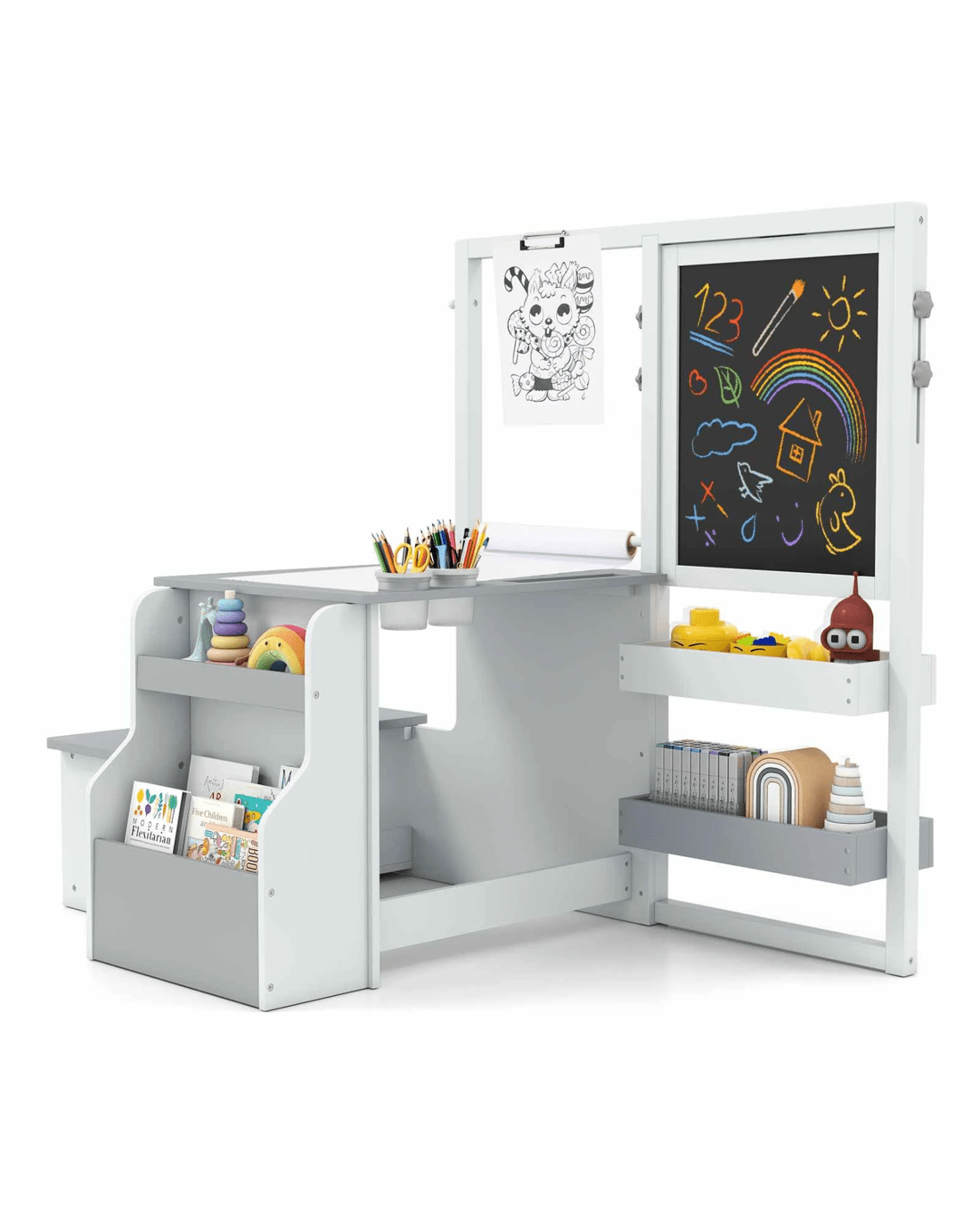 This little ones art center has 360-degree play for multiple little ones to use at the same time. The multifunctional art table & chair set offers a versatile and fun space for users aged 3+ years old. The double-sided art easel has a practical whiteboard and a chalkboard for creative drawing. Height-adjustable design makes it suitable for little ones of different ages. The wide bench provides a comfortable resting spot for your little ones to sit beside the table to read, write or eat. Besides, it features 2 placing trays, 1 handy hanging hook, 1 under bench compartment and 1 bookshelf, encouraging little ones to learn to well organize different stuff and develop good habits of timely storage. Additionally, the art center includes rich art supplies, such as 5 chalks, 2 markers, 2 paint cups, 1 dry eraser and 1 replaceable paper roll. Our art table & chair set ensures outstanding security and reliability. And smooth surface is super easy to wipe clean, saving your time and effort.