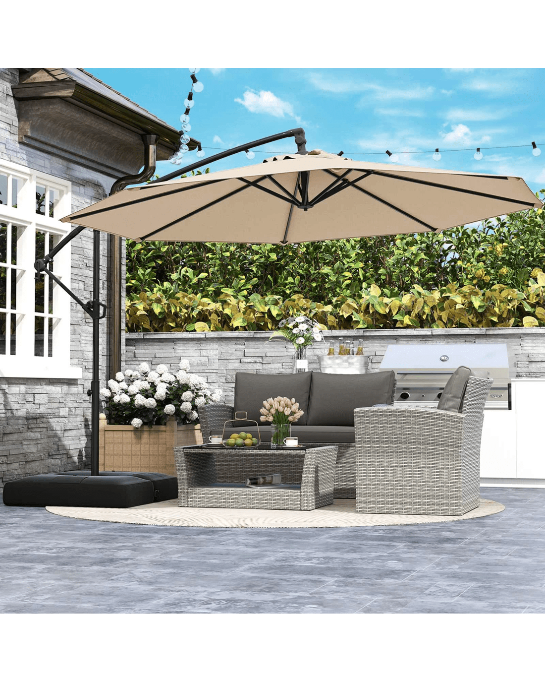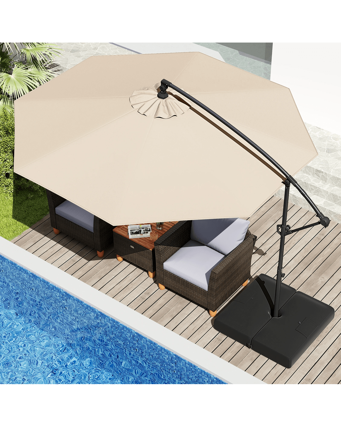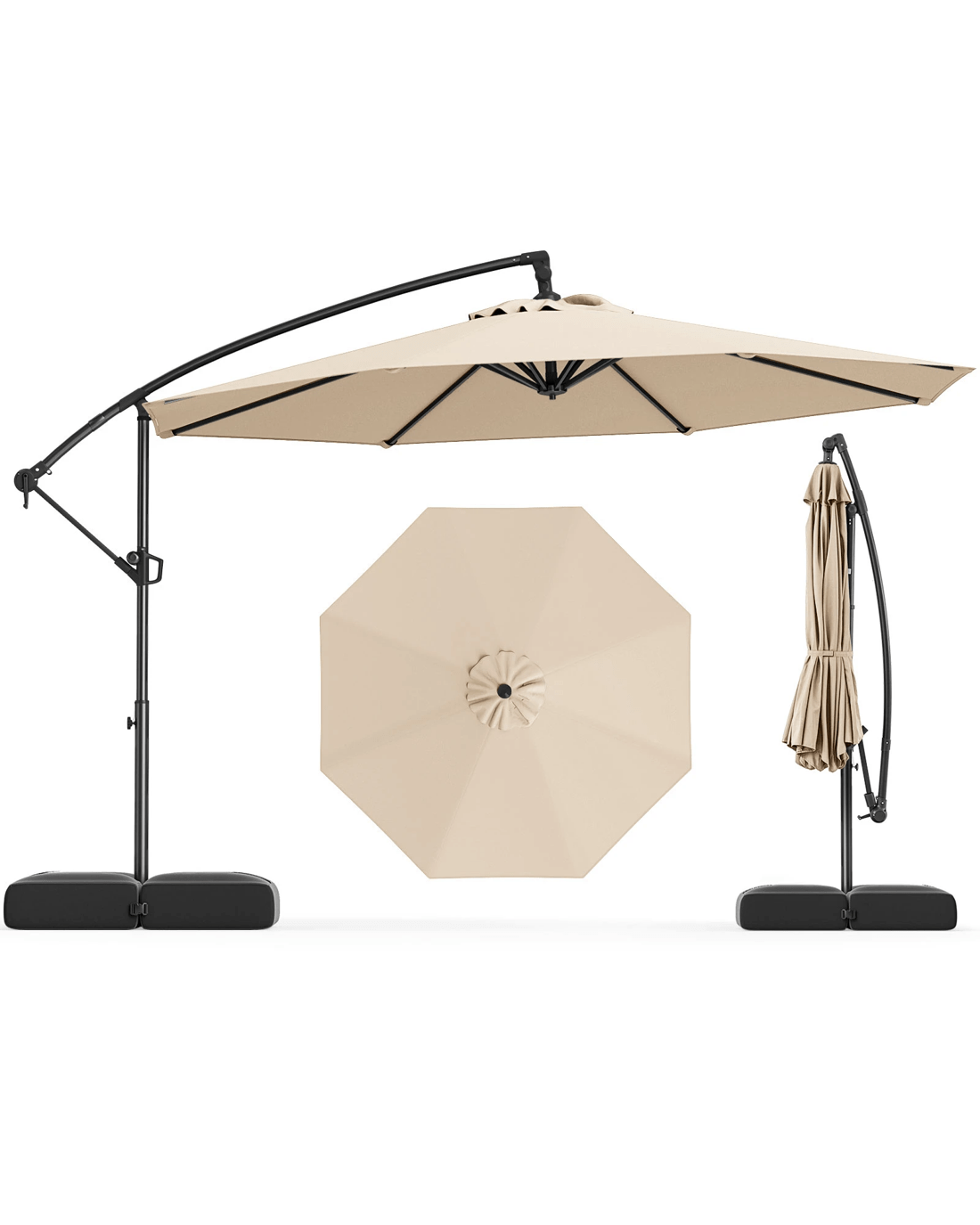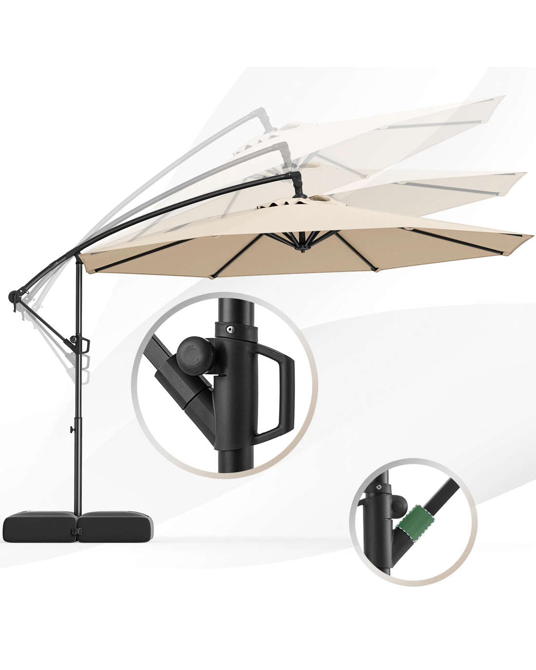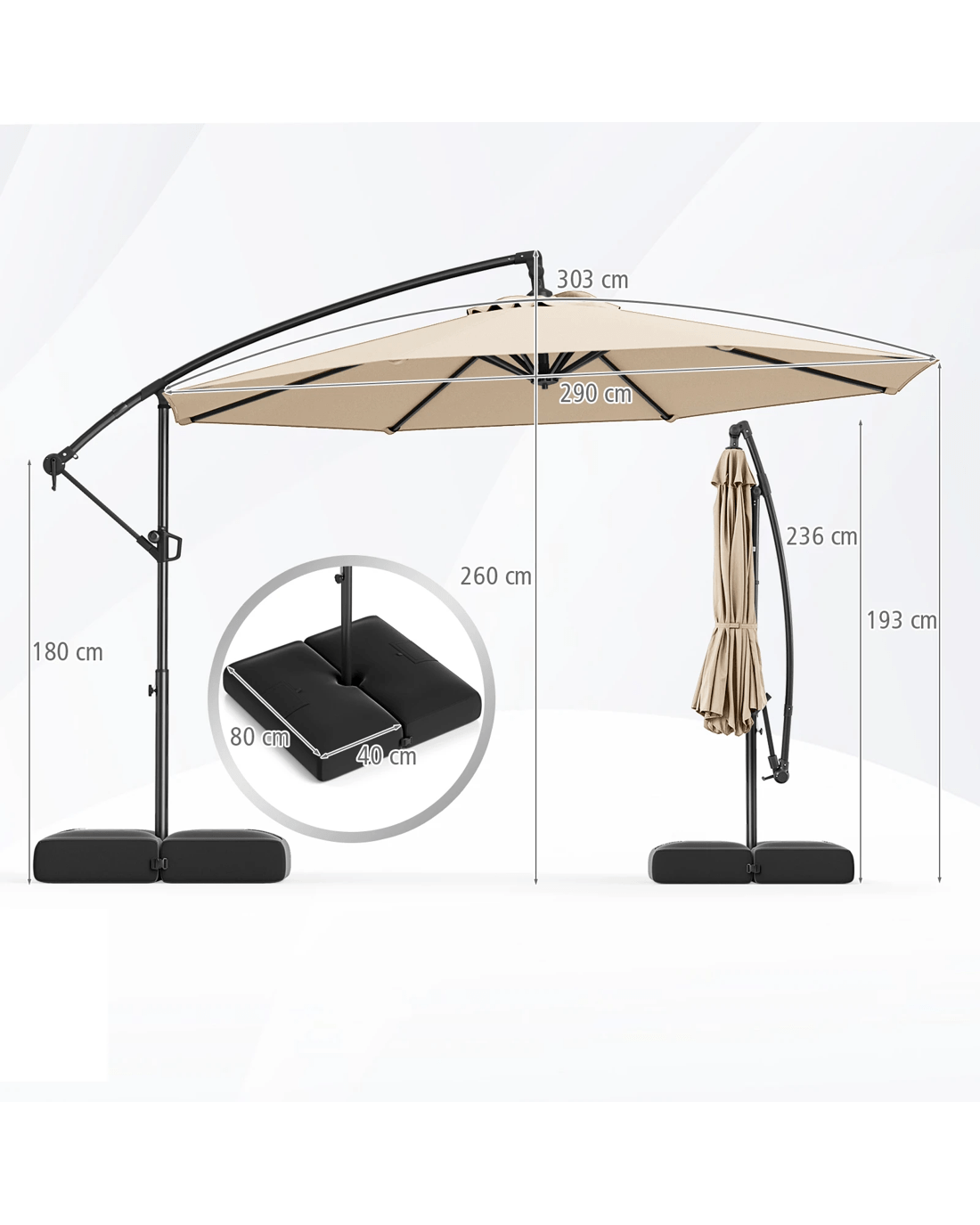 Our 303 cm offset hanging umbrella with a base is a perfect shading solution for your patios, gardens, poolside areas, outdoor events, or even commercial areas, offering a generous shade coverage for various outdoor activities. Thanks to the umbrella's seamless ability to tilt and rotate 360°, customize your shade is a breeze, while the locking mechanism allows for easy operation. Built with a focus on stability and security, its additional fixing strap, robust connectors, self-locking hinges and 8 heavy-duty metal ribs ensure secure and wobble-free structure. Moreover, crafted from 180 GSM dyed polyester canopy with a vented top, this hanging umbrella not only offers superior protection from outdoor elements but also enhances airflow for utmost relaxation. When not in use, we recommend closing the umbrella through a hassle-free crank handle to extend its lifespan.