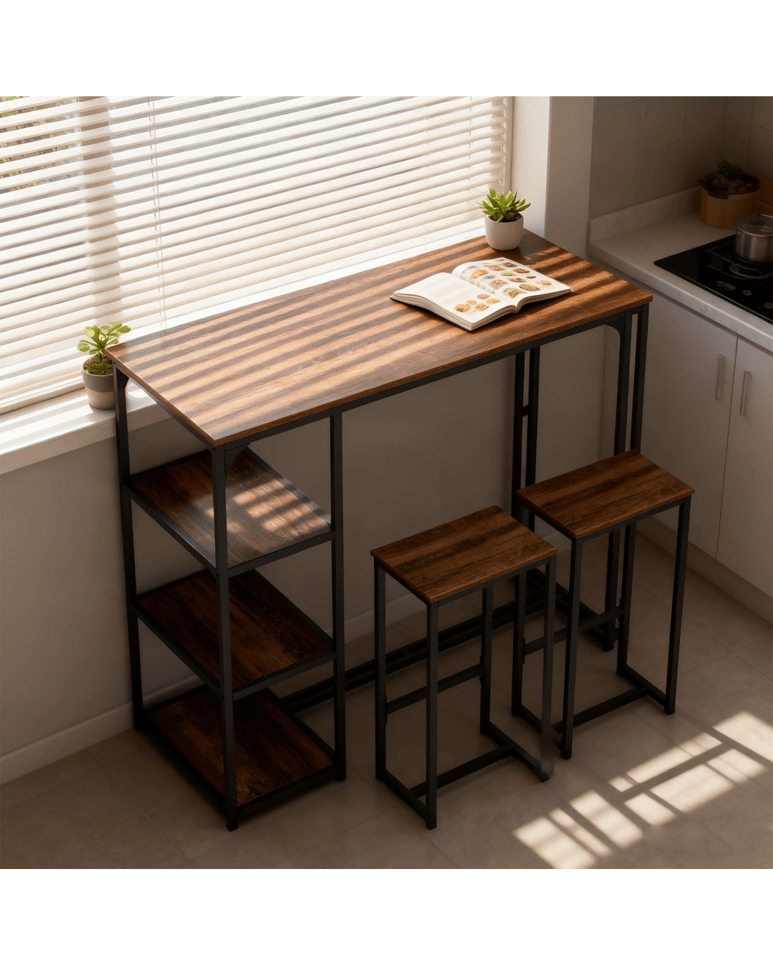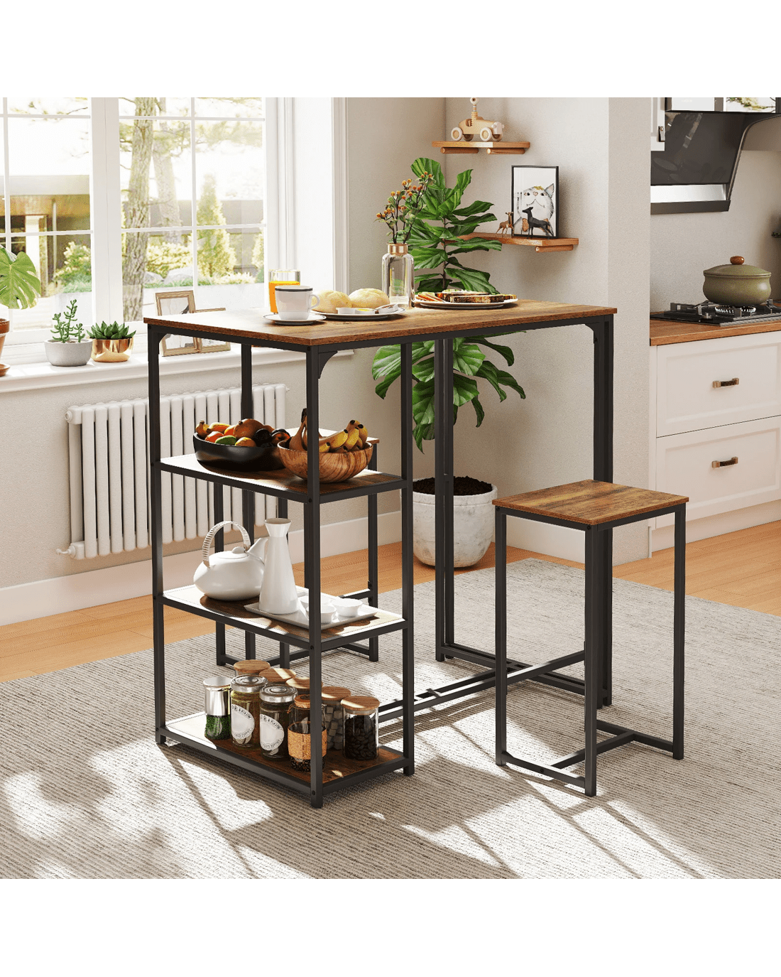 Are you looking for a stylish dining set that can adapt to your space and lifestyle? This bar-height dining set is the perfect solution! With a wide tabletop measuring 110 x 60 cm, it offers ample space for dining and entertaining, while the side 3-tier storage shelves provide convenient organization for foods, dishes, seasonings, and decorations. Whether you are hosting family gatherings, dinner parties with friends, or enjoying romantic meals, this versatile set enhances any space. Besides, the 2 bar stools to be tucked under the table when not in use, making it ideal for small apartments or rooms. Built with robust metal frames and reinforced H-shaped crossbars, the set offers reliable support and stability, with anti-slip footpads to protect your floors. Hence, this 3-piece dining table set is perfect for dining room, kitchen, living room or restaurant.
