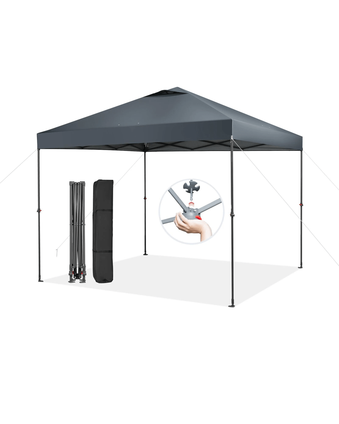 Our folding pop-up canopy measures 300 x 300 x 193-285 cm (L x W x H), which is large enough for enjoying outdoor leisure time with your family or friends. Thanks to the central locking system, the folding canopy can be easily set up or taken down by pushing or pulling the center locking mechanism, no tool required. The canopy is crafted with durable oxford fabric and coated with premium silver, which features excellent UPF 50+ sun protection and drizzle resistance (Note: please put the tent away in extreme weather, such as heavy rain, snow, etc). The supporting frame is constructed of high-strength powder-coated metal, ensuring good sturdiness. Moreover, you can fix the canopy on the ground with wind ropes and stakes, adding more stability. Unlike normal canopies, our canopy is equipped with rotatable feet, allowing you to adjust the tilted angle according to the position of the sun.