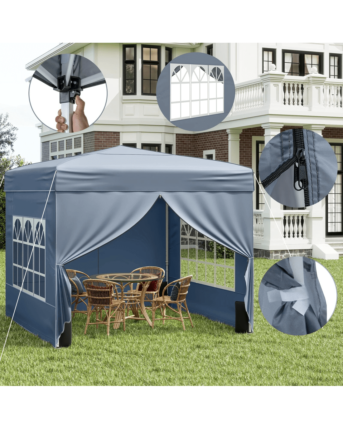 Our foldable and portable canopy tent measures 290 x 290 x 230-248 cm (L x W x H), with 3 easily adjustable height positions, accommodating various outdoor activities, whether for family barbecues, festivals, vendor booths, or backyard relaxation. With 4 detachable sidewalls, you can freely configure your setup for shade, privacy, or ventilation, adapting to changing weather or event needs. Its innovative pop-up structure allows for swift setup without the need for tools, and when not in use, you can easily collapse it and store it in a wheeled storage bag, making transport and storage hassle-free. With its heavy-duty truss carbon steel frame and reinforced by sandbags, ground stakes, and wind ropes, this canopy is designed for impressive stability and security on various surfaces. Please note, this shelter is intended for temporary set-up, so secure it firmly at all times and avoid use in extreme.