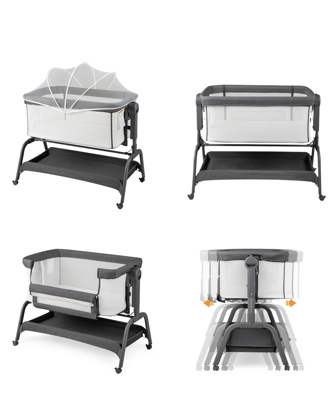 4 modes: beside sleeper, rocking bassinet, standalone crib, little ones bed with net