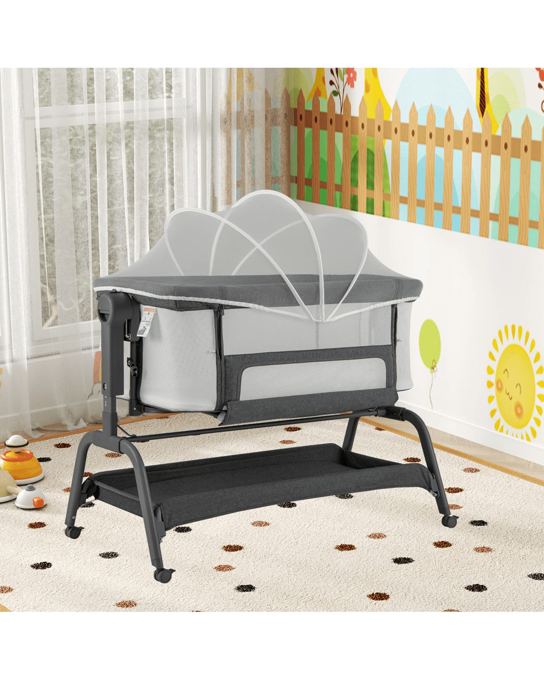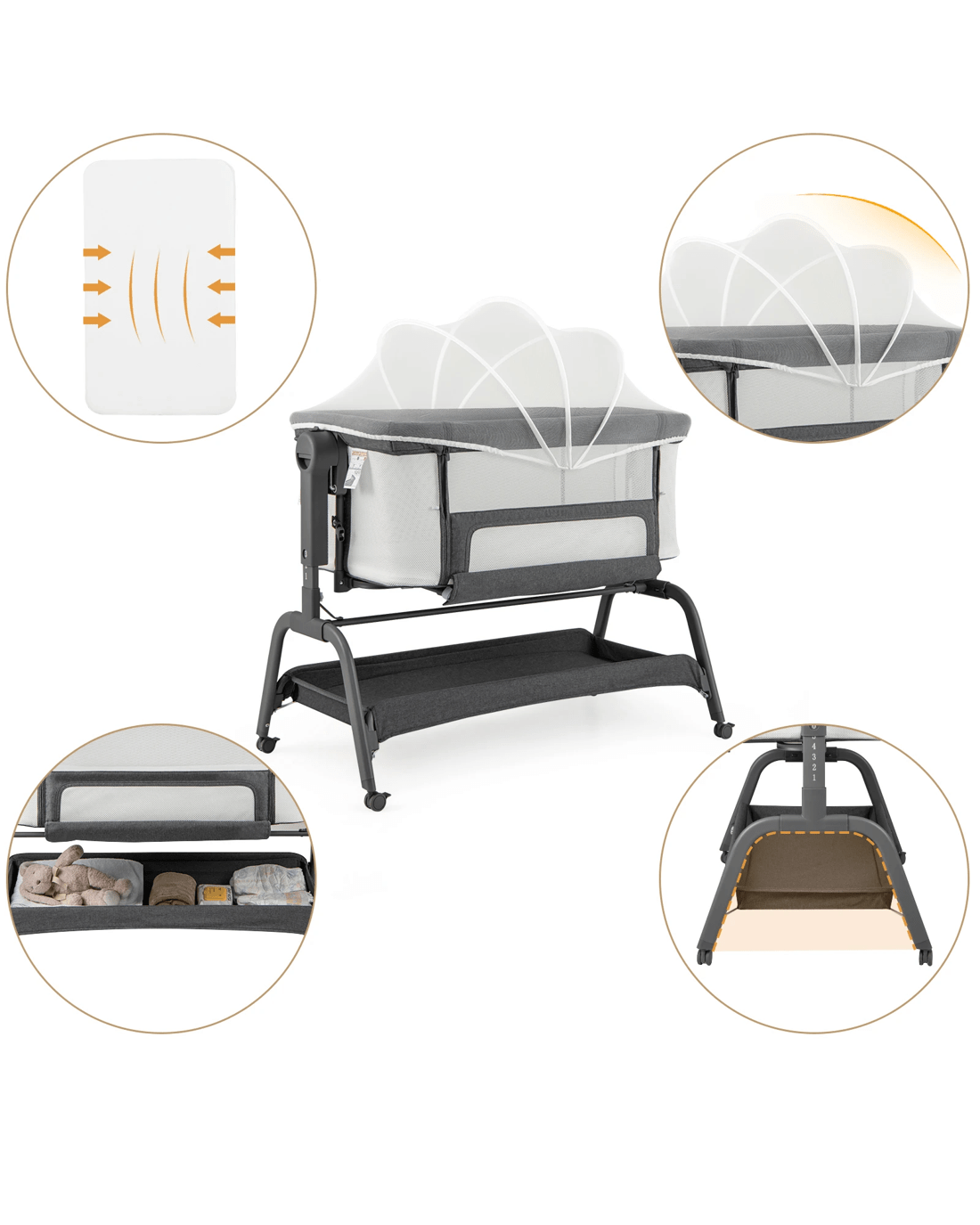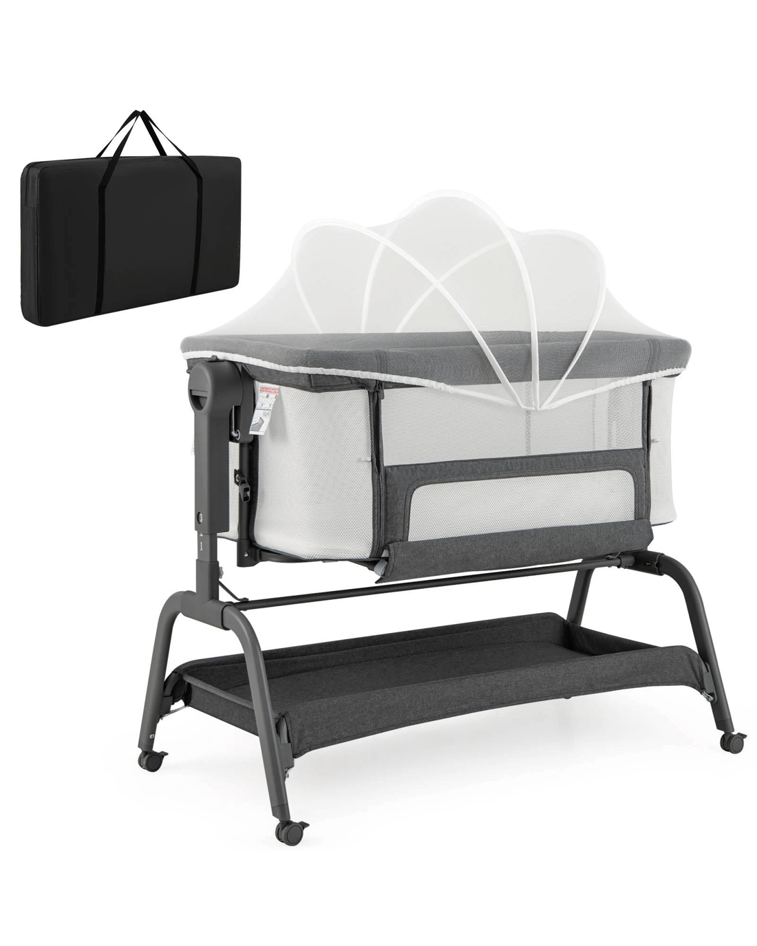 This multifunctional bassinet can be used as a little ones bedside sleeper and easily transitions into a rocking cradle, travel crib, or standalone bassinet by configuring a few simple adjustments. The detachable & breathable net protects your little ones from bites. Designed with security and comfort in mind, the bassinet includes a soft mattress and 4-sided mesh to ensure that you can always keep an eye on your little ones. 6 adjustable heights fit most adult beds and 2 elastic straps secure the crib to the parent's bed. The bedside sleeper also has a large storage basket at the bottom for placing blankets, toys, or other little ones essentials. Additionally, the rocking function helps soothe your little ones through the night. The lockable wheels enhance mobility and add a layer of security. Meanwhile, the included carry bag makes transportation a breeze.