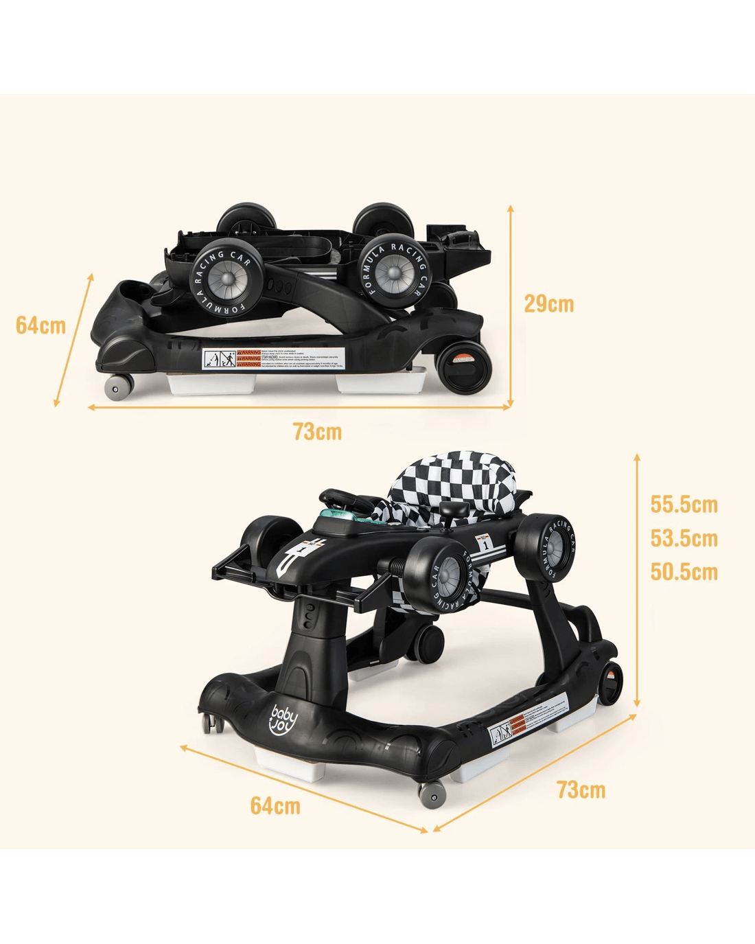 Including activity walker mode, push-behind mode, push car mode and rolling toy car mode, this activity walker with adjustable height and speed accompanies your little one’s growth while satisfying various needs. Furthermore, security is also important. Therefore, the security bumper, anti-slip stair pads and wheels keep your ’s safe. Meanwhile, the comfortable and washable seat cushion is padded with soft sponge and designed with ergonomic backrest, which provides cozy sitting experience. Additionally, the music box with light greatly attracts your little one’s attention. After using it, you can fold this activity walker to save your home space.