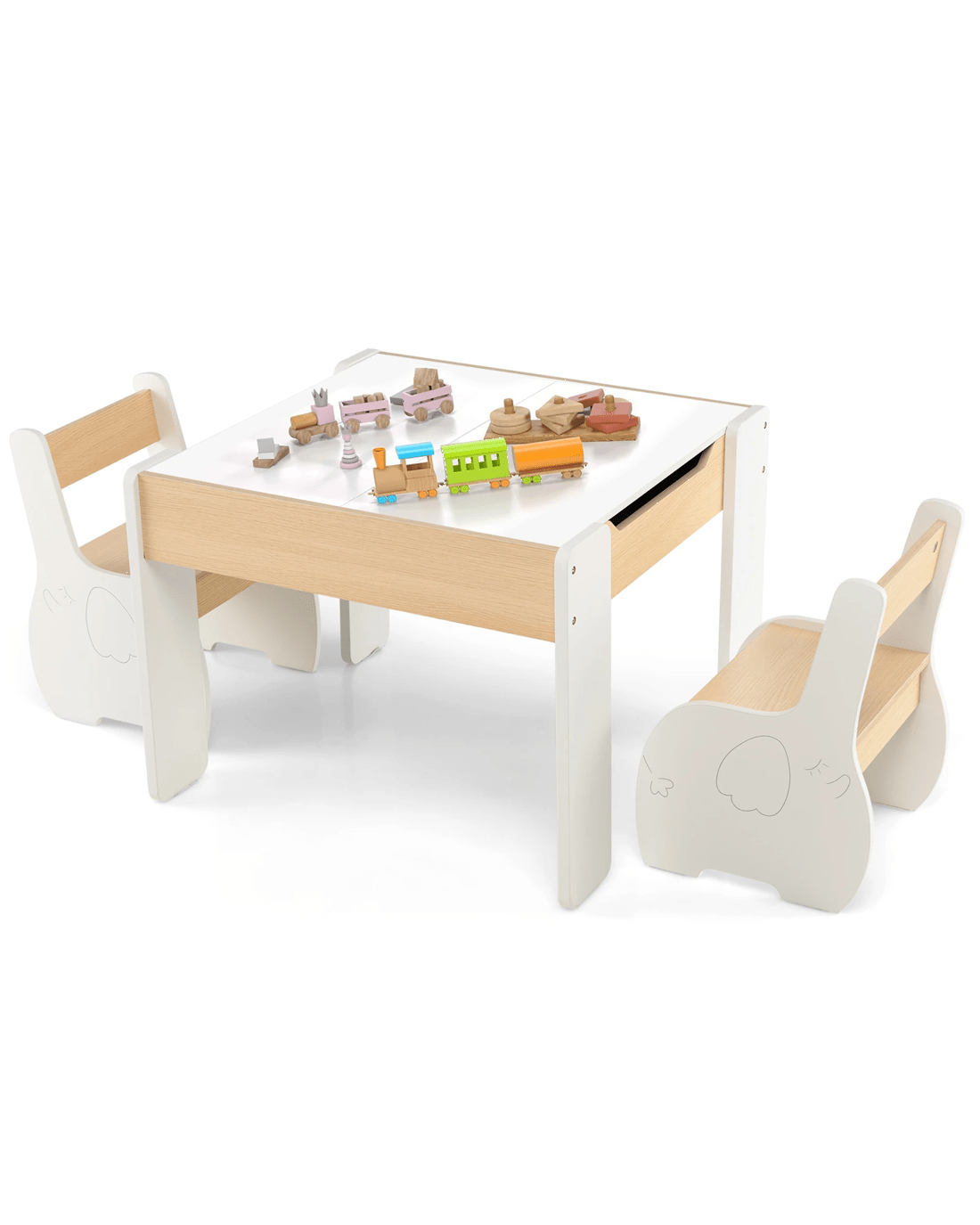 With its innovative 2-in-1 reversible tabletop, this activity table easily converts into a toy table, writing desk, art station, and dining area. The ergonomic chair, complete with a contoured backrest, promotes healthy posture and supports little ones' spines. Crafted from high-quality MDF, this little ones' activity table set is sturdy, little one-friendly, and reliable. The sleek surface is effortless to clean with a damp cloth. Once playtime is over, little ones can neatly stow the chairs beneath the table. The spacious hidden storage compartment, equipped with an anti-falling baffle, encourages little ones to learn organization skills, fostering good storage habits.