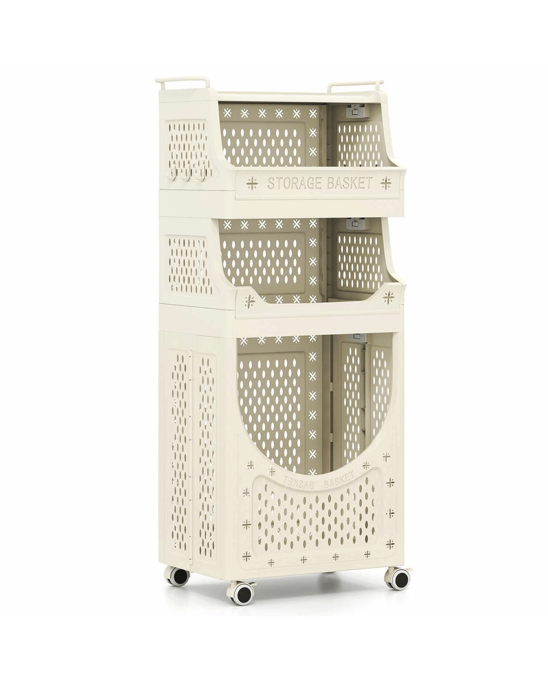 This 4-tier laundry cart combines a hanging bar for air-drying clothes, a spacious hamper and 2 baskets for garments, socks or blankets, along with a top shelf for detergents. Plus, 6 extra hooks holds towels or brushes with ease. The tool-free assembly lets you unfold and secure it in seconds, and it collapses flat for compact storage. With 4 universal wheels (2 lockable), it glides effortlessly between rooms and stops exactly where you need it. Besides, raised baffles and ventilated design keep items secure and fresh. Simplify laundry day with this versatile 4-tier cart!