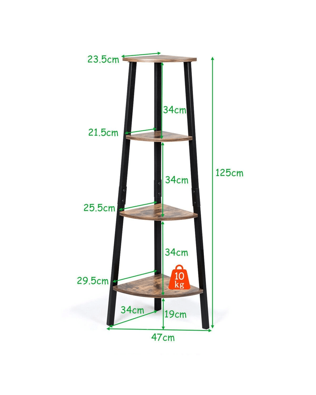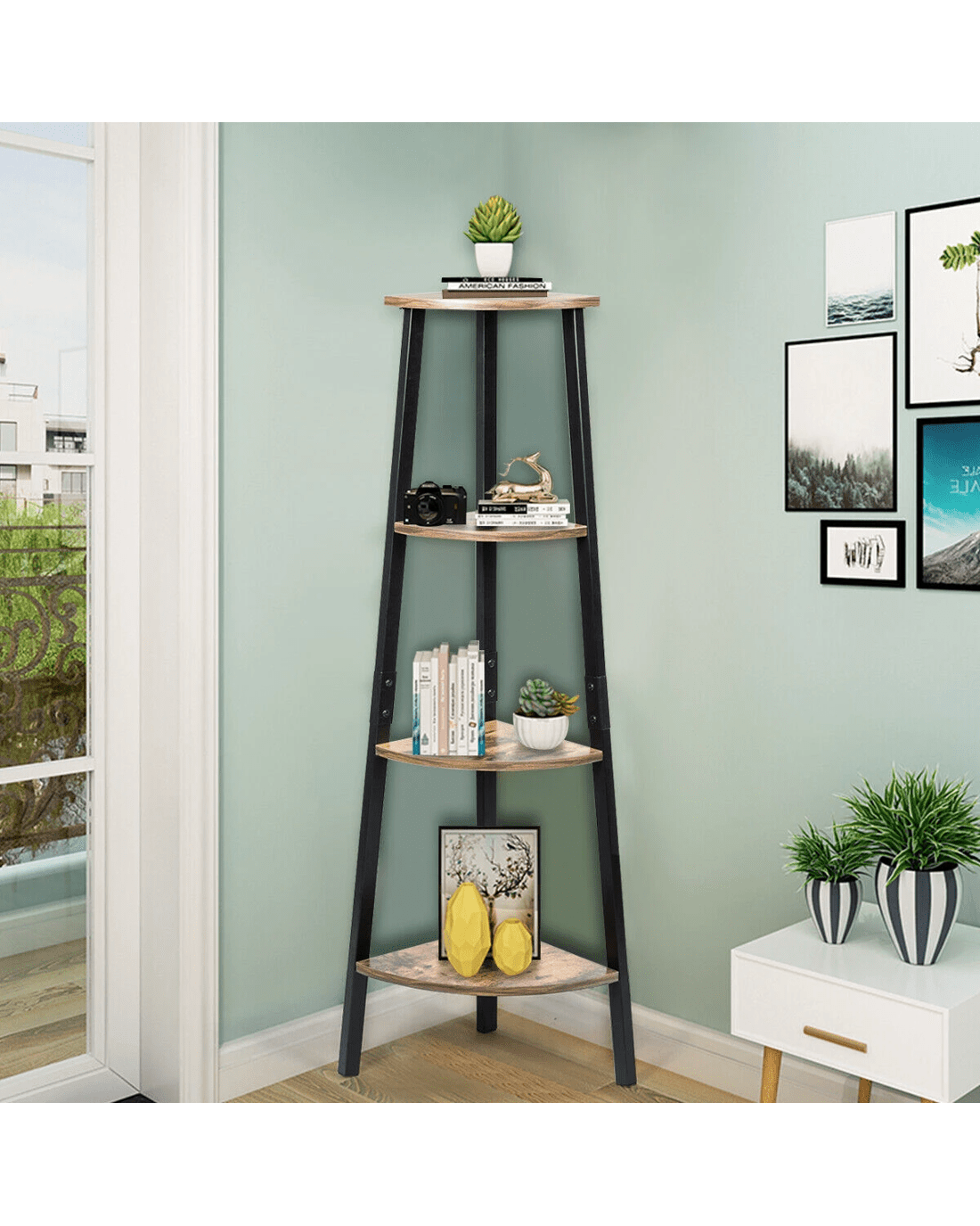 Our 4-tier corner shelves can make every corner of your home stylish and unique. This shelf is thoughtfully designed to accommodate compact spaces such as kitchens, study rooms, living rooms, and bedrooms. This storage rack is made of high-quality particleboard and metal materials, durable and stable. Four open shelves will create more space for storage needs. Industrial style and minimalist design add decoration to your living area. The 4-tier shelf can store more than just books, decorations, and toiletries. Think more, if you want to grow some flowers to decorate your home, you can use it as a pergola. So add more beauty to the corners of your home with this cutest shelf. Once you get the corner racks to your place, you'll get more ideas.
