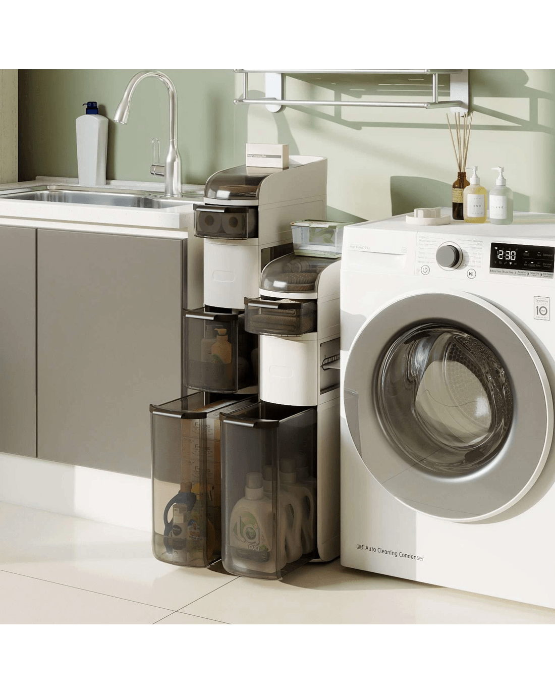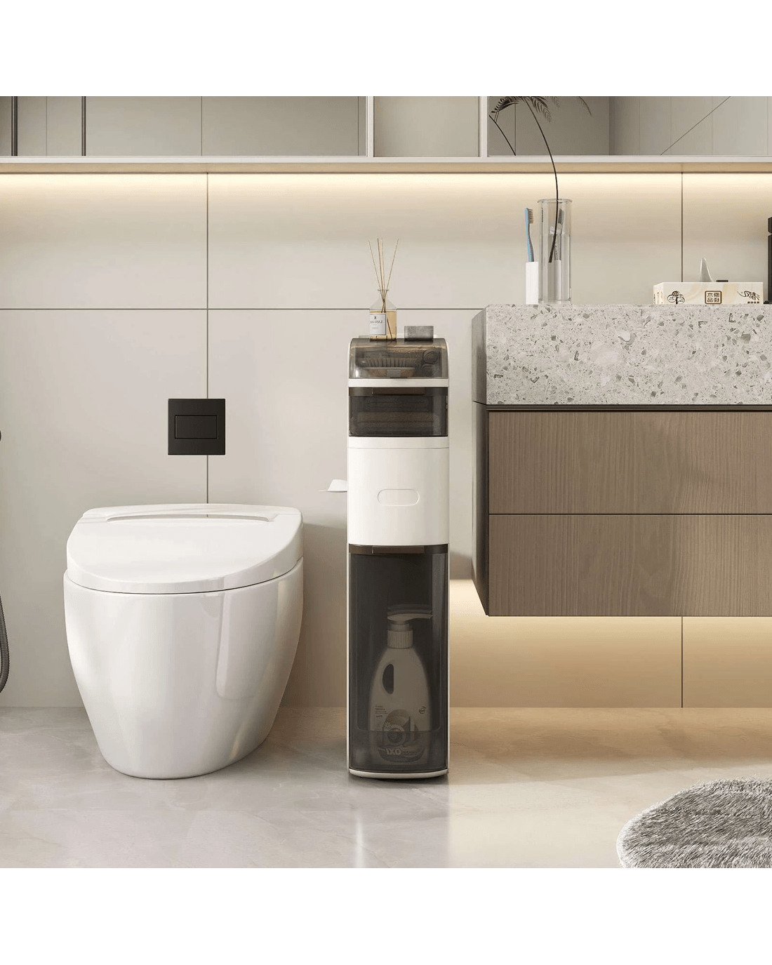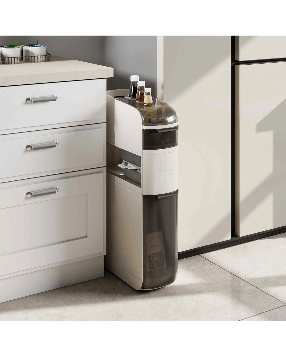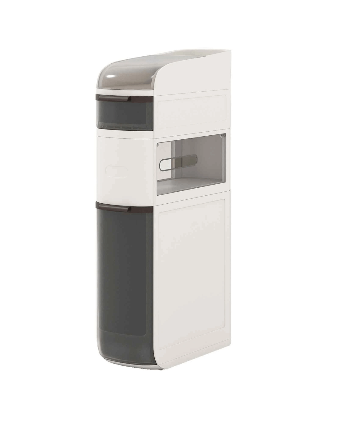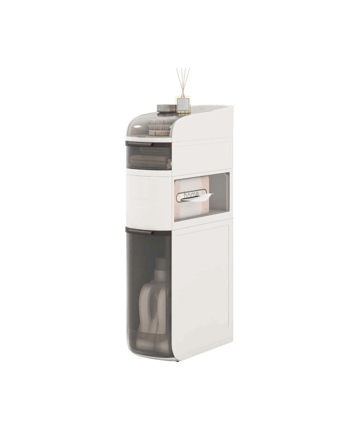 This narrow storage cabinet features thoughtfully classified storage areas, including a flip-top lid, double tissue outlets and see-through drawers, ideal for organizing items of different sizes and heights. Meanwhile, with a width of 17.5cm, it takes up little floor area while providing ample storage, maximizing vertical space. Additionally, its high-quality plastic construction is both enduring and water-resistant, ensuring easy maintenance and cleanliness. There are more thoughtful details. The raised edges protect your items, keeping them secure and in order. Its 4 smooth-rolling wheels and integrated handle also offer effortless maneuverability, making it a convenient addition to your bathroom, laundry room, kitchen and living room.