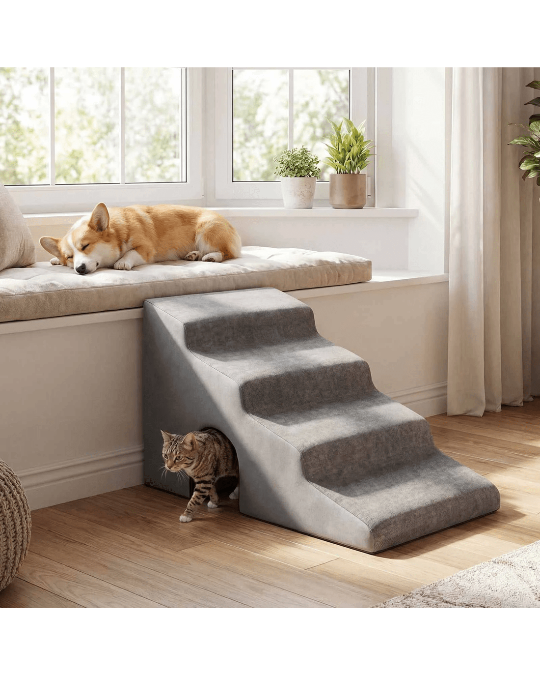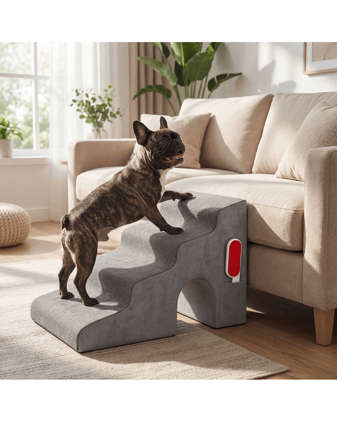 Create a safe and comfy passage for your furry friends!Why choose us? Unlike hard material lead to discomfort, ours adopt high density foam to alleviate joint pressure of your pets, ensuring comfortable climbing. Moreover, in contrast to difficult to climb straight ladder, ours feature gentle slope for effortless climbing. With 4-tier steps, the 70 cm dog ramp provides convenience for aged or injured dogs to achieve high beds and couches. Crafted with selected material, our 4-tier foam dog ramp features ultimate comfort & durability. The chenille and suede cover with zipper is machine washable for easy maintenance. Besides, the non-slip silicone bottom ensures that your pet stays secure during climbing. The foam dog ramp is designed with an arch at the bottom of the stairs, forming a tunnel for small pets to pass through. And a lint roller is offered for you to clean pet hair. For your convenience, the foam vacuum can expands to full capacity in 24-48 hours. Then you only need to zip the cover when needed.