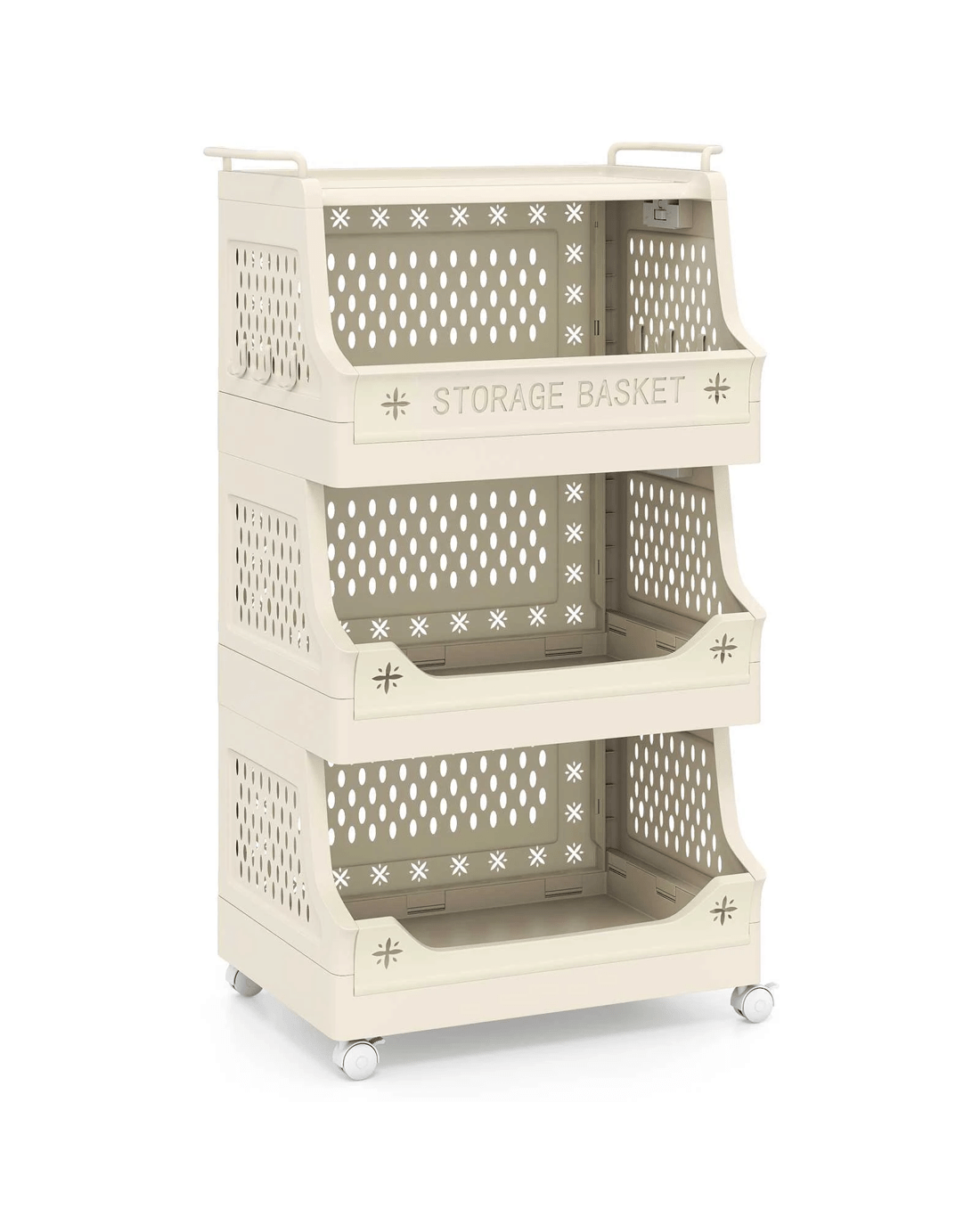 Costway 4 Tier Rolling Storage Cart w/Open Front Baskets Stackable Plastic Organizer - Beige