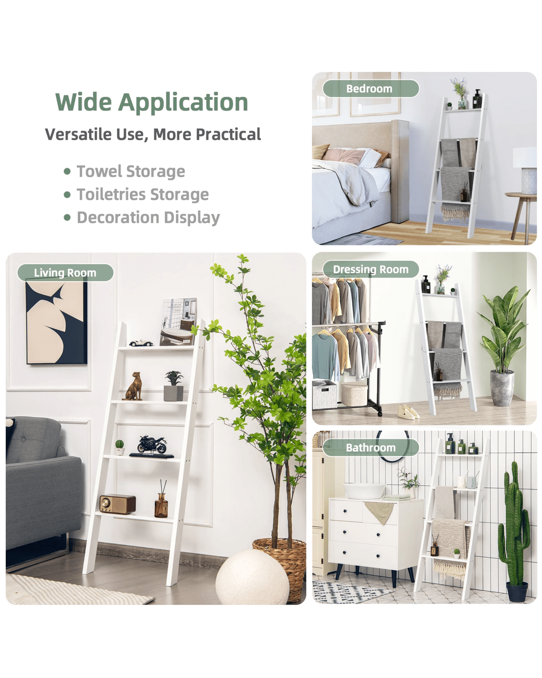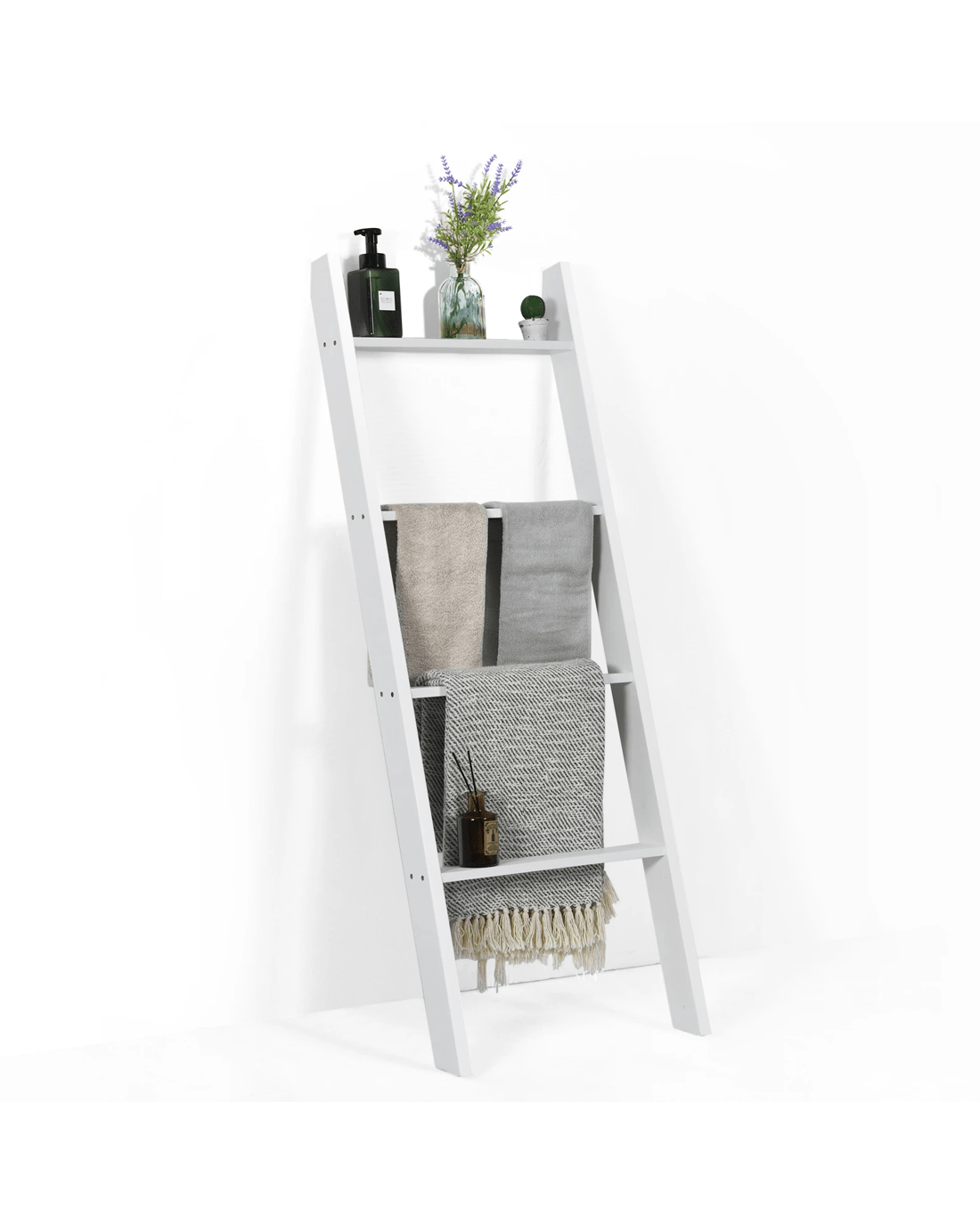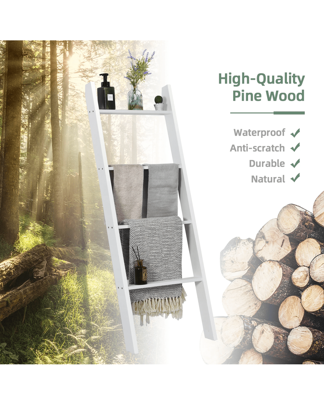 The 4-tier blanket ladder combines decoration with functional storage space, providing a stylish and unique option. The pine wood structure ensures great sturdiness and the overall load-bearing capacity is increased to 80 kg. Plus, because they're carefully painted, the shelves last longer. In terms of stability, it is equipped with anti-slip slopes that can hold the blanket ladder well. In addition, shelves also play different roles and are placed in different places. You can put it in the living room to store beautiful decorations, in the bathroom to store toiletries, and in the bedroom to store blankets.