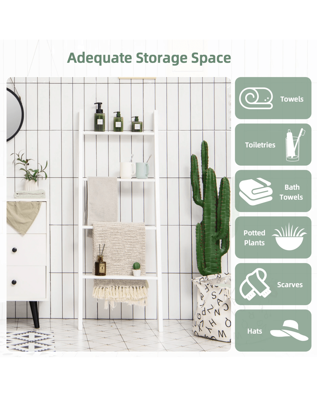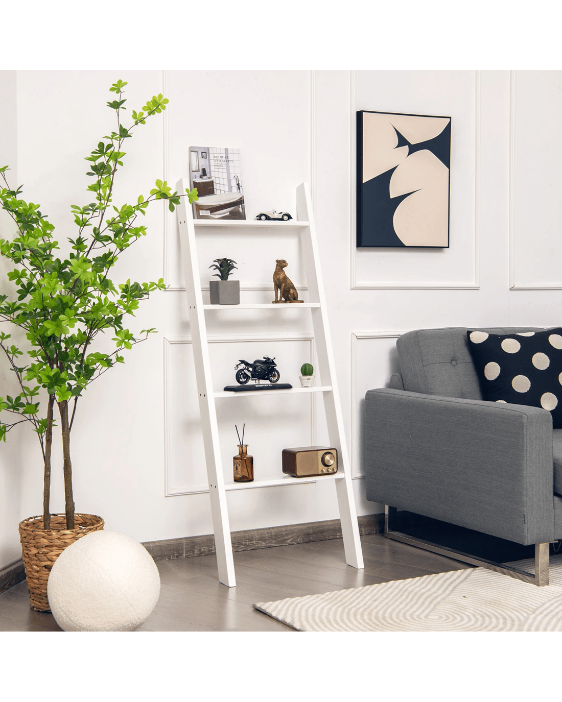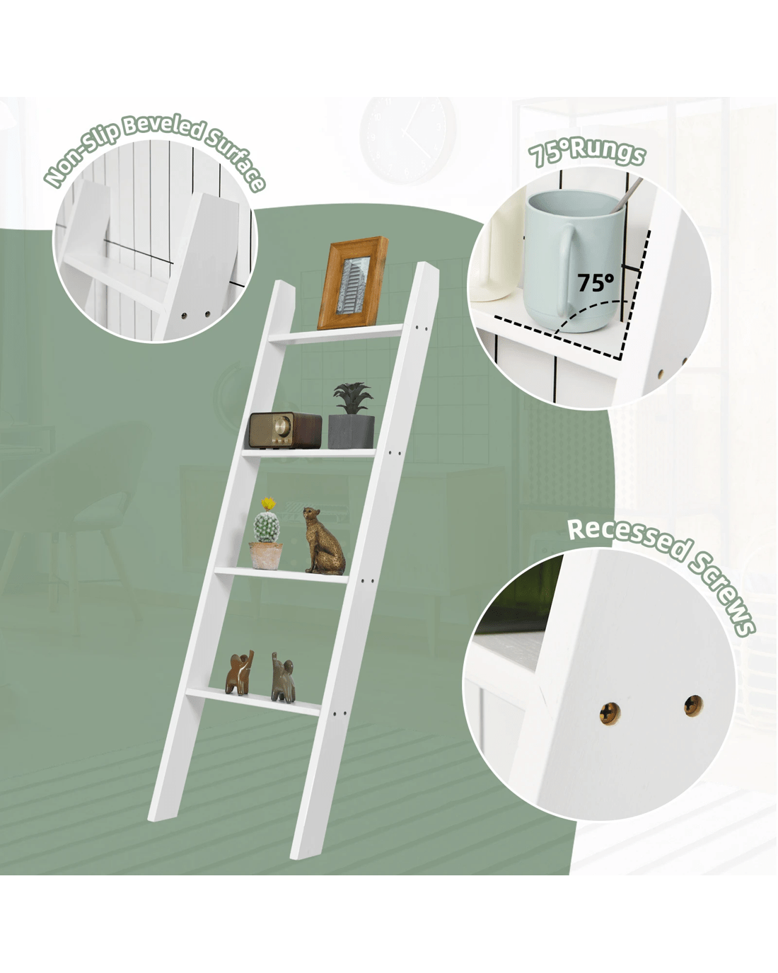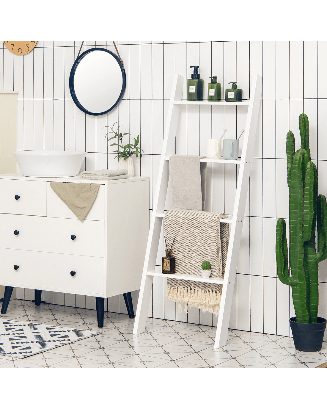 The 4-tier blanket ladder combines decoration with functional storage space, providing a stylish and unique option. The pine wood structure ensures great sturdiness and the overall load-bearing capacity is increased to 80 kg. Plus, because they're carefully painted, the shelves last longer. In terms of stability, it is equipped with anti-slip slopes that can hold the blanket ladder well. In addition, shelves also play different roles and are placed in different places. You can put it in the living room to store beautiful decorations, in the bathroom to store toiletries, and in the bedroom to store blankets.