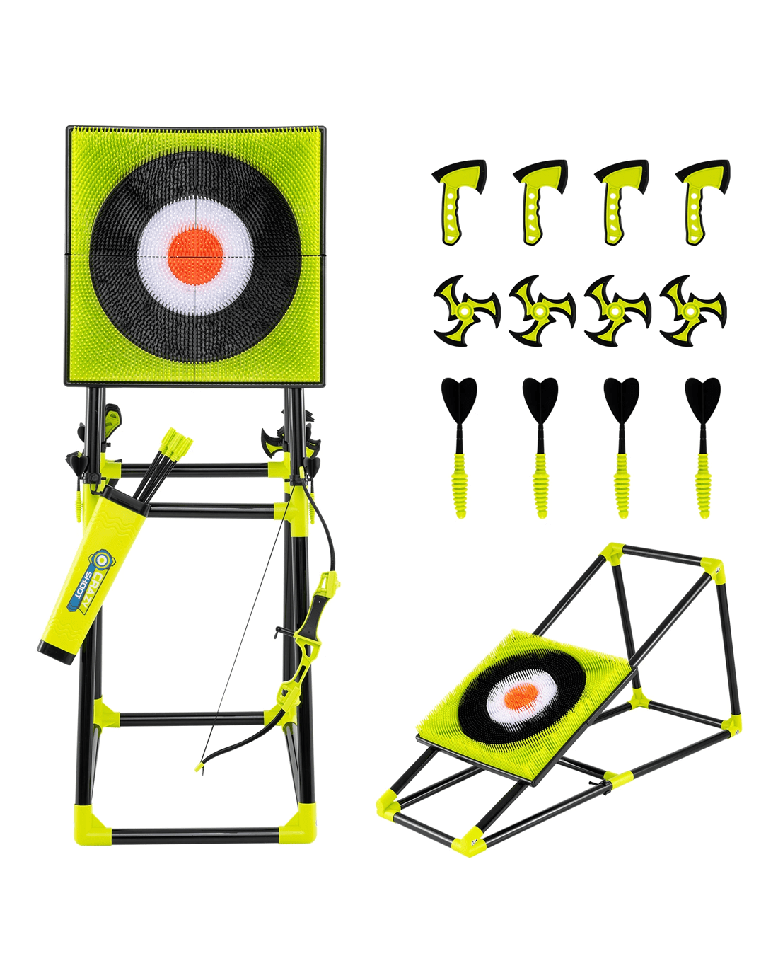 Includes a bristle target, 4 axes, 4 ninja darts, 4 darts, a bow, and 6 arrows