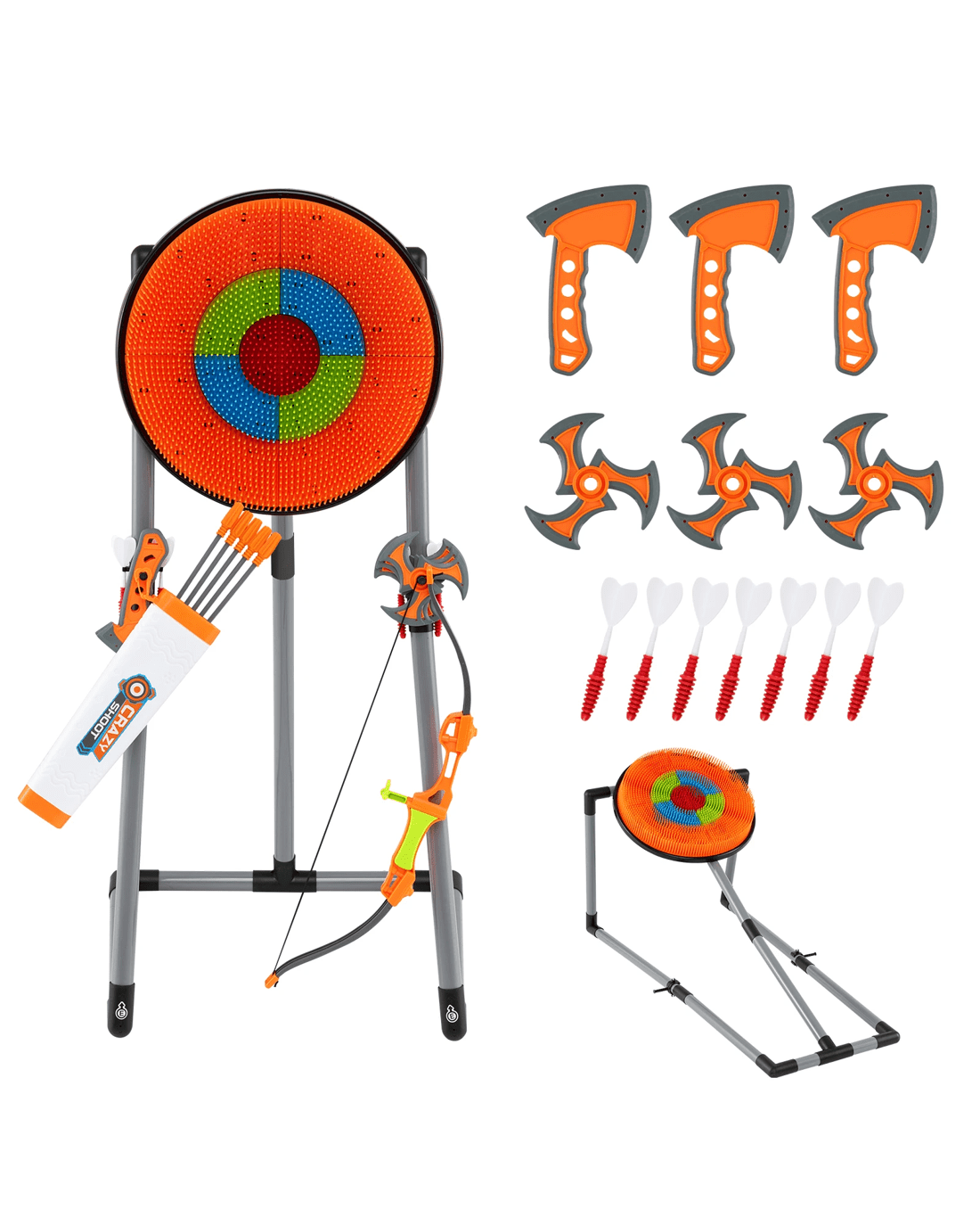 Includes a bristle target, 3 axes, 3 ninja darts, 3 darts, a bow, and 5 arrows