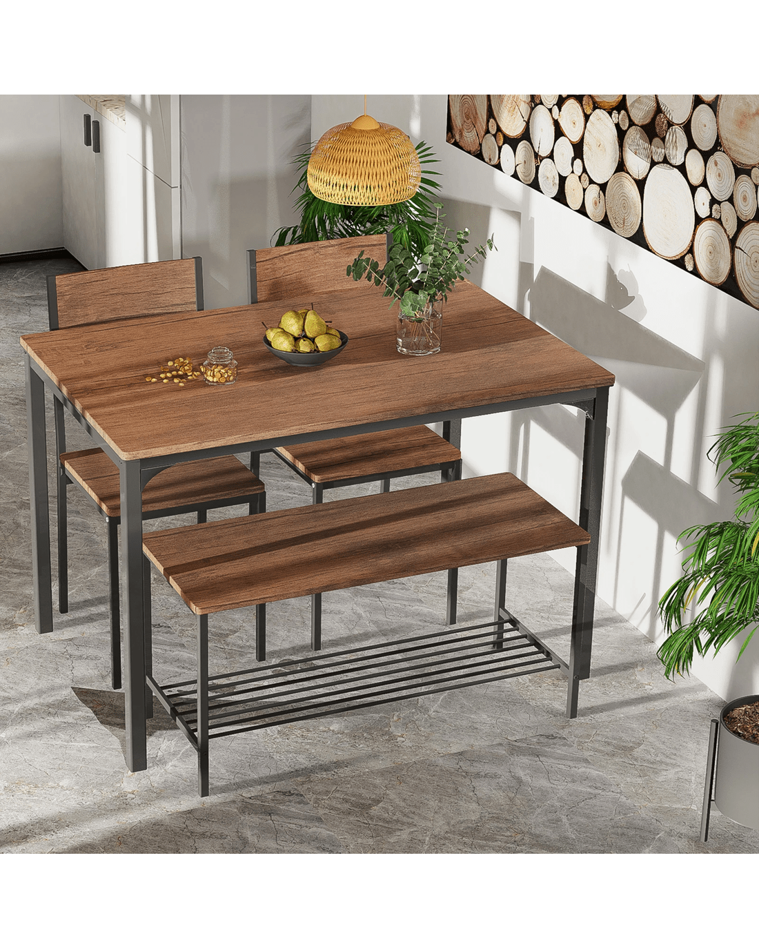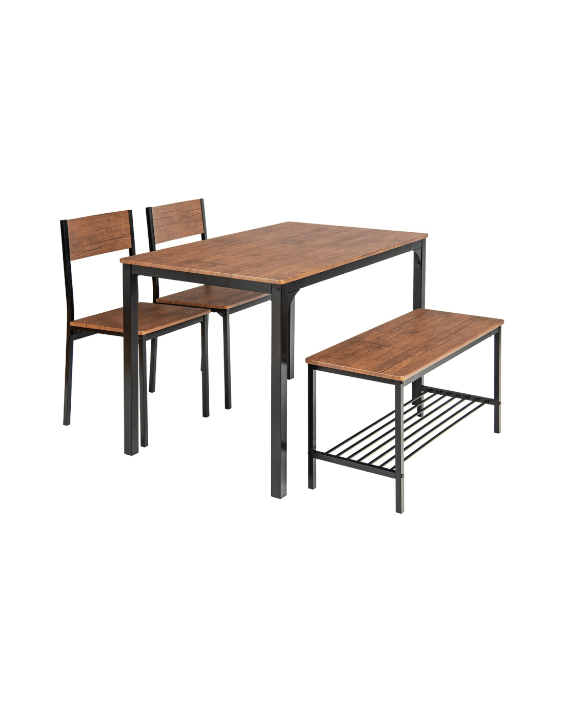 4-piece dining set includes a table, a bench and 2 chairs