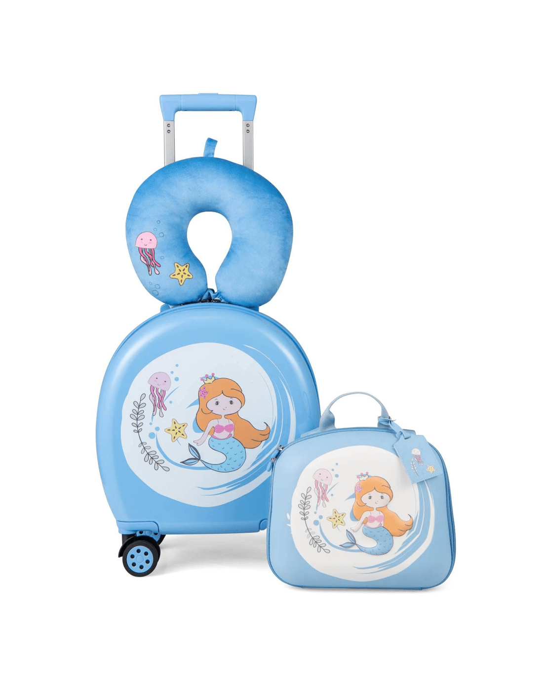 Our 4-piece little one’s luggage set includes a vibrant little ones carry-on suitcase, a coordinating backpack that is perfect for day trips or school outings, a soft neck pillow for added comfort during long travels, and a luggage tag for quick identification. Each is made of high-quality materials: reliable ABS and PC for the suitcase and tough 600D oxford fabric for the backpack, which are built to endure the excitement of travel. Besides, with its 3-level telescoping handle and 4 flexible universal wheels, moving around airports, train stations, or hotel lobbies is a breeze. And there is a back fixing buckle to attach the backpack securely to the suitcase, and adjustable shoulder straps for a customized fit. The whimsical mermaid/adorable penguin/dreamy unicorn patterns add a touch of fun to each piece, making little ones indulge in the whimsical world of travel. It is also a good way to teach little ones how to pack and organize their belongings efficiently.