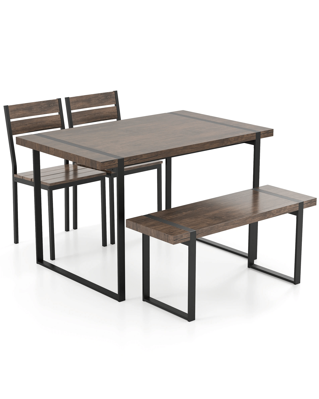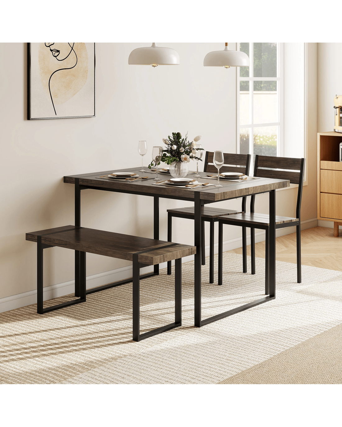 Our stylish and functional 4-piece dining set includes a rectangular table, a spacious bench, and 2 sleek armless chairs, perfect for gathering around with family or entertaining friends. The robust metal frame enhanced with thick wood boards ensures a stable and reliable setup, while the thoughtful inclusion of anti-scratch pads protects your floors during daily use.When not in dining use, the clever design allows the bench and chairs to slide neatly under the table, saving valuable space in your home. This makes it ideal not only as a dining set but also for use as a workstation or a desk, catering to a variety of activities from dining to studying. Our dining set combines functionality with aesthetic appeal, making it a perfect addition to your home furnishings.