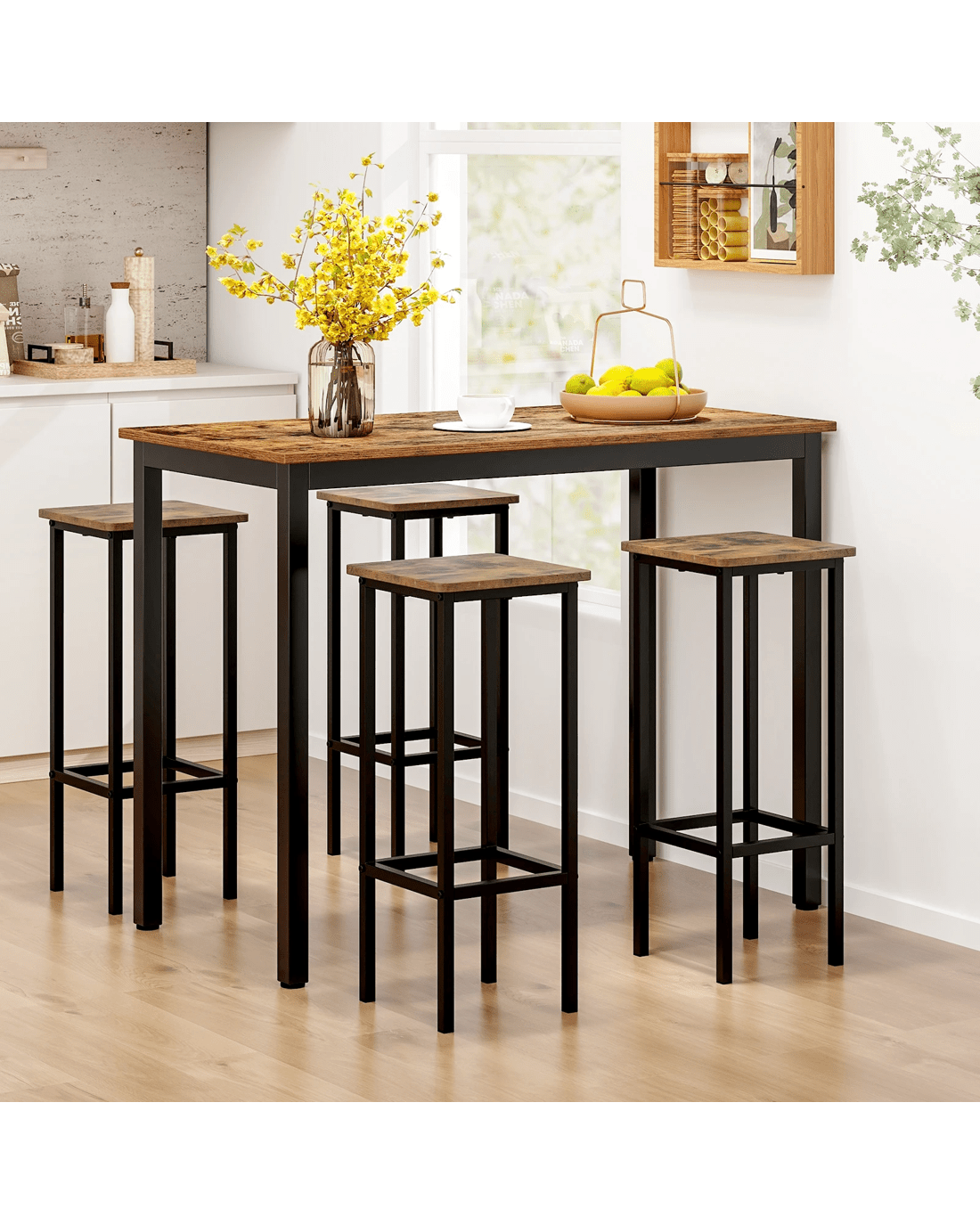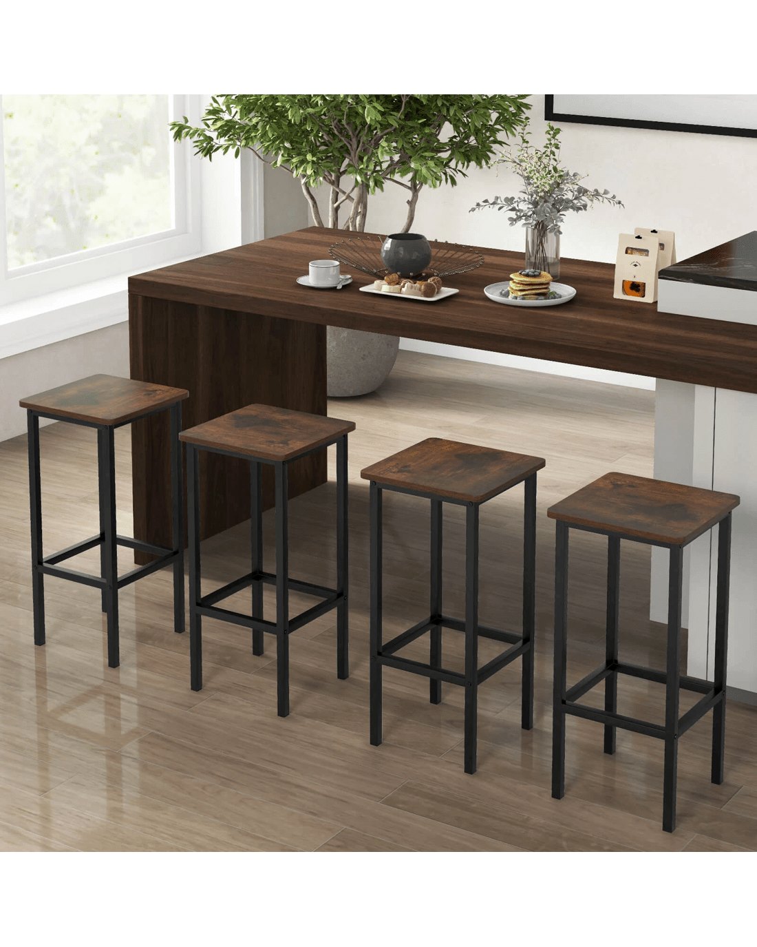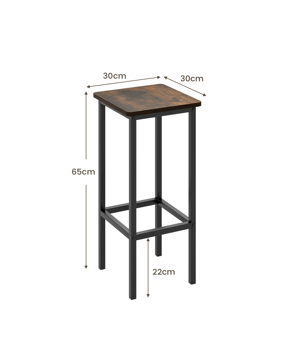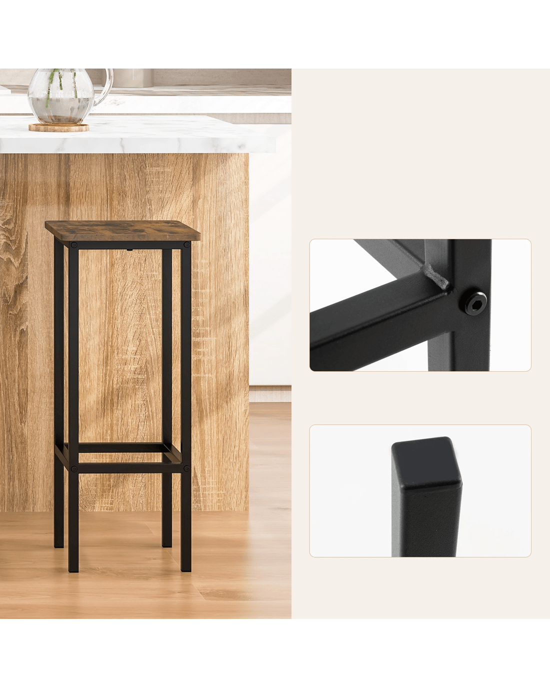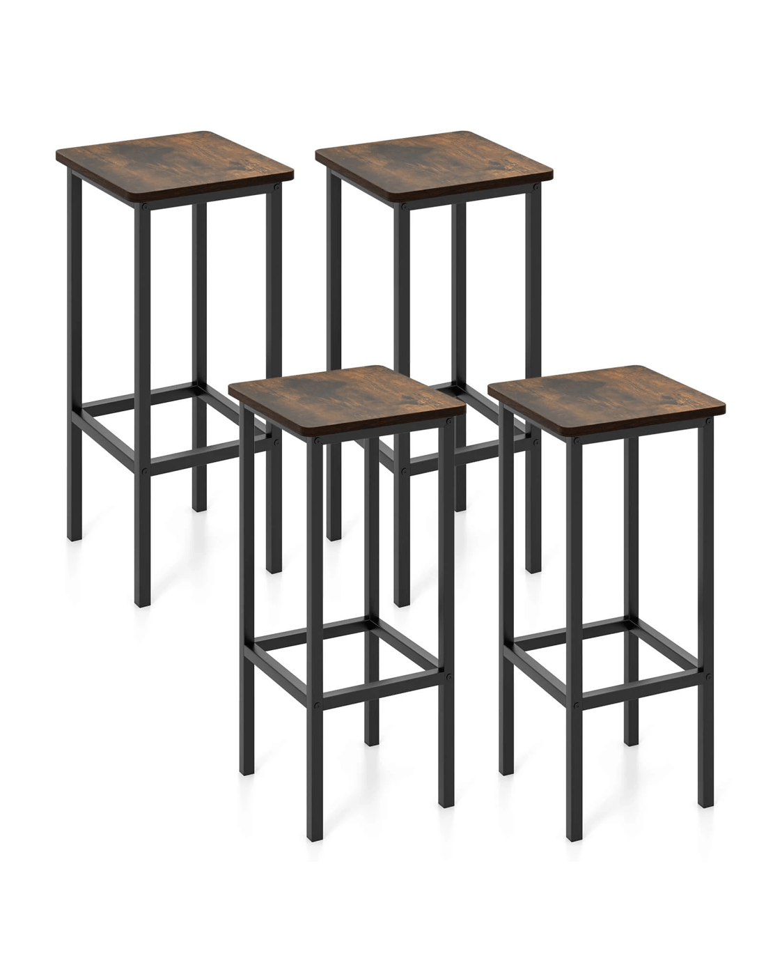 Designed for durability, the seats are anti-crack, burr-free & easy to clean. Say goodbye to scratches on your guests' clothes, thanks to the smooth edge banding. Its strong metal legs ensure stability & rust resistance, while also supporting an impressive weight capacity of 150 kg. Your guests will love the 22cm high footrest, allowing stretching legs & providing optimal comfort. The bar chairs are equipped with anti-slip foot pads, ensuring stability & floor protection. Perfect for small spaces, these space-saving breakfast stools bring versatility to your kitchen, dining room, or any occasion. With a touch of industrial elegance, their metal frame & vintage wood seats add a stylish accent to any decor. Assembly is a breeze with the detailed manual provided.