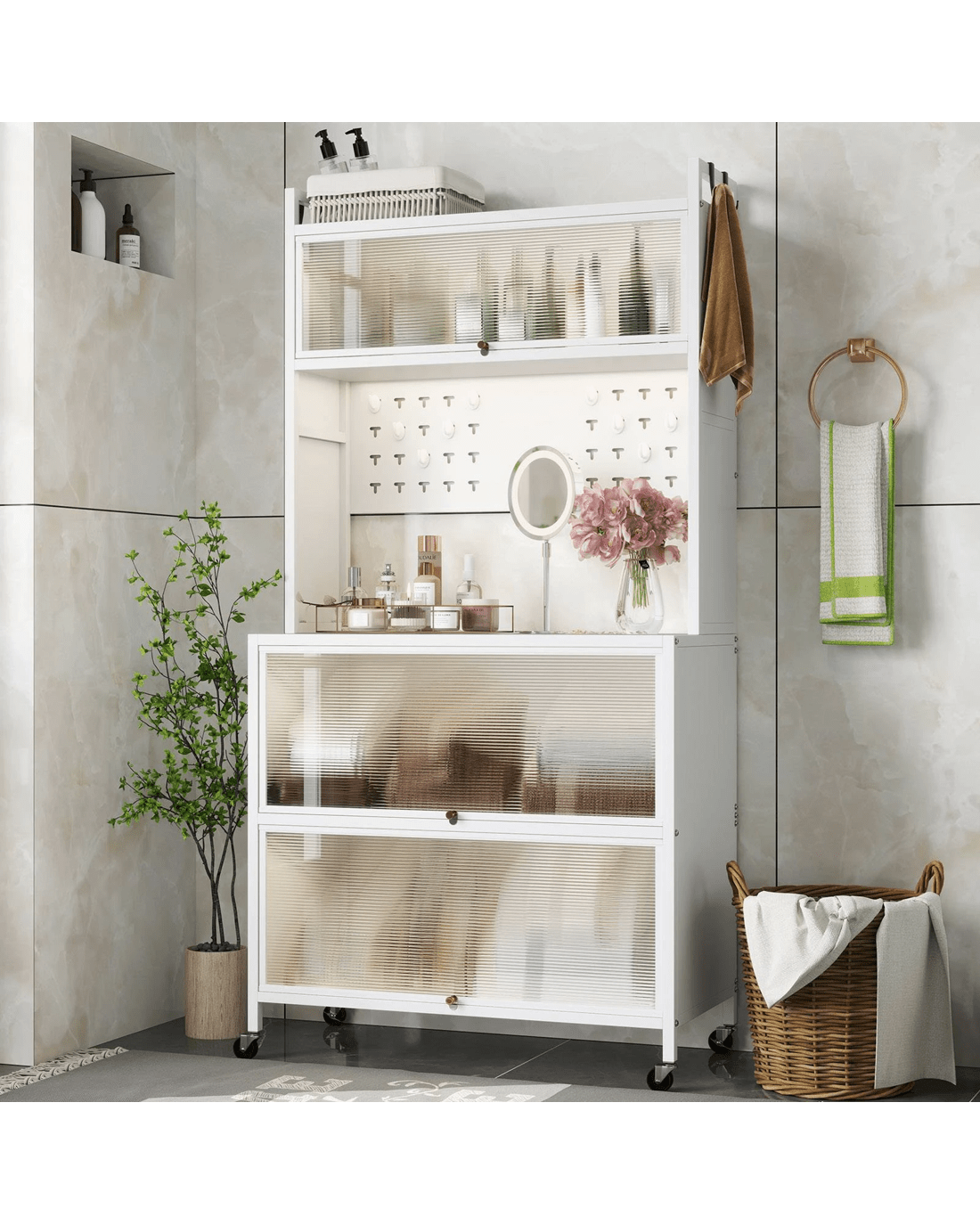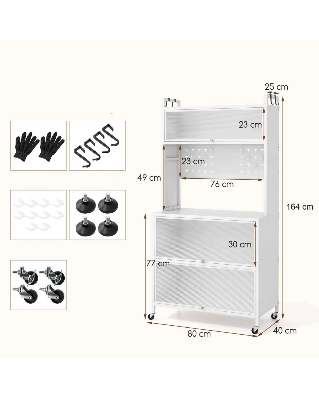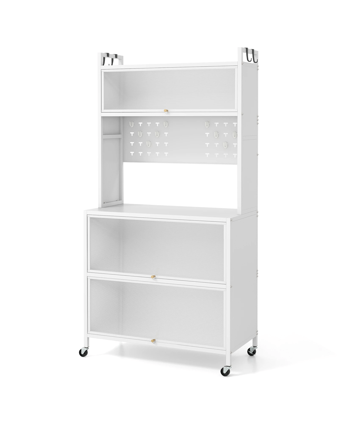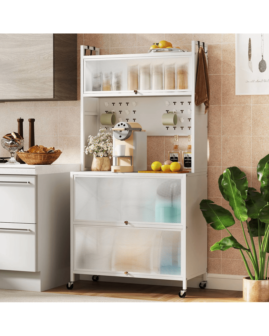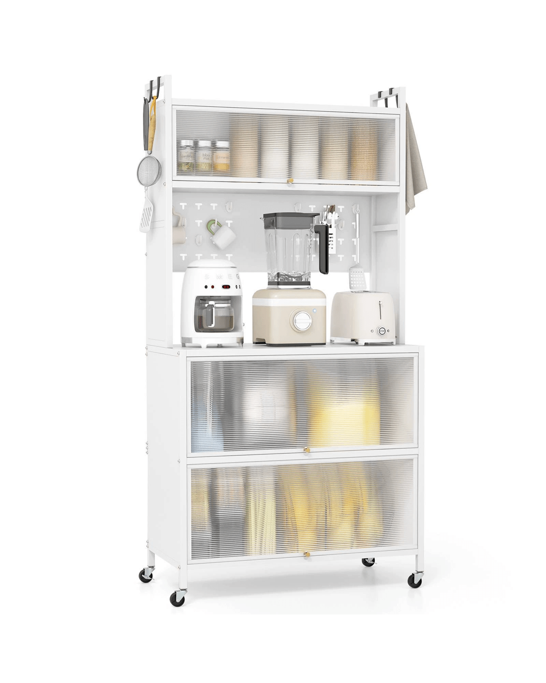Designed with flexibility, this kitchen storage cabinet allows you to install 4 universal wheels for easy mobility or 4 adjustable foot pads for stability. The translucent flip doors with aluminum alloy knobs offer easy access to items while giving a contemporary aesthetic to create a cozy touch. For security, this 5-tier microwave stand features an anti-toppling device and raised guardrails. The ample storage space keeps your kitchen essentials organized. Additionally, the coffee bar cabinet boasts a multi-layered metal frame for durability. Whether placed in the kitchen, living room or bathroom, this multifunctional storage cabinet is a perfect complement.