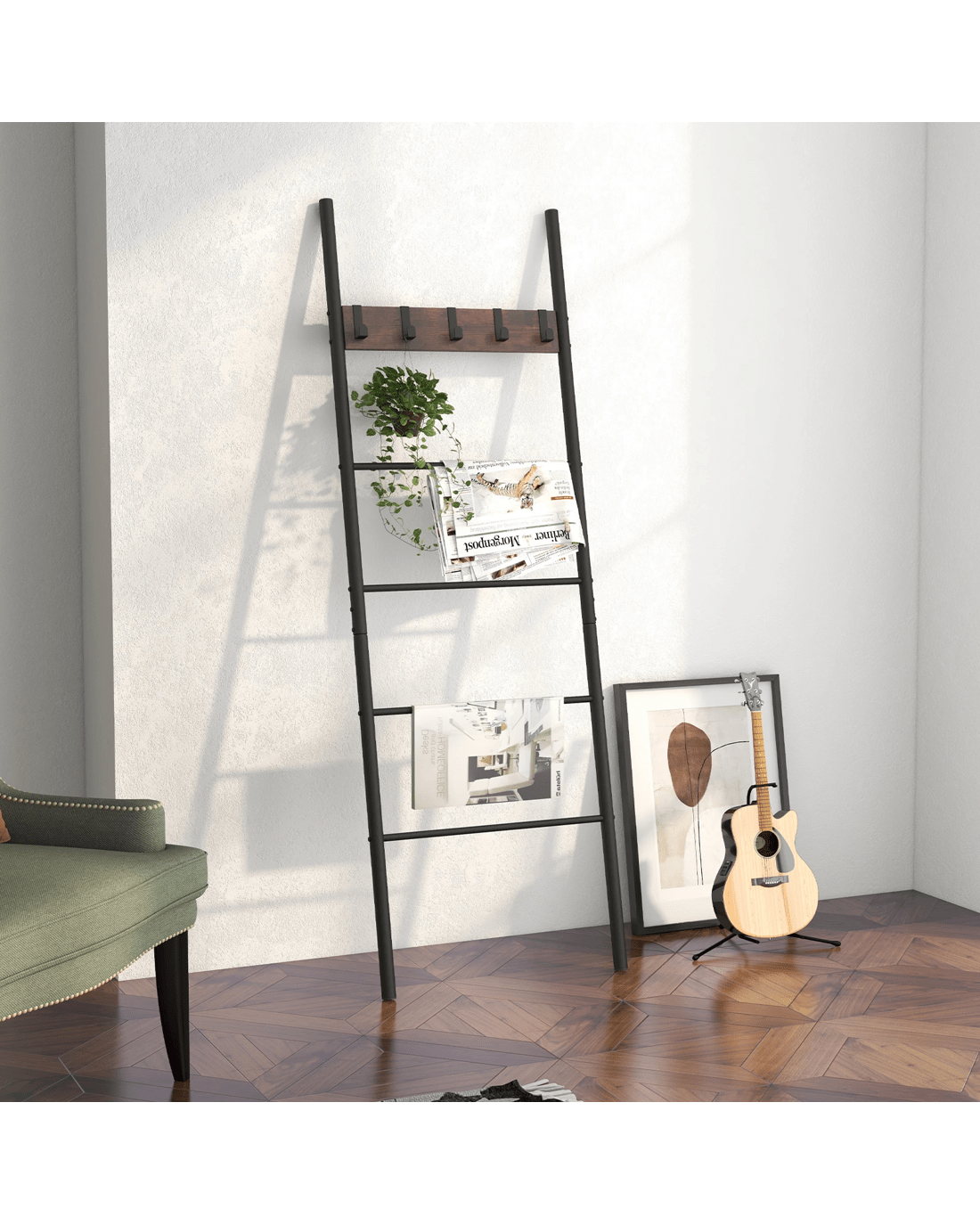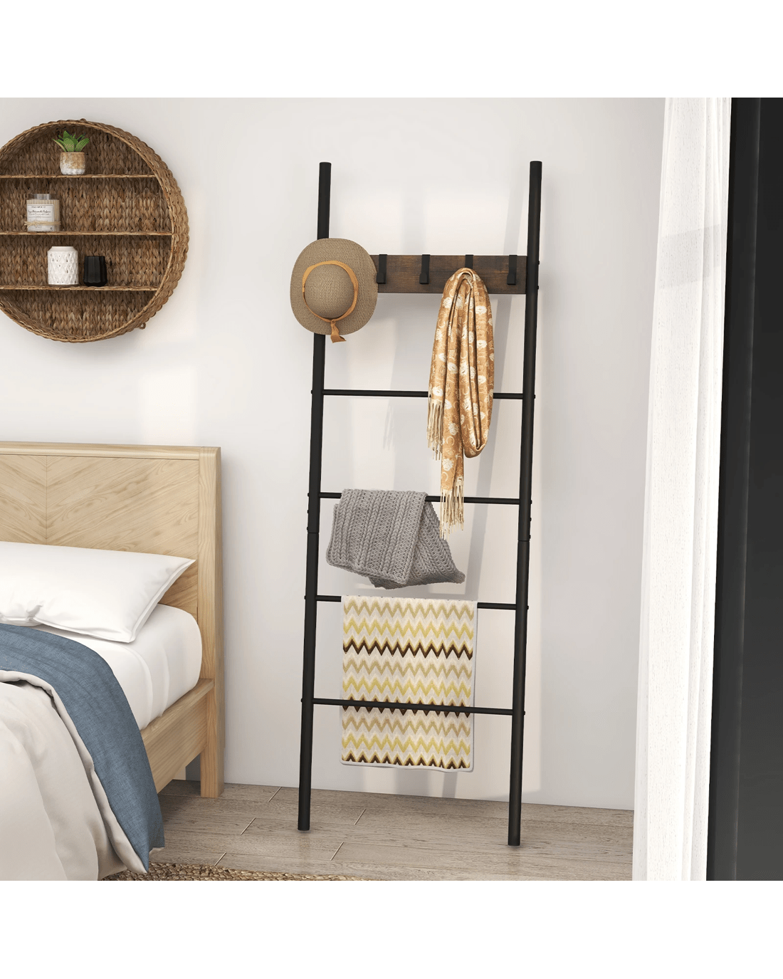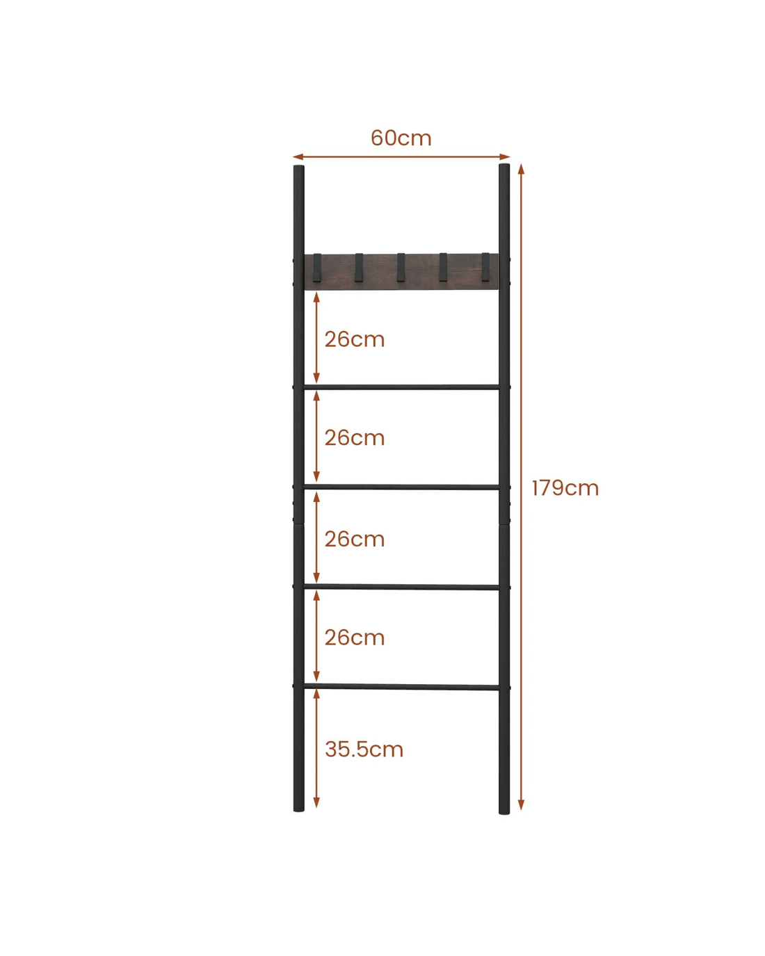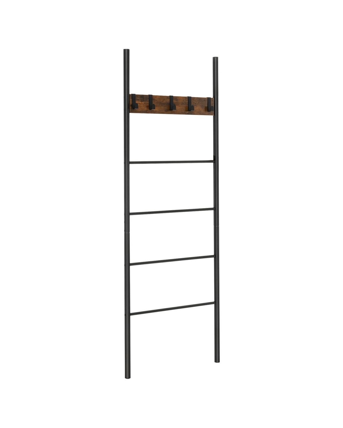 Maximize your space in style with our versatile 5-tier blanket ladder! Whether you need to organize your cozy blankets, stylish towels, clothes or newspaper, this ladder has got you covered. Plus, the 5 removable hooks offer even more convenience for hanging lightweight items! Designed with small spaces in mind, our leaning ladder shelf is perfect for apartments, dorm rooms, and small living areas. Crafted from sturdy and durable materials, it can easily handle heavy blankets and towels without warping or bending. Moreover, the non-slip foot pads can help keep the ladder in place. And with its warm brown board and charming black finish, it adds a touch of rustic elegance to any room. Don’t miss out on this incredible storage solution!