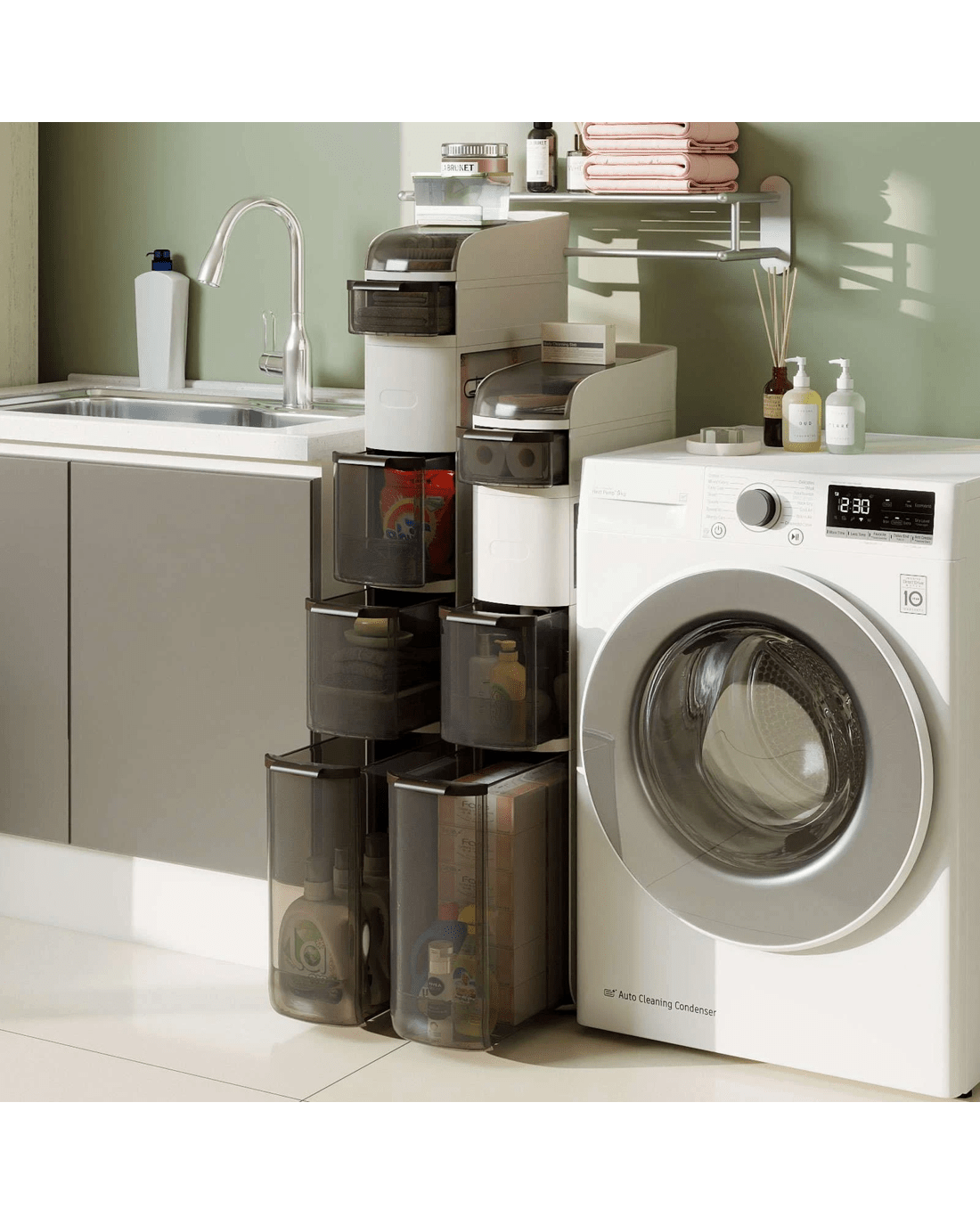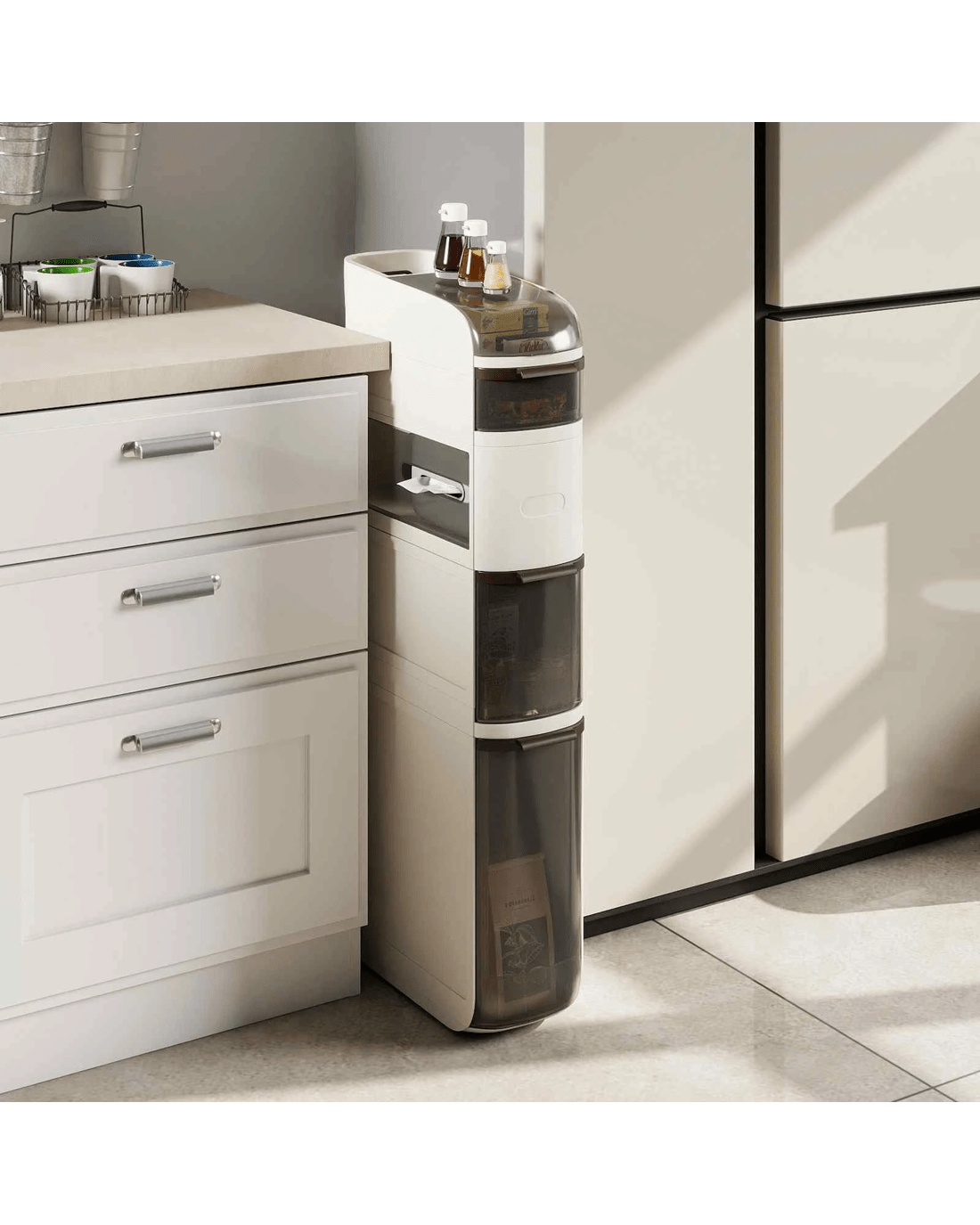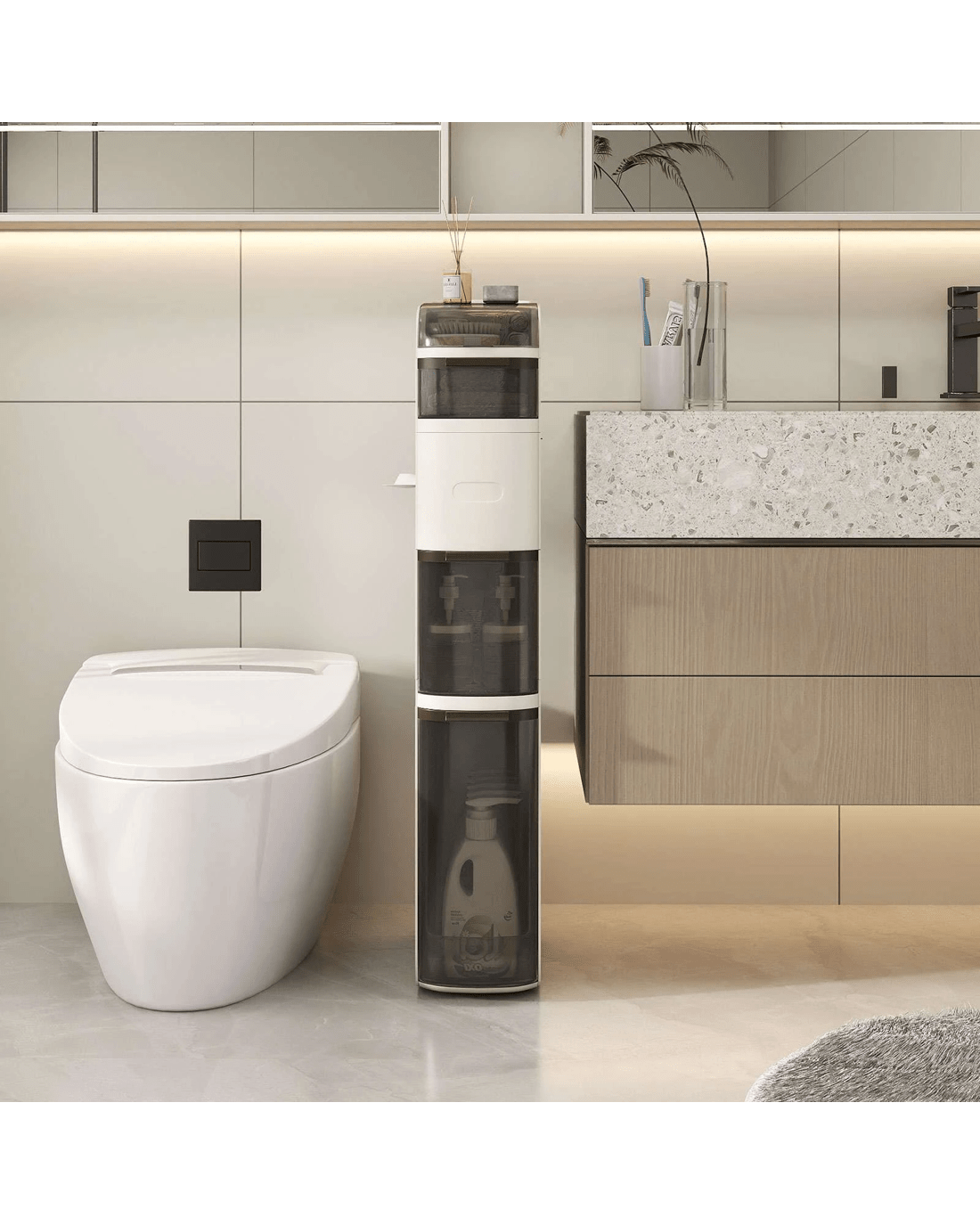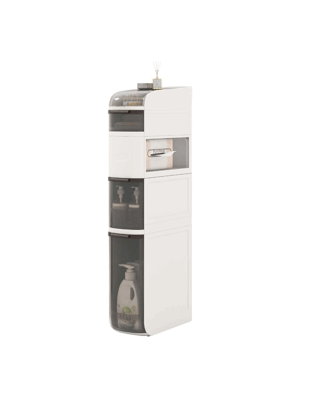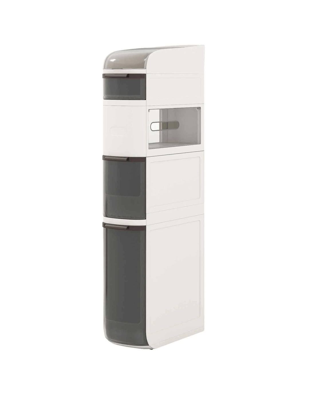 This narrow storage cabinet features thoughtfully classified storage areas, including a flip-top lid, double tissue outlets and see-through drawers, ideal for organizing items of different sizes and heights. Meanwhile, with a width of 17.5cm, it takes up little floor area while providing ample storage, maximizing vertical space. Additionally, its high-quality plastic construction is both enduring and water-resistant, ensuring easy maintenance and cleanliness. There are more thoughtful details. The raised edges protect your items, keeping them secure and in order. Its 4 smooth-rolling wheels and integrated handle also offer effortless maneuverability, making it a convenient addition to your bathroom, laundry room, kitchen and living room.
