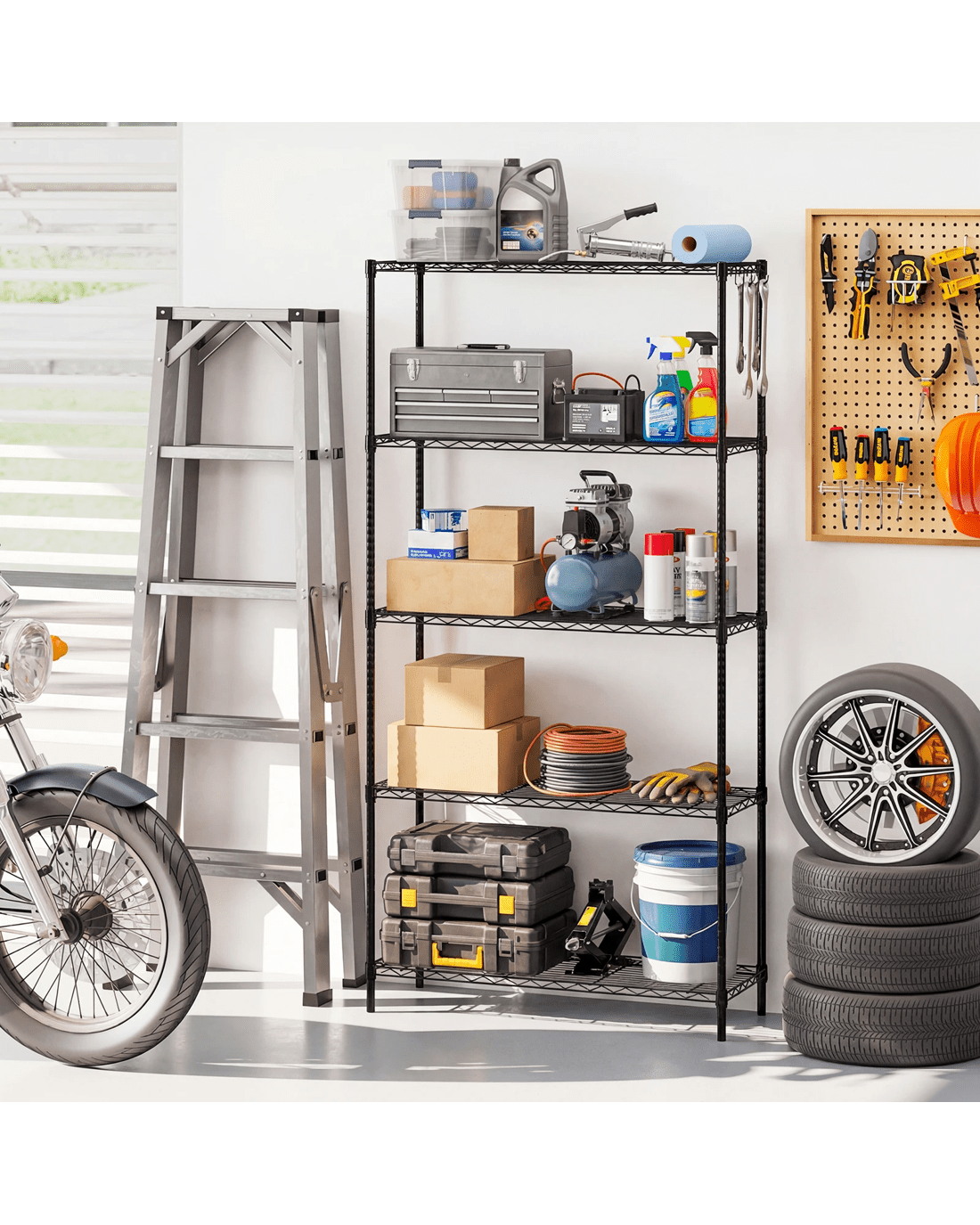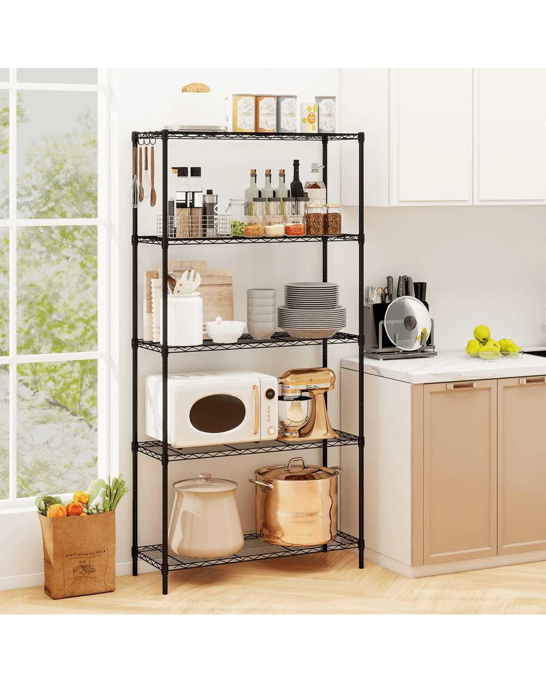 Featuring thickened metal tubes and reinforced V-shaped mesh, this 5-tier heavy-duty wire shelving unit is strong enough to support up to 565 kg in total. With easy height adjustment, you can customize the shelf spacing for items of any size, ensuring versatile storage options. Moreover, it includes 4 practical hooks for extra hanging storage options. The leveling feet keep the unit stable on uneven surfaces, and 2 anti-toppling kits add extra security. Thanks to its tool-free assembly, you can quickly change the layout to suit your space and needs. This shelf organizer with more user-friendly details is a great addition to your kitchen, pantry, garage, or basement.