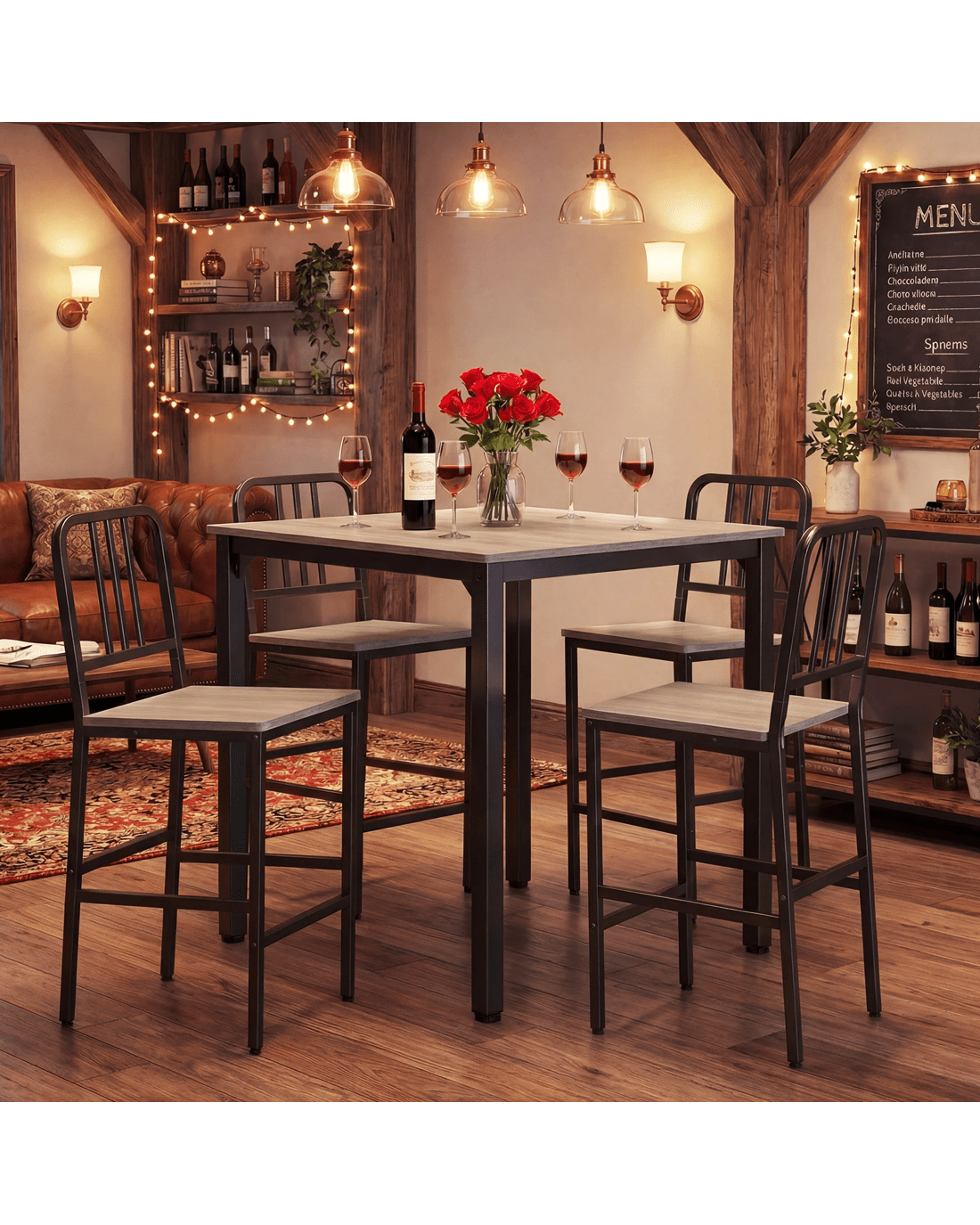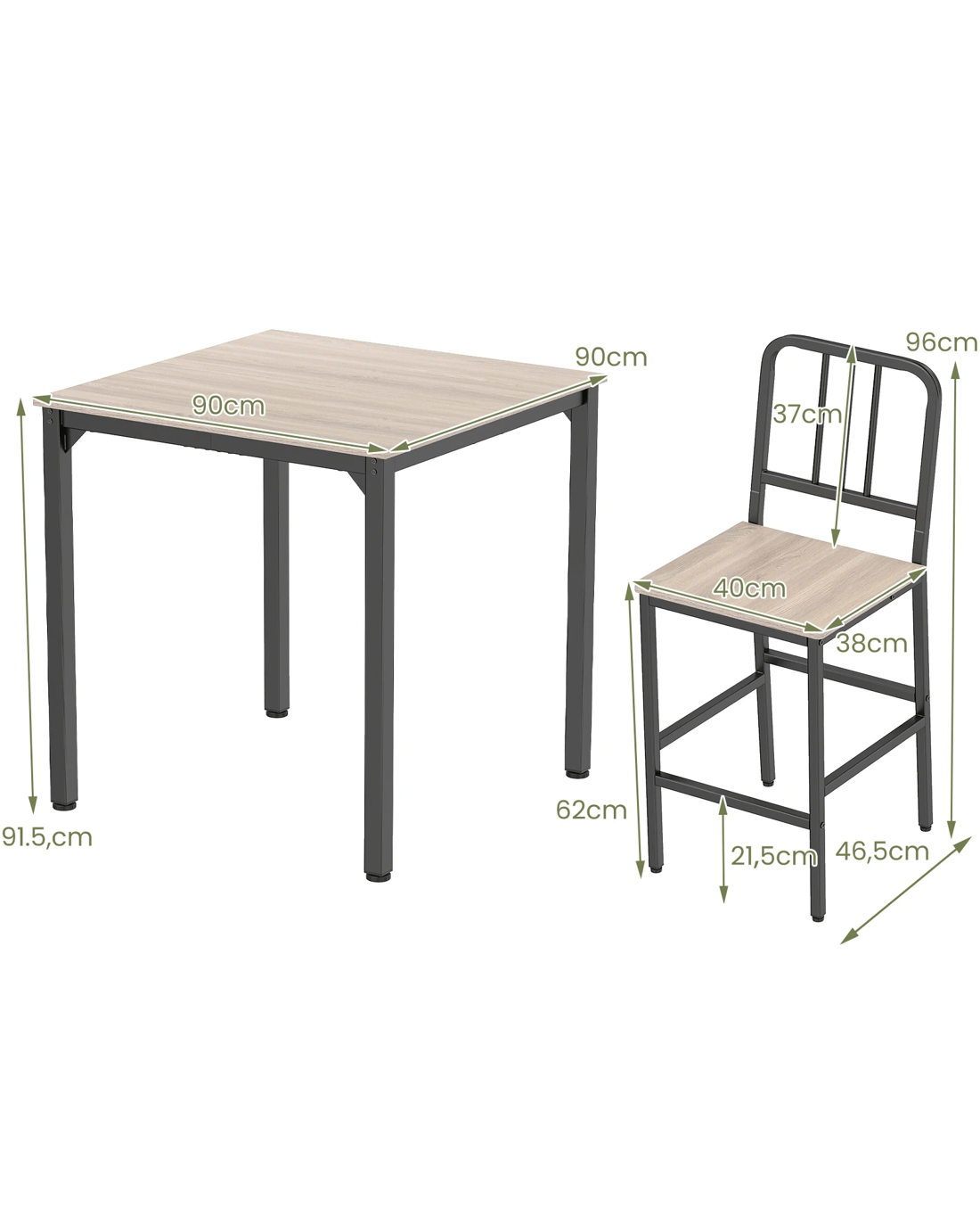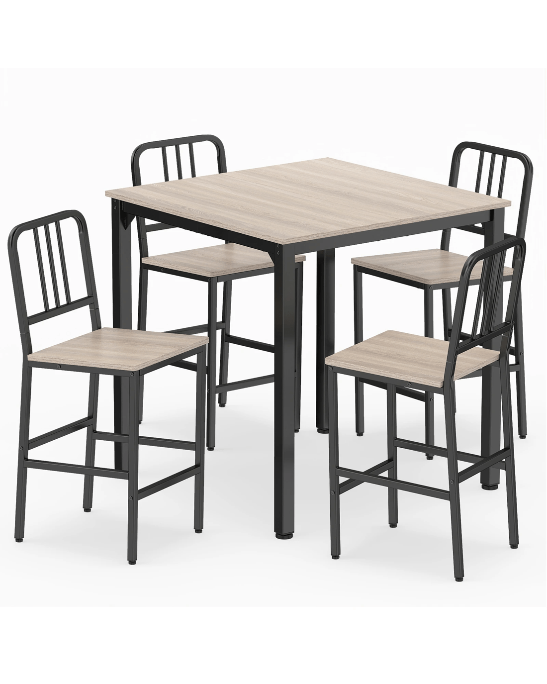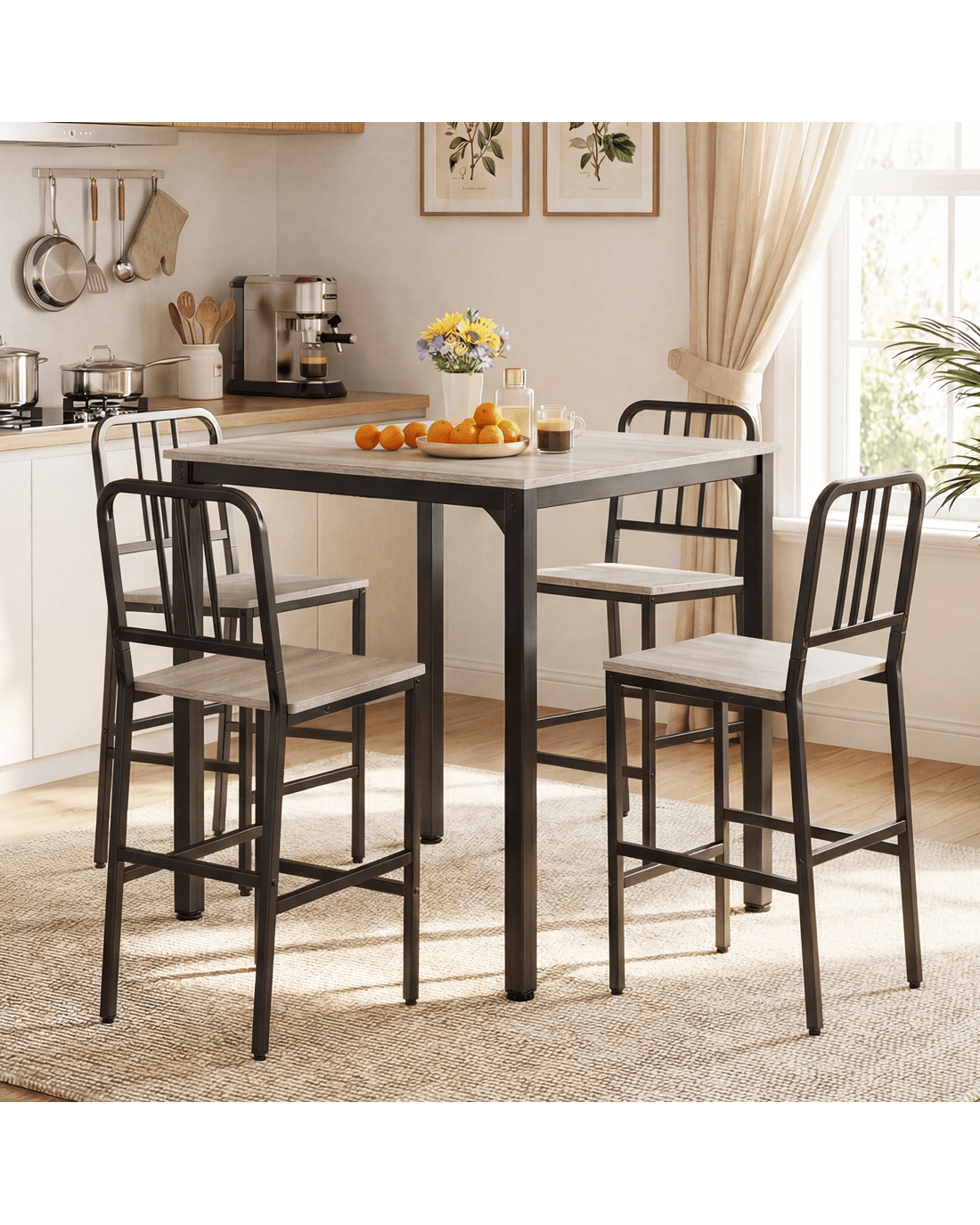 This space-saving dinette set features a spacious 90 x 90 cm square tabletop that provides ample room for meals and activities. 4 ergonomically designed bar stools with inclined backrests, wide seats and built-in footrests ensure comfort during extended use. The stools can be conveniently pushed under the table when not in use, effectively maximizing your indoor space. Built with sturdy metal frames and robust wooden boards, this tall kitchen table with stools is reinforced with crossbars and adjustable foot pads for enhanced stability and long-lasting performance. Additionally, the elegant wood-like surface adorned with grey and black accents brings a rustic touch to your room.