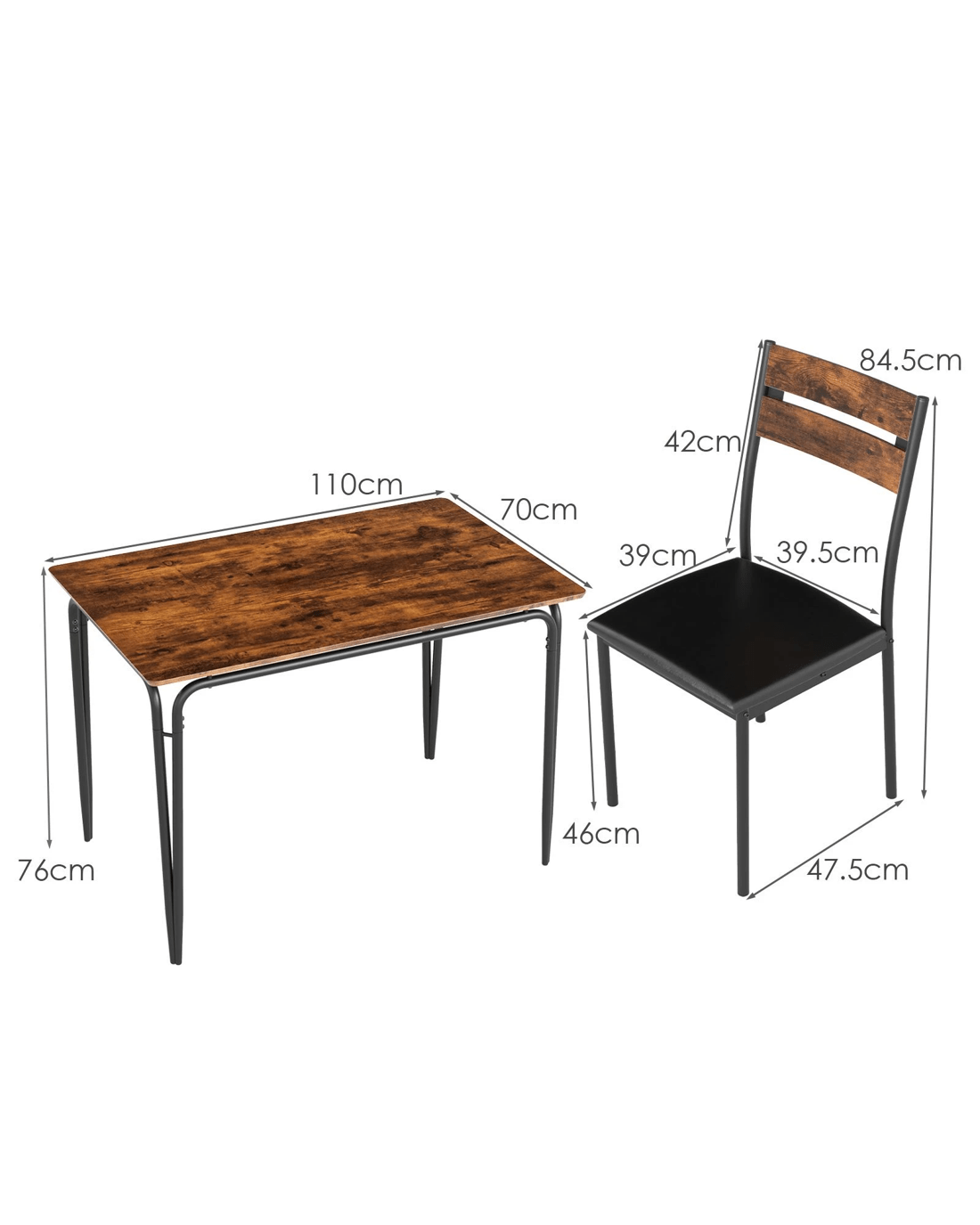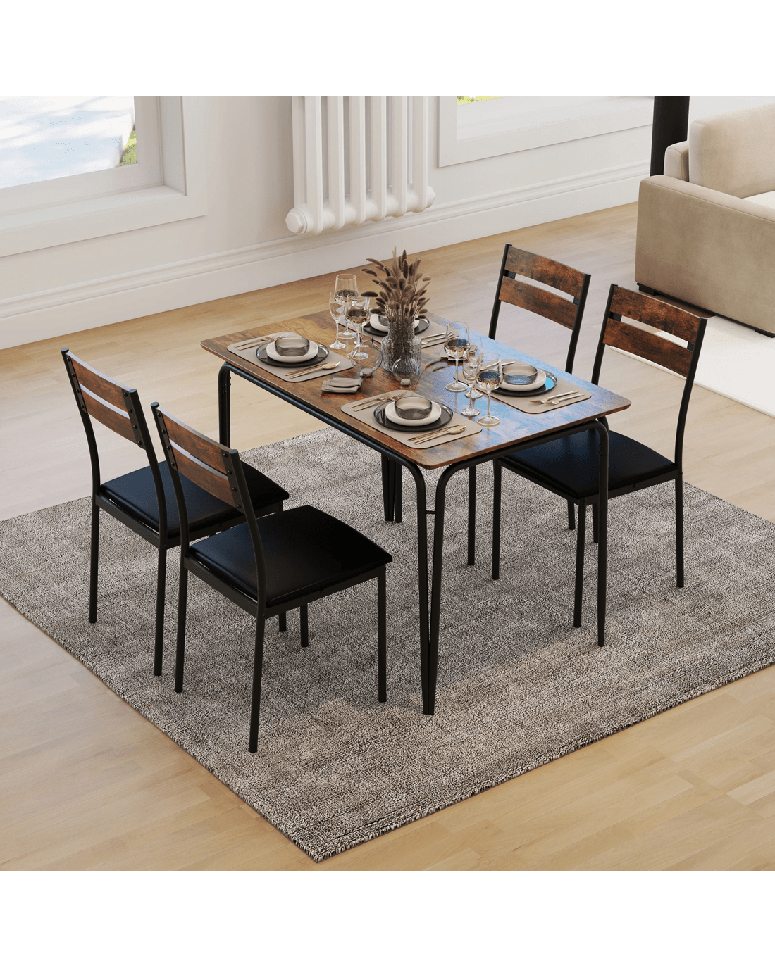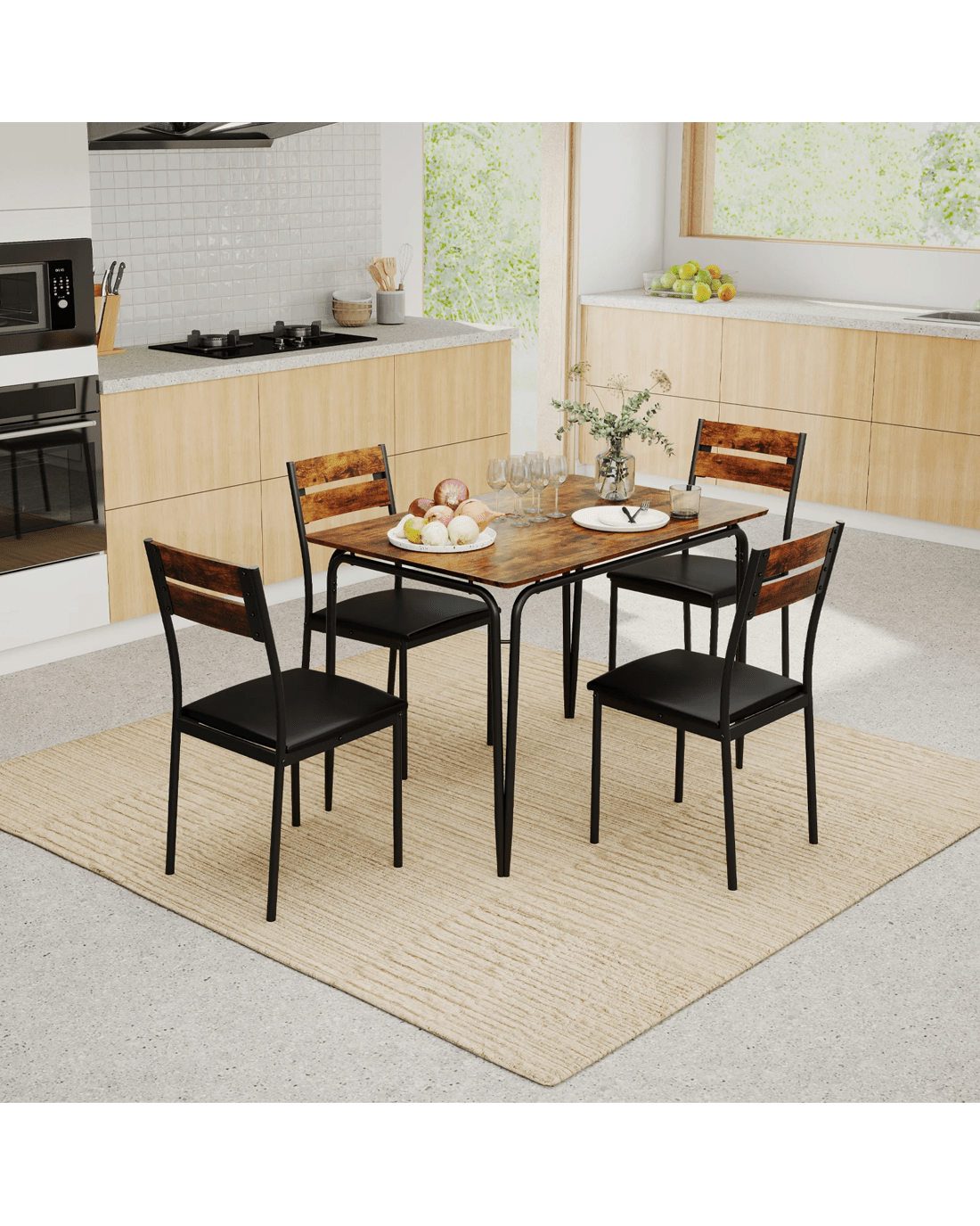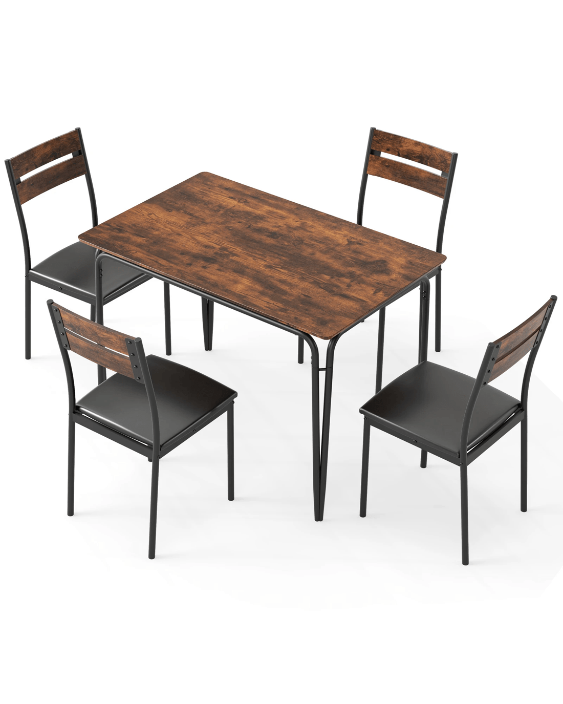 Crafted with comfort and style in mind, the ergonomic backrest of the chairs perfectly contours to the body, providing optimal support during long dining sessions. The seats are upholstered in waterproof PU leather and filled with sponge, offering upgraded comfort. Constructed with a robust metal support frame, the kitchen dining set ensures stability and durability for years to come. Non-slip foot pads protect your floors from scratches. Plus, the 4 dinette chairs can be conveniently stored under the table after the meal to save space. With rustic wood-like texture on the tabletop, the 4 people dining set is ideal for various settings, including the kitchen, restaurant, and apartment.