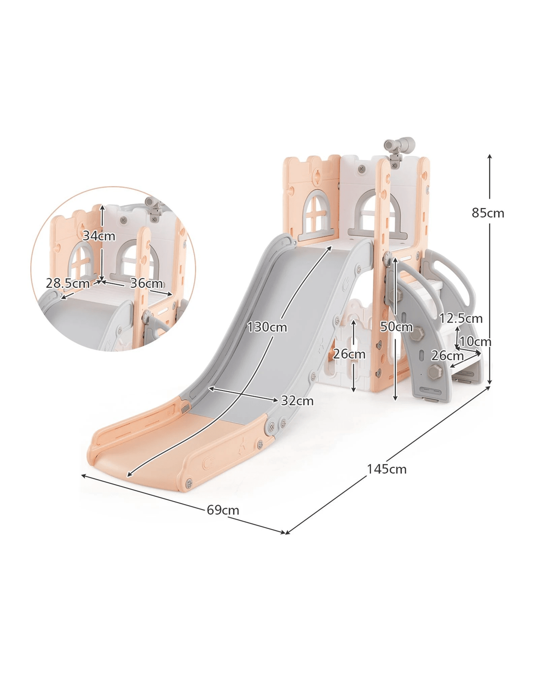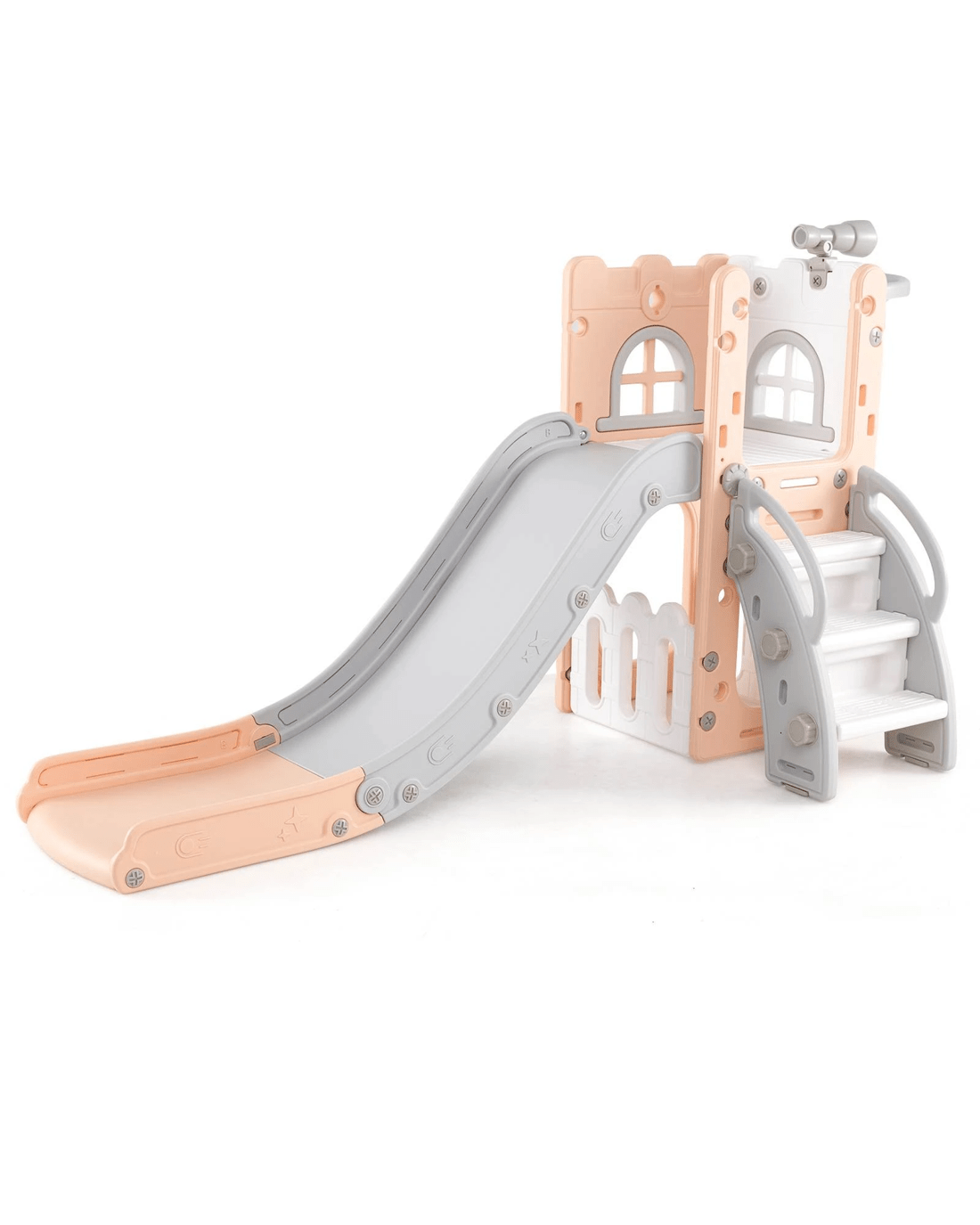 This multifunctional playset features a telescope, climber, basketball hoop, hiding spot, and storage area, providing endless fun and adventure. Experience the thrill of the acceleration zone, the enjoyment of a smooth, gentle deceleration zone, and the secure stop in the buffer zone with our advanced security slide. Built with Safe Fully Enclosed Pedal, this slide ensures the utmost security during play. Its triangle-shaped structure with heightened handrails and an extra-wide waiting area ensures stability and added security, making it a trusty backyard companion for any parent. Crafted from HDPE materials, this slide is safe. The perfect gift for enhancing motor and social skills, it promotes healthy growth and active play while fostering enjoyable and safe youth experiences.