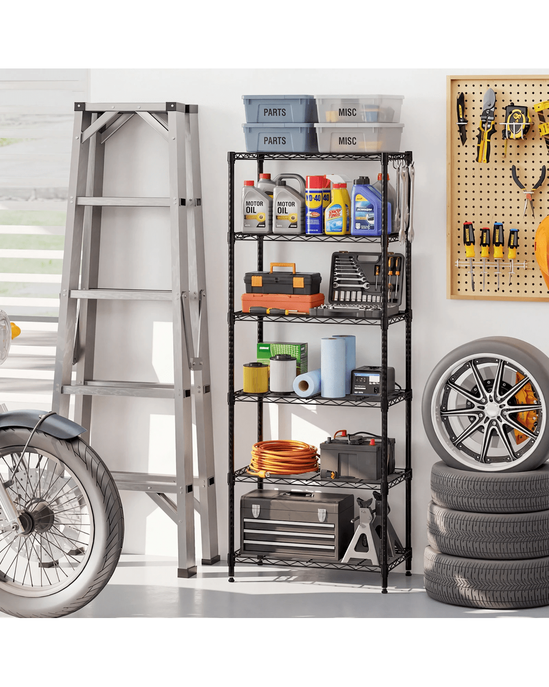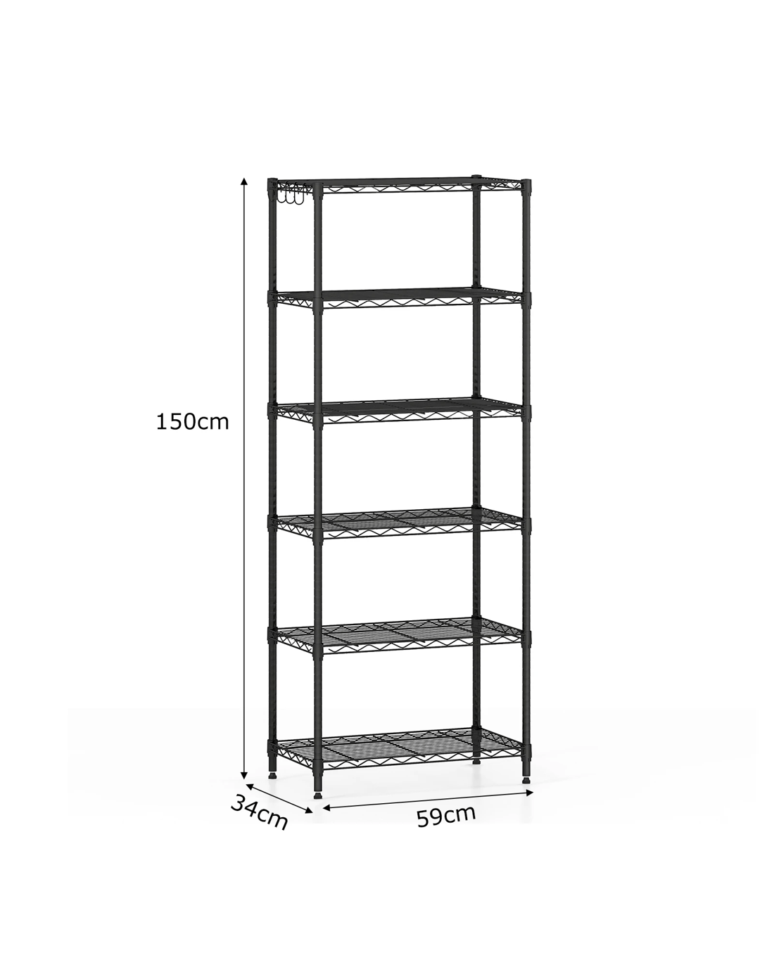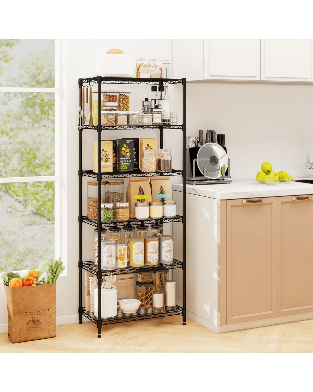 Featuring thickened metal tubes and reinforced V-shaped mesh, this 6-tier heavy-duty wire shelving unit is strong enough to support up to 408 kg in total. With easy height adjustment, you can customize the shelf spacing for items of any size, ensuring versatile storage options. Moreover, it includes 4 practical hooks for extra hanging storage options. The leveling feet keep the unit stable on uneven surfaces, and 2 anti-toppling kits add extra security. Thanks to its tool-free assembly, you can quickly change the layout to suit your space and needs. This shelf organizer with more user-friendly details is a great addition to your kitchen, pantry, garage, or basement.