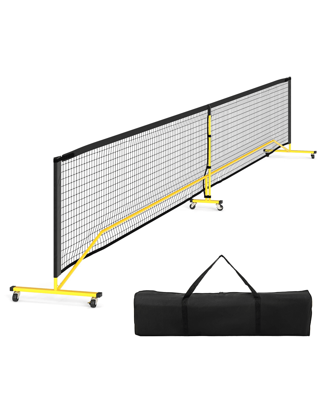 This well-made pickleball net is designed to meet official regulations with a 6.75m length. Enjoy a tool-free setup that allows you to assemble or disassemble the net system effortlessly, making it a great choice whether you're playing indoors or outdoors. The inclusion of 6 lockable wheels allows you to move the net to any location with ease. Crafted from strong PE net material and heavy-duty metal frame, this pickleball net system is built to withstand vigorous game sessions. Moreover, the complete set comes with a handy carry bag, making storage and transport a breeze.
