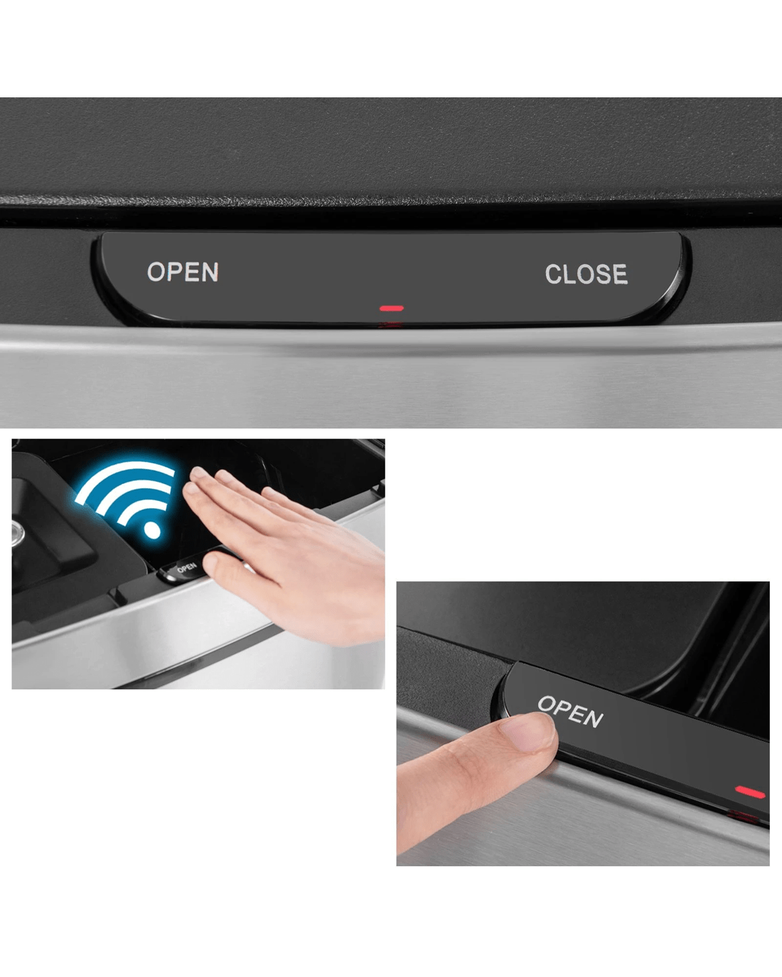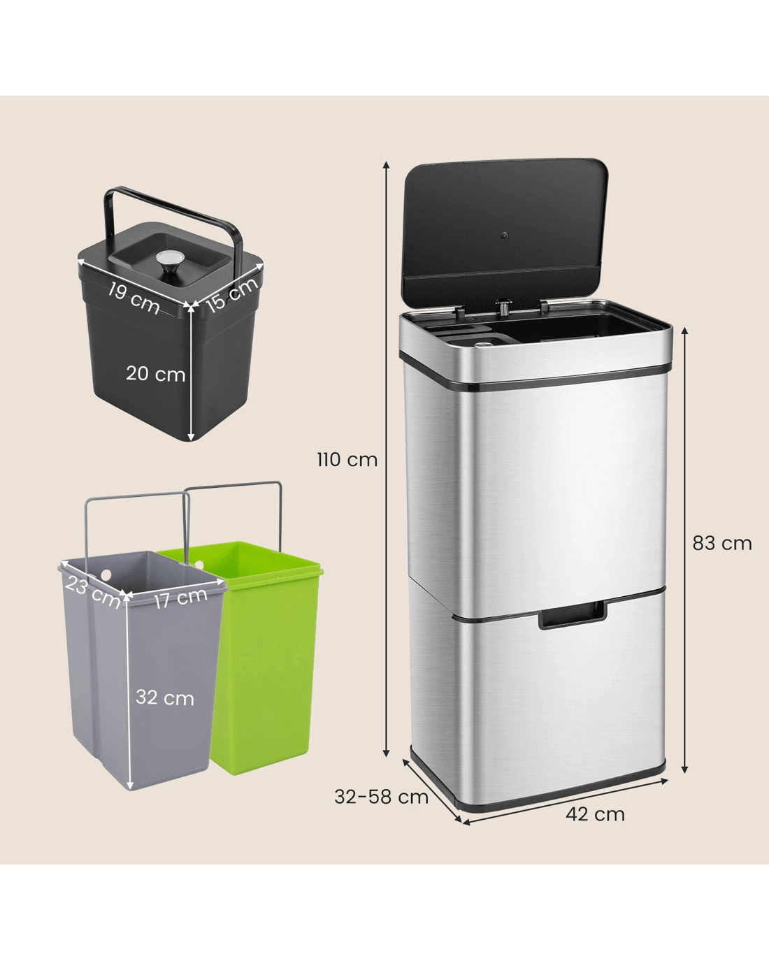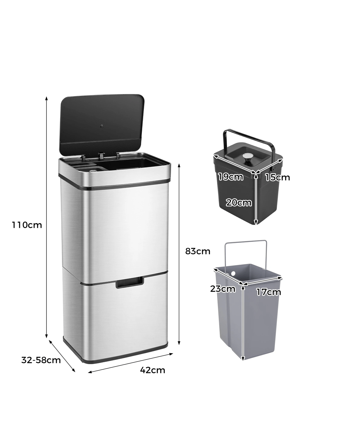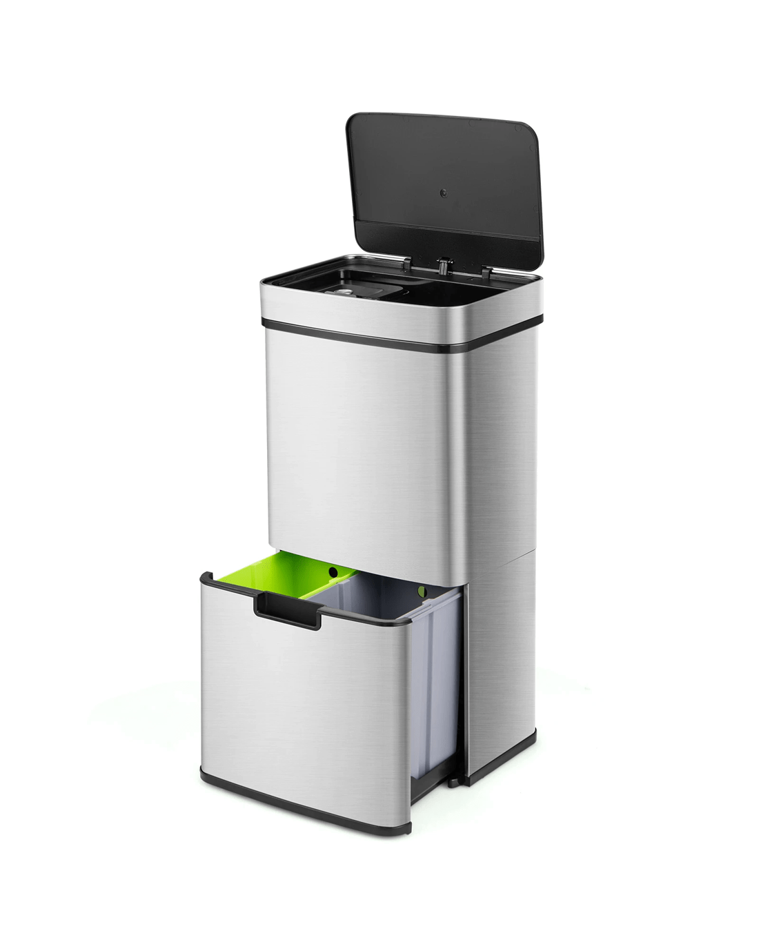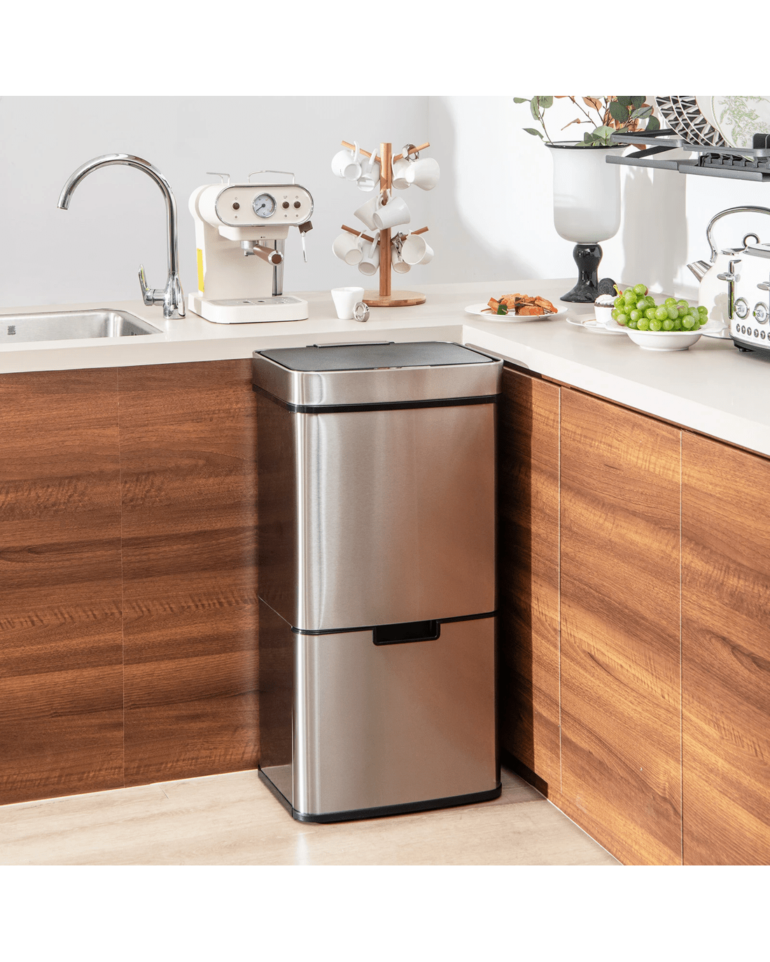 Introducing the innovative touchless motion sensor waste bin, designed to simplify waste disposal in style and convenience. This cutting-edge 72L trash can opens automatically in a swift 0.3 seconds upon detecting motion, offering a hands-free experience. It boasts a 46.5L upper compartment and a detachable 3.5L kitchen waste bin for efficient waste management. The thoughtfully crafted dual pull-out system provides 2 small removable trash cans of 11L, allowing for seamless recycling. Experience ultimate ease with the stay-open lid feature and gentle soft-closing mechanism, ensuring quiet and hassle-free operation. Crafted from a durable 3-layered stainless steel construction, this trash can resists fingerprints and offers exceptional longevity. Complete with anti-slip foot pads, this trash bin ensures floor protection.