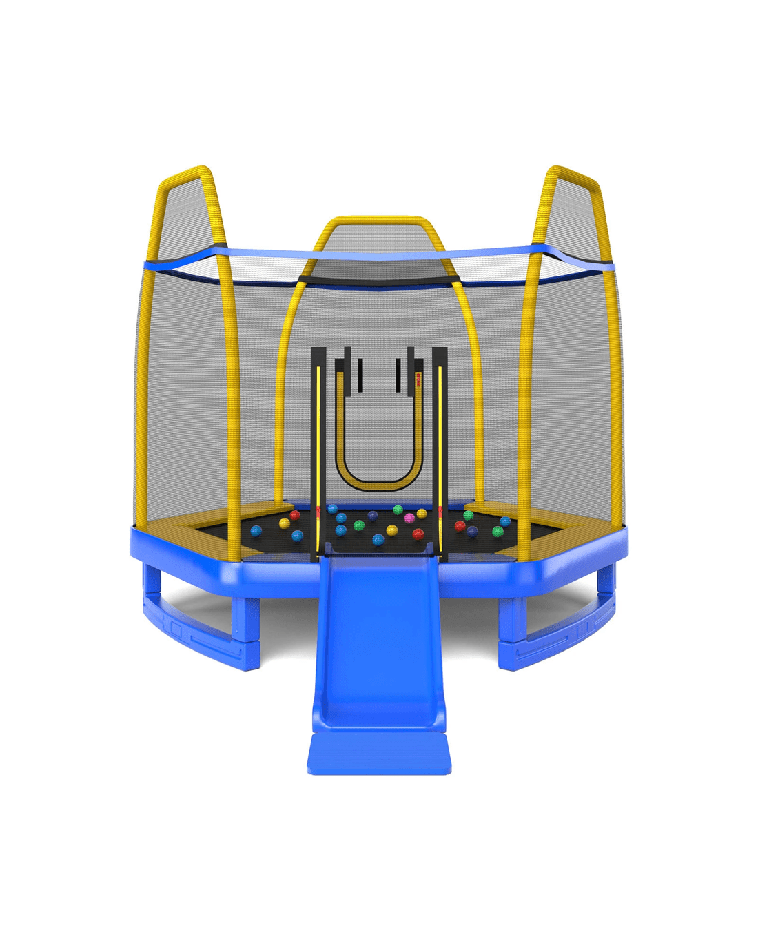The 3-in-1 design hexagon trampoline that comes with slide, ladder, oceans balls and safe anti-collision mat is a great entertainment for little ones during home break. It encourages little ones to bounce off some excessive energy, keeping away from screens and networks. There are soft-wrapped columns and dense ventilated enclosure for protection. Moreover, there's no gap between the jumping mat and the springs to eliminate pinching hazard. Besides, hot-dip galvanizing technology is adopted to grant excellent durability and high load bearing capacity to the frame, and the widened U-shaped legs keep the trampoline standing stably. Thus, feel free to use the trampoline in the backyard, playground or any other scenarios.
