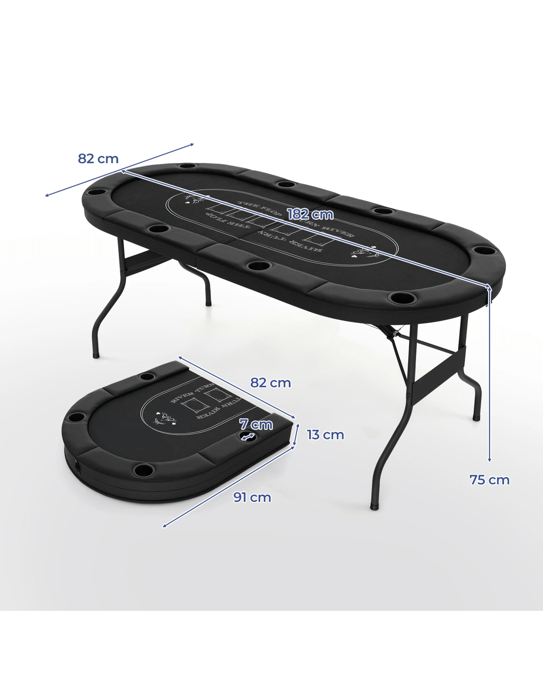 Our 182 cm foldable poker table accommodates up to 8 players, which can be an ideal choice for family gatherings, entertaining friends, bar games, and more. When not in use, you can easily fold the table into a flat size, storing it in the closet, behind the door, under the bed, or in your vehicle. To enhance comfort and gaming experience, the poker table is equipped with padded railings for comfortable support, and 8 deeper metal cup holders for conveniently and safely keep drinks. Besides, the premium casino-grade felt surface completes the professional look, providing a smooth playing area and reducing noise from card shuffling. Elevate your gaming experience with this reliable and chic poker table.