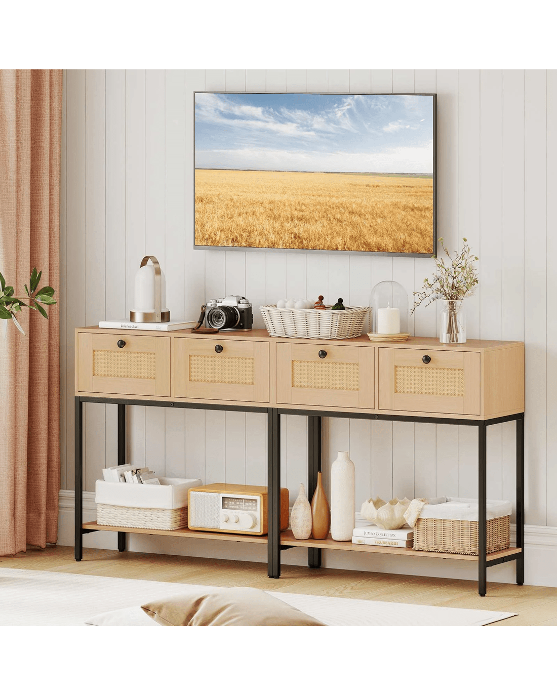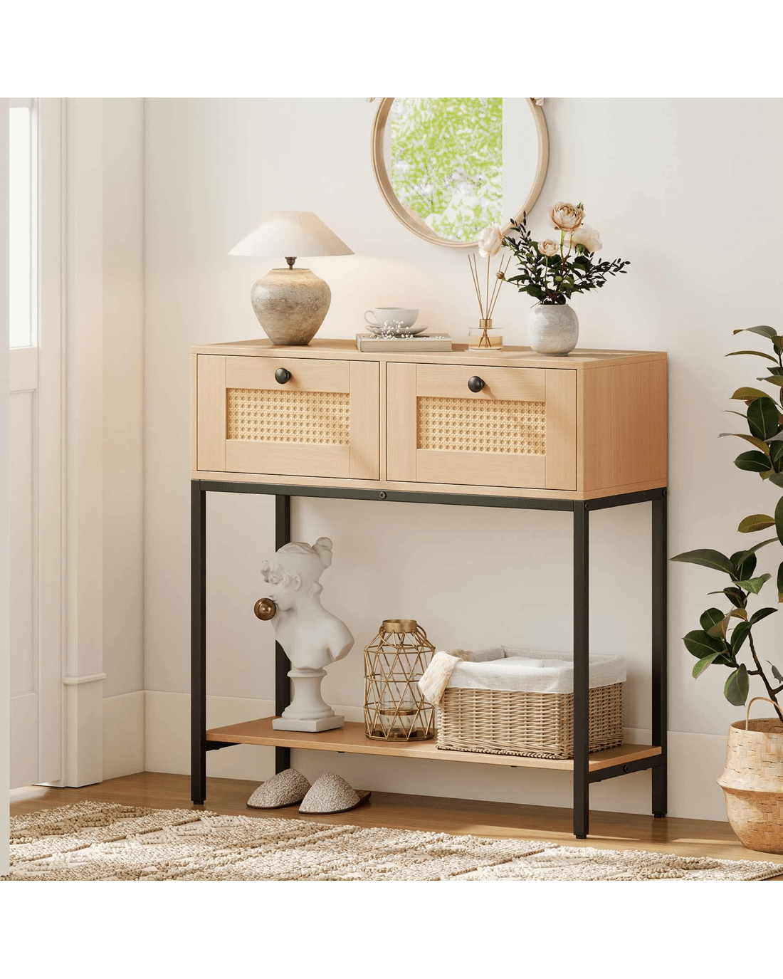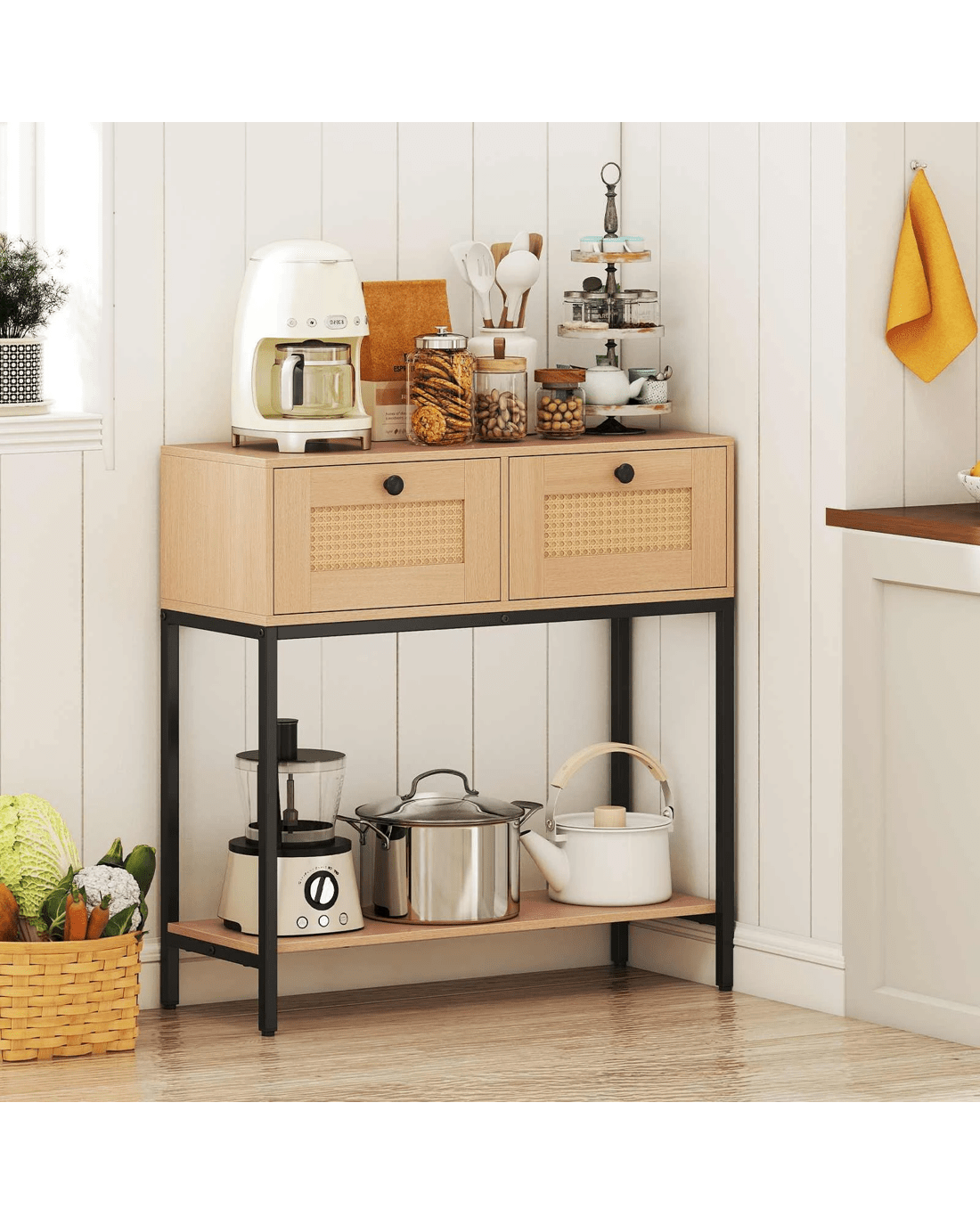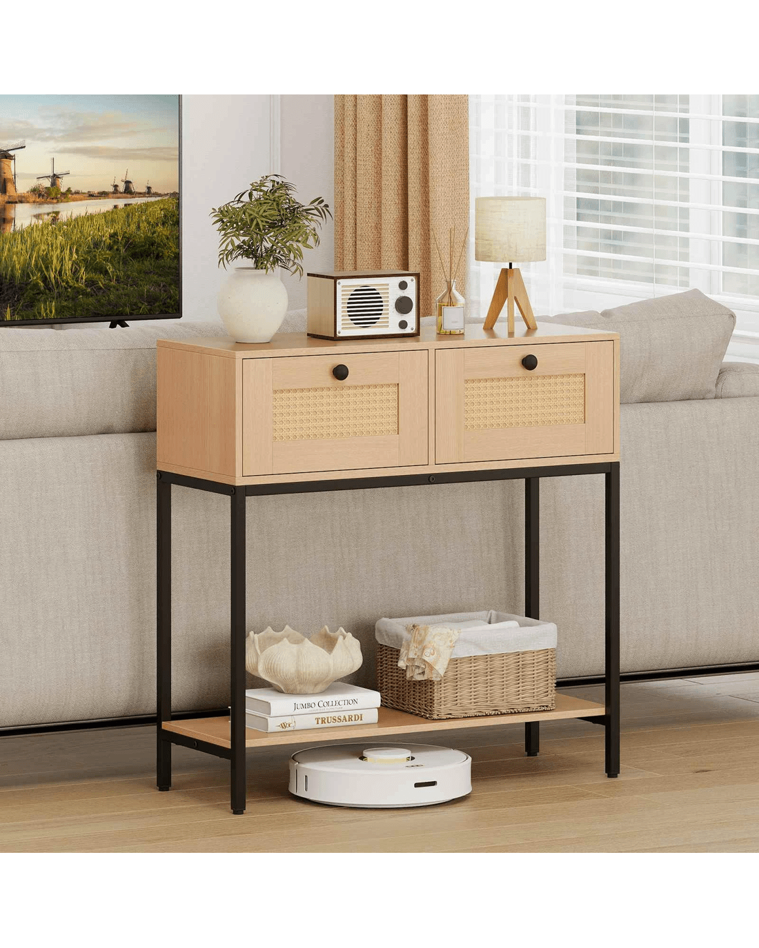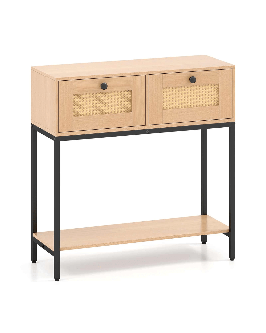 Costway 80cm 2-Tier Boho Console Table Wooden Hallway Sofa Table w/2-Drawer