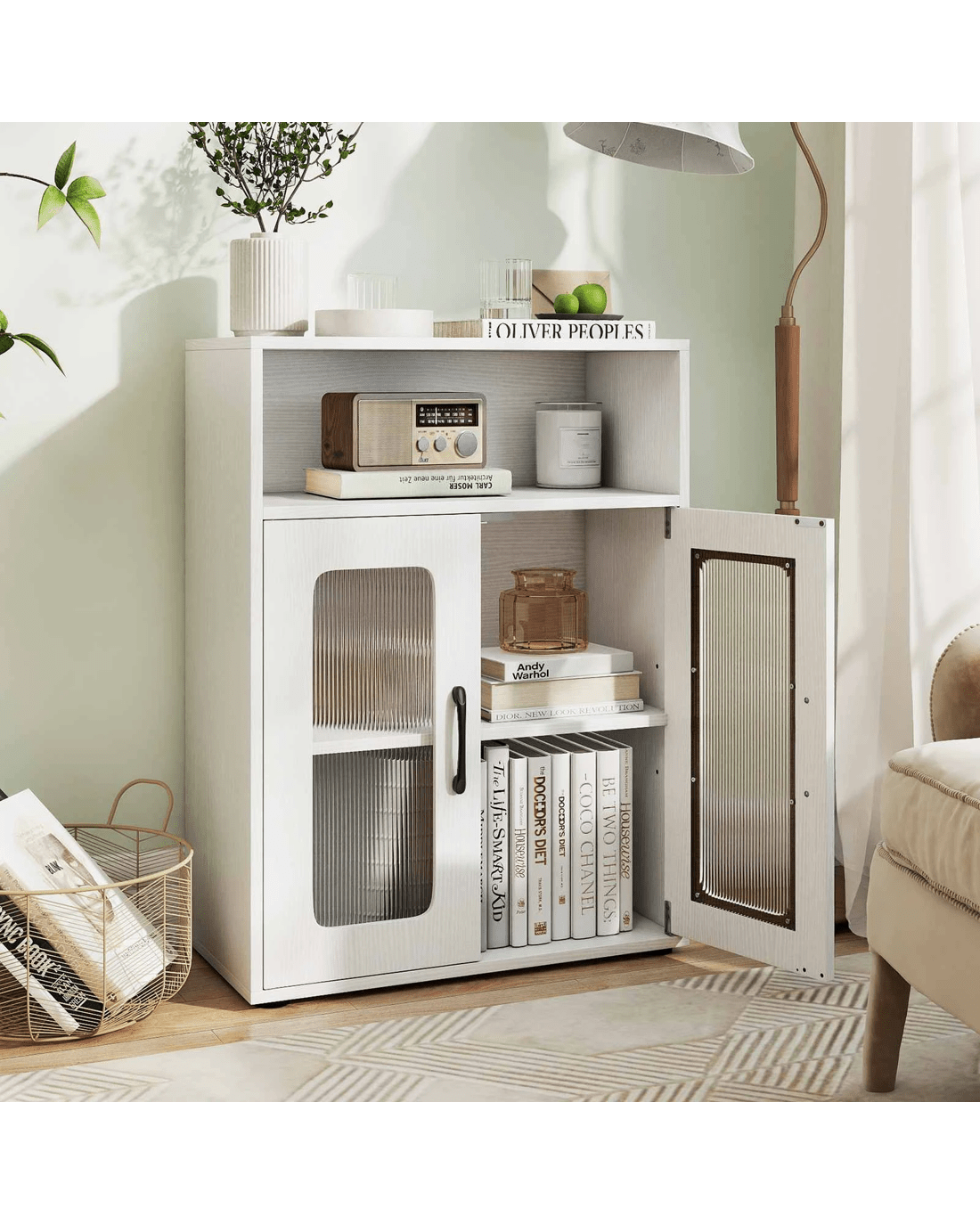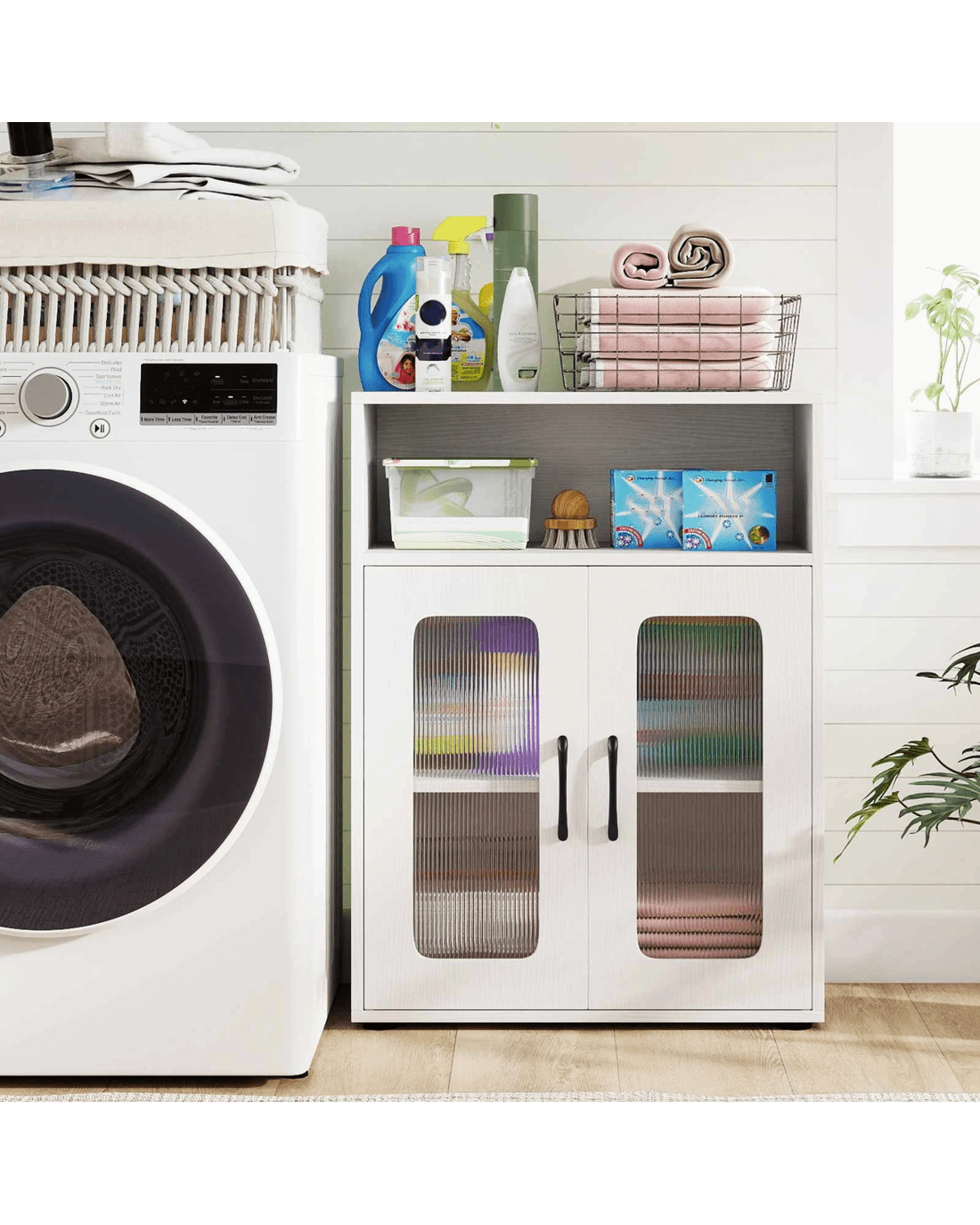 The freestanding storage cabinet brings both style and functionality to your room. With 1 cabinet, 1 countertop, and 1 compartment, the storage cabinet provides versatile storage options to keep your essentials neatly organized. The 3-position adjustable shelf allows you to customize the interior layout based on your storage needs to hold items of different sizes. Sturdy legs and anti-toppling system ensure excellent stability and security. Moreover, elevated legs help protect against wet ground, making it ideal for kitchen or laundry room use. Whether placed in the kitchen, living room, or laundry area, the storage cabinet offers a practical solution to declutter your home while complementing existing decoration.