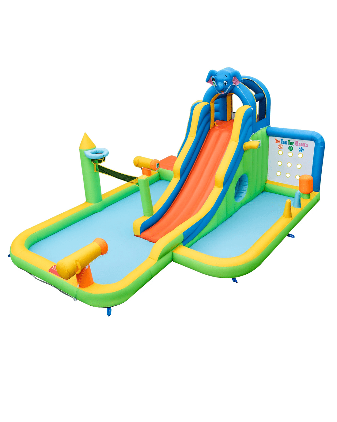 The 378 x 469 x 250 cm (L x W x H) giant water park features 9-in-1 design, including the ring toss game, basketball hoop, volleyball area, dual water cannons, climbing wall, water slide with raised guardrails, ball shooting, tunnel, and entertaining ball pit, your little ones are sure to be captivated by a multitude of exercise and exploration possibilities.The safe, durable & cute water slide has a total weight limit of 90 kg, individual weight limit of 45 kg(Only the inflatable part has a weight limit). When not in use, you can quickly deflate it and pack it in the carrying bag for easy storage and transportation.