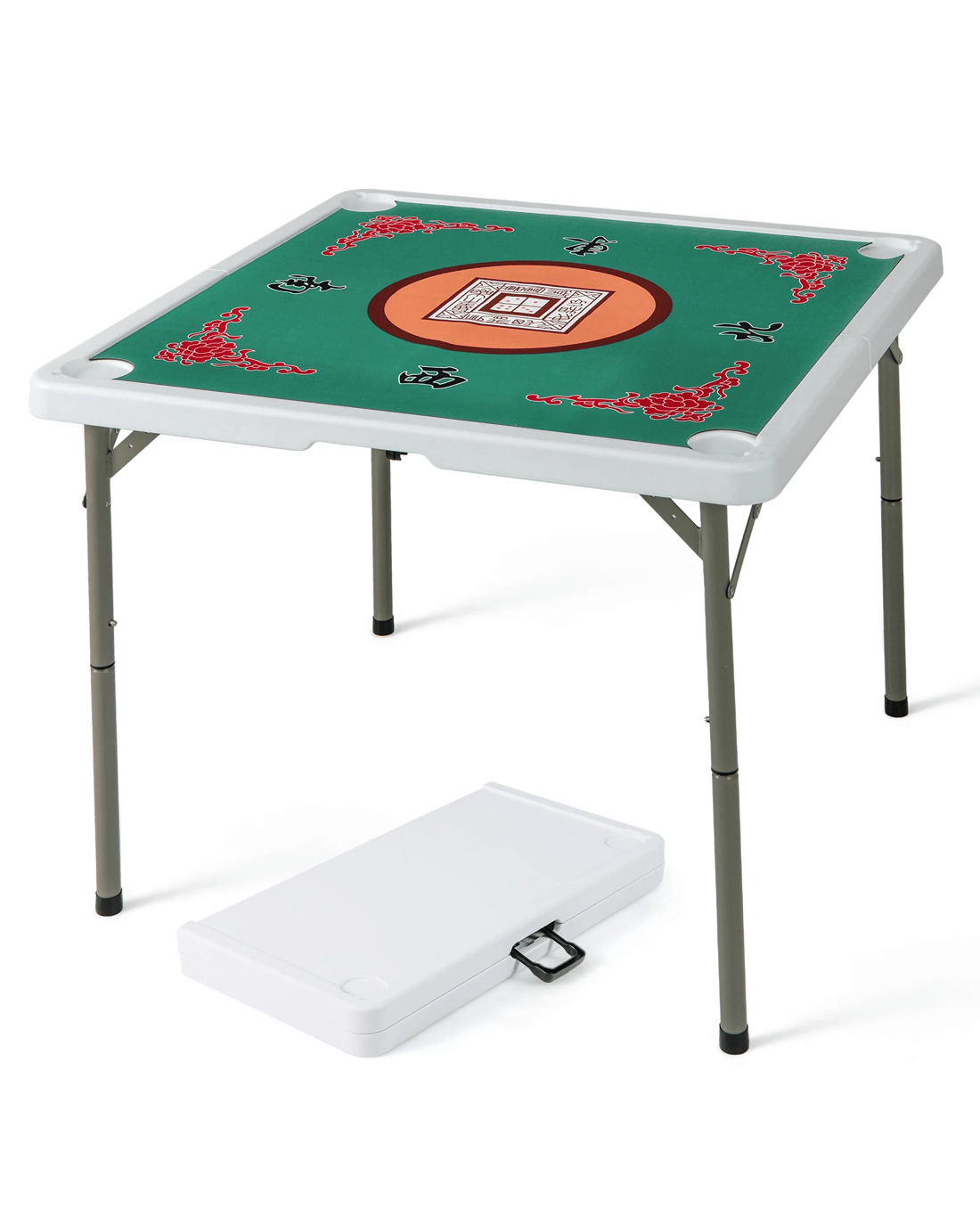 This foldable mahjong table is perfect for those who value ease of storage and transport. When not in use, it folds into a compact size and comes with abuilt-in handle for effortless carrying. The wide square tabletop offers a spacious 90cm wide surface, comfortably accommodating up to 4 players. Besides, the noise-reducing game mat, cup holders, and rounded corners offer a comfy and safe gaming experience. Crafted from premium HDPE and sprayed metal pipes, this folding poker table is sturdy for long time use, and it is supported by a sturdy triangular structure and non-slip foot pads for a stable play surface. Assemble this table is a breeze, simply unfold, insert the legs, and place the game mat to start your game in no time. This game table is suitable for various Scenarios, including family nights, outdoor picnics, or parties.