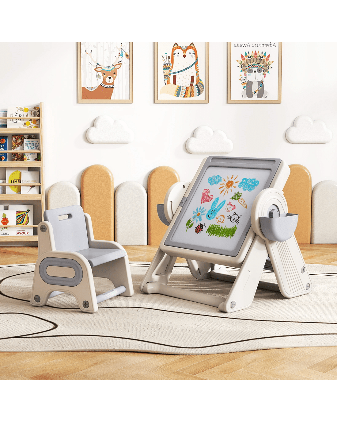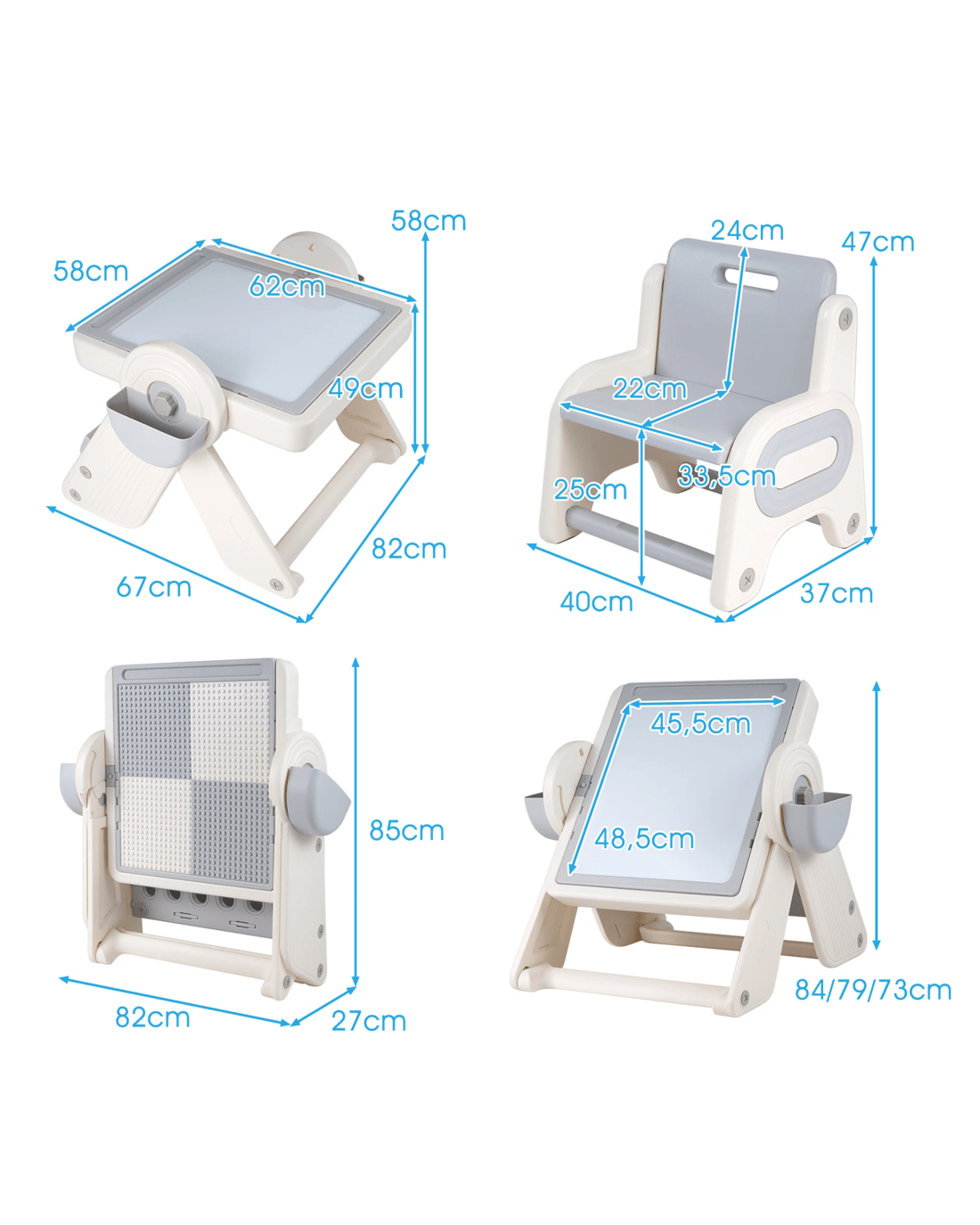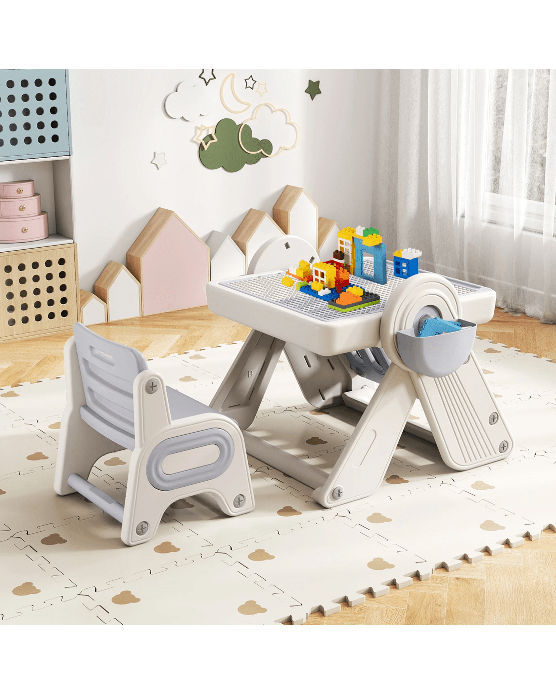 This little users' activity table comes with 9 dedicated modes for writing, painting, dining, or playing with building blocks. It also tilts into a handy art easel or block wall, and doubles as a sensory table for sand or water play. Besides, with 3 adjustable heights, it adapts to your little user's growing creativity at every stage. 2 storage bins, a secret compartment, a book rack and dedicated pen slot mean everything stays tidy and within easy reach. Built with safe, rounded edges and a secure dual-lock system, this set keeps busy little users comfortable whether they're sketching, building, or reading. And when playtime ends, it folds away in seconds, perfect for maximizing space in any little users' room, playroom, or shared family area. Let your little user's creativity soar with this art and activity table set!