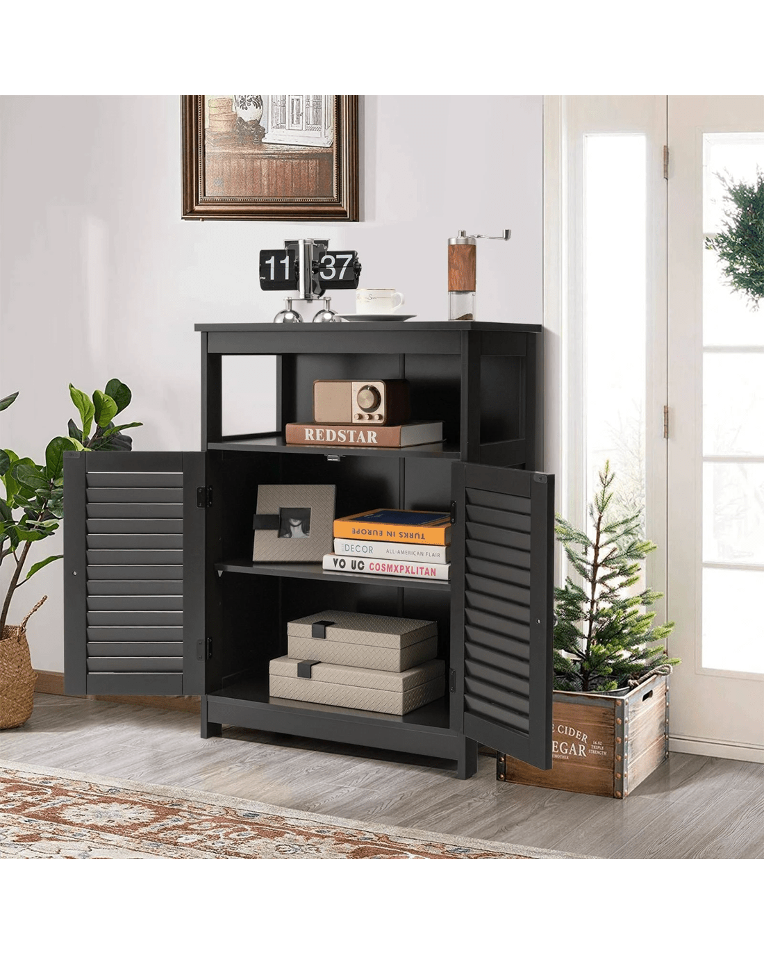 Featuring an open shelf and a double-door cabinet for ample storage