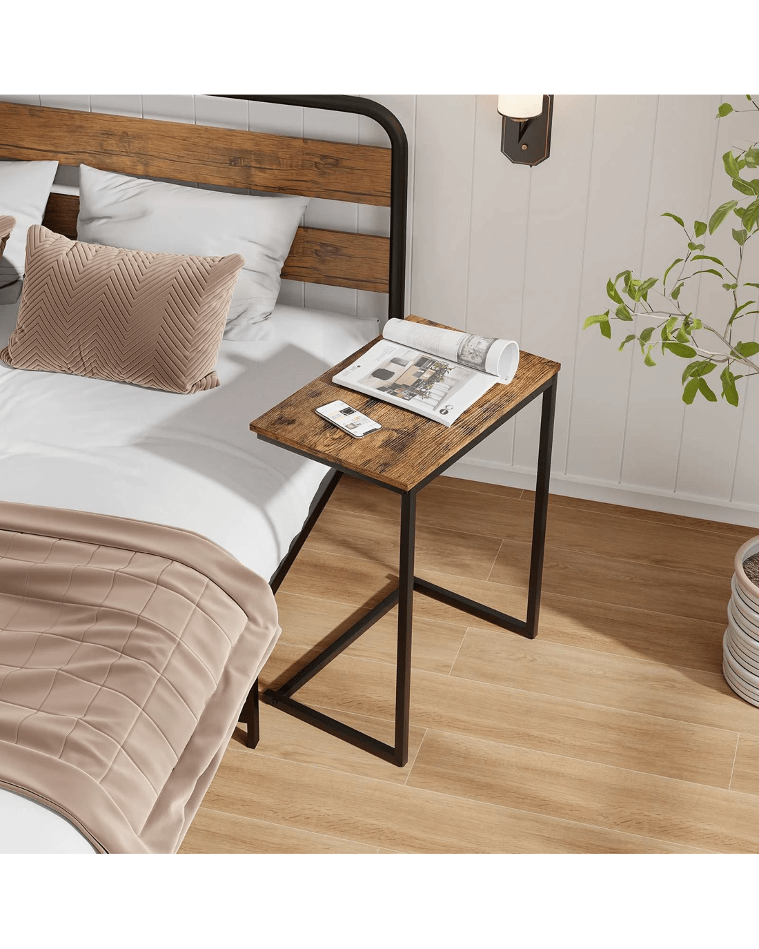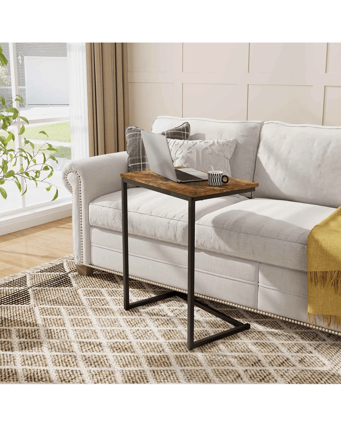 Transform your cozy nook into a haven of practical elegance with this sleek C-shaped side table! Made to slide snugly under your furniture, this wonder of space-efficiency elevates any room with its charming vintage vibe. Admire the spacious wood-grain tabletop, standing proud at 67.5cm - the absolute perfect height for your caffeinated bliss or digital wanderings. No more fretting over wobbly tables; the sturdy metal frame with adjustable foot pads boasts rock-solid stability. Revel in its effortless assembly and easy-peasy upkeep. Click and usher in the era of stylish, fuss-free living!