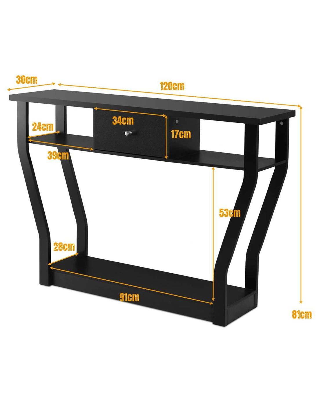 Give your guest a deep impression! Our console table is beautiful and functional, which mixes with modern and classical. So the console table can bring a different feeling to your home. The simple but practical console table features a drawer and an open shelf, making it convenient to display and store your things. On the top, you can place your table lamp to read or your photo frames to decorate; on the additional lower shelf, you can place books, magazines, etc. It saves space and helps keep your room neat. ?It is made of durable MDF with melamine is wear resistant and waterproof. This console table is hard enough to provide a lasting service. Plus, the base in the bottom ensures it¡¯s steady. And tilting prevention devices ensure security in use. In addition, this console table is easy to assemble under the easy -to -follow instruction. It is the best option for you and your family!