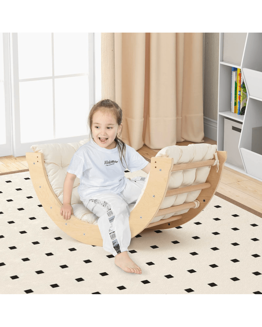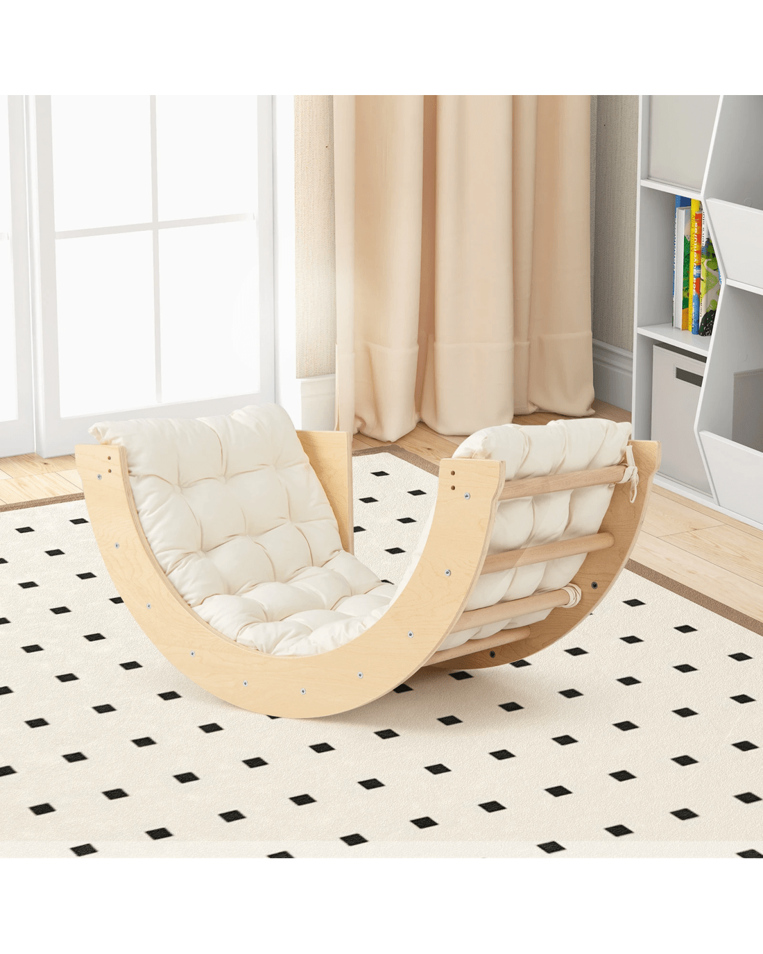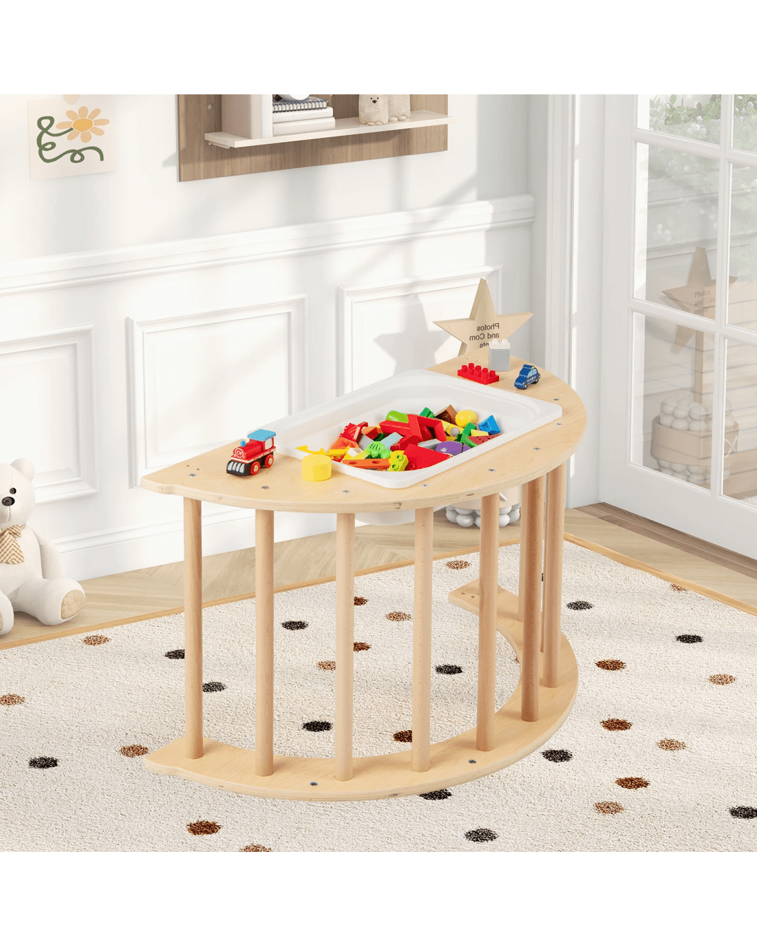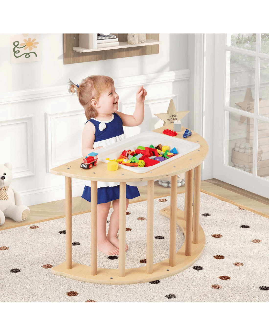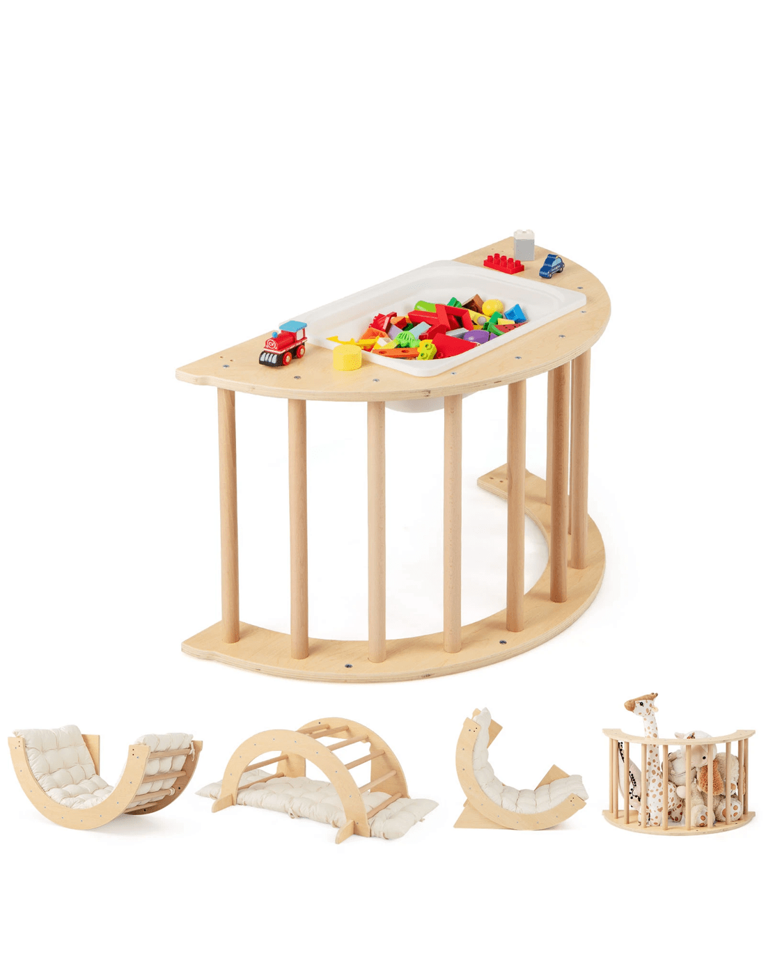 Ignite your little one’s physical activities and creative play with our 6 in 1 climbing arch! This innovative playset includes a climbing arch that doubles as a rocker when flipped over, providing a gentle motion that s will find soothing. It is complemented by a comfortable and removable cotton cushion for a softer experience. The rocker can also be turned into a lounge chair after fixing the stoppers. Additionally, it is also a little ones play table with storage bin, ideal for explorative play with sand, water, or toys, helping to enhance your little one's cognitive skills. When not in use, the storage bin can be collapsed to save space. Moreover, this climbing arch can be put at corners and serve as a storage corner for little one's toys and dolls. Crafted from solid wood, this multi-functional arch rocker ensures unmatched stability and long-lasting use.