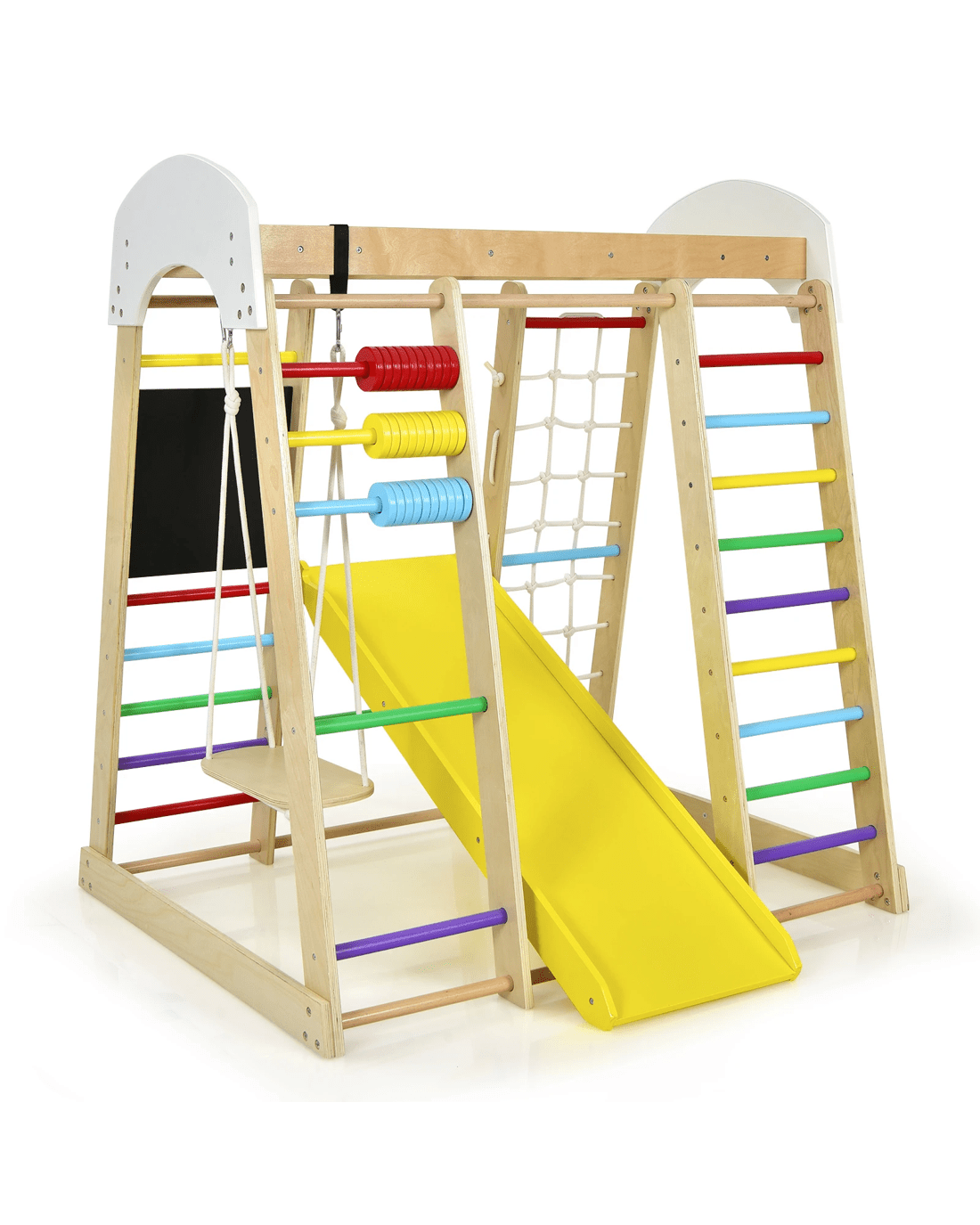 This bright and multifunctional climbing activity center will become the favorite playground for your little ones! Thanks to its high quality wood material, our indoor playground climbing playset is sturdy and durable enough for a long time service, and each part can support up to 50kg. With stable construction and solid connections between each part, this activity center is completely safe for the little ones. In addition, 8 in 1 design offers endless fun while developing the physical skills, body strength, social skills, critical thinking and creativity of your little ones. Besides, this wooden play set is suitable for indoor use. Let your little ones enjoy their youth with friends!