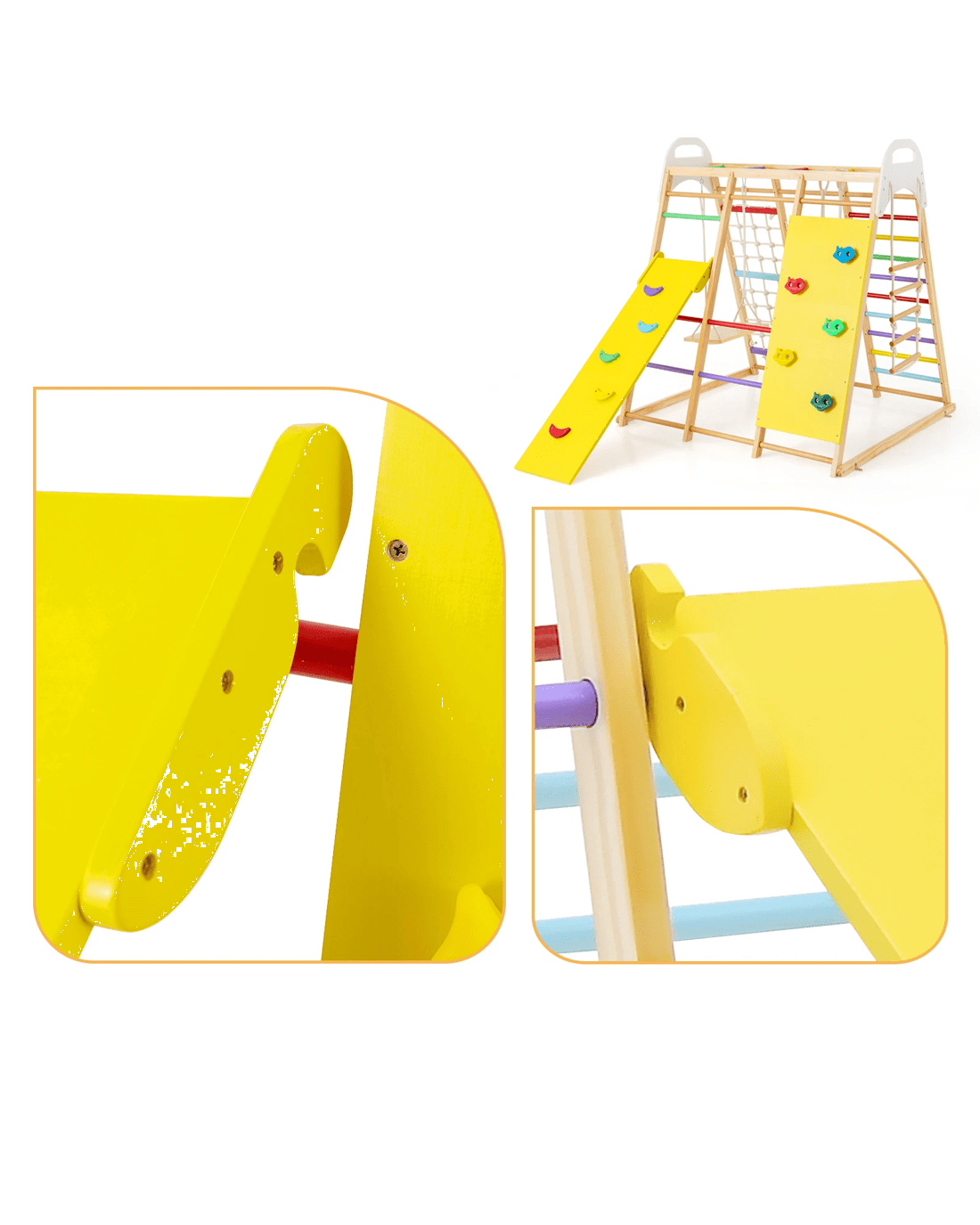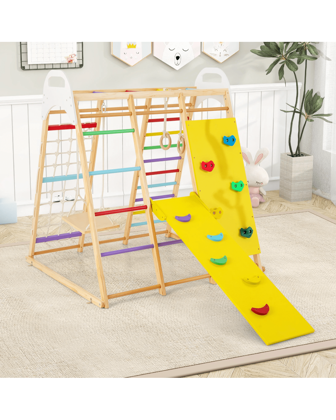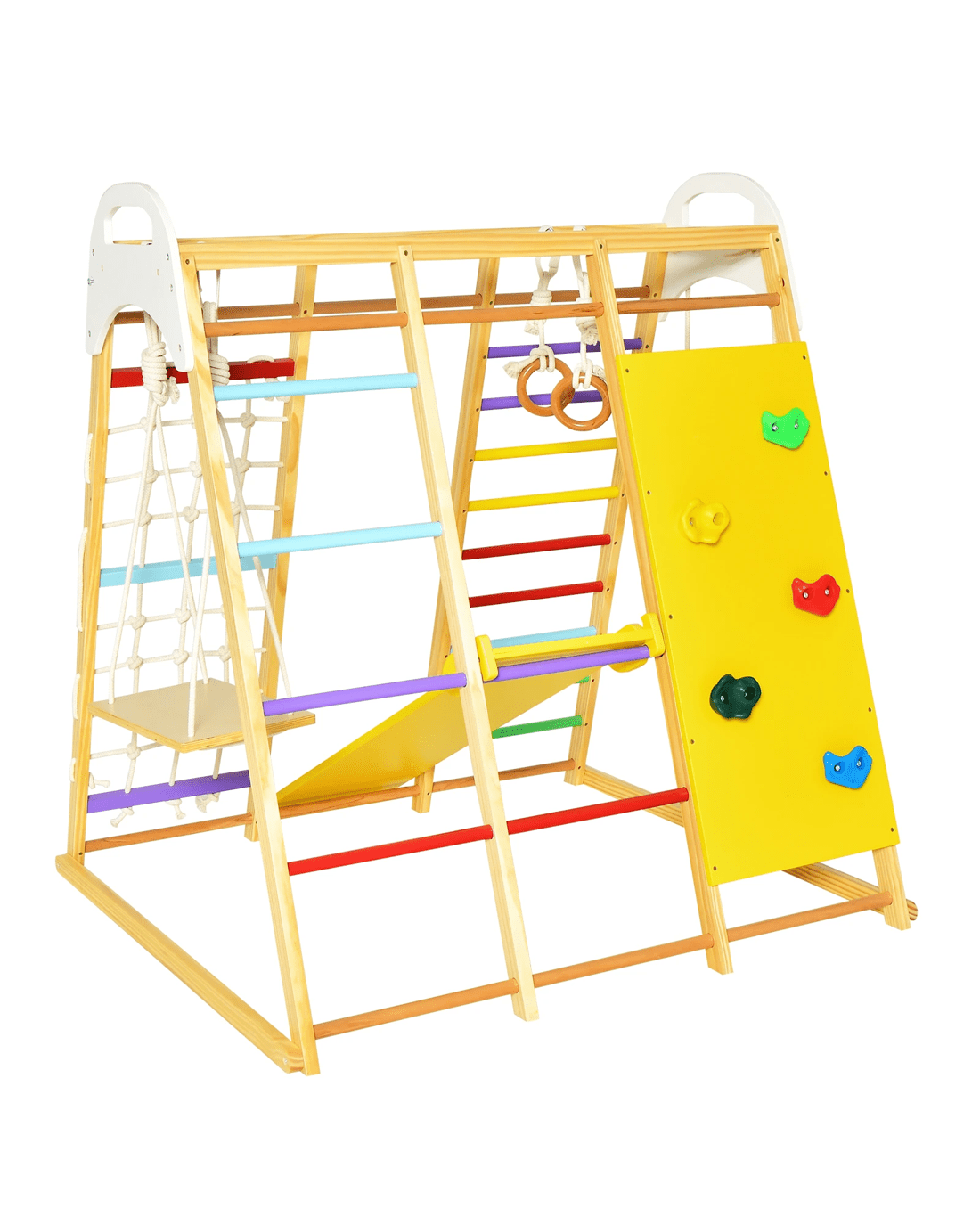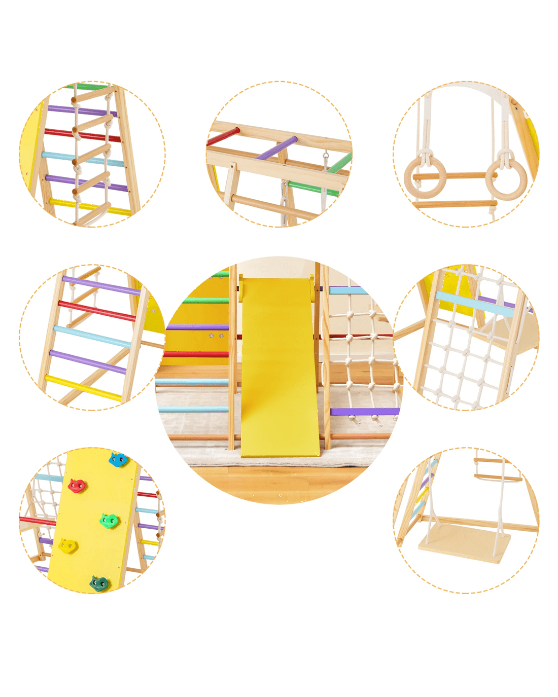 Our indoor jungle gym offers 8 game options for your little ones to play. It features monkey bars, gymnastic rings, climbing ladder, climbing net, ladders and climbing rock, helping little ones to exercise body strength during playing process. When they feel tired, they can also play on the swing or slide for resting. This play set is made of solid wood material to ensure long-term use.