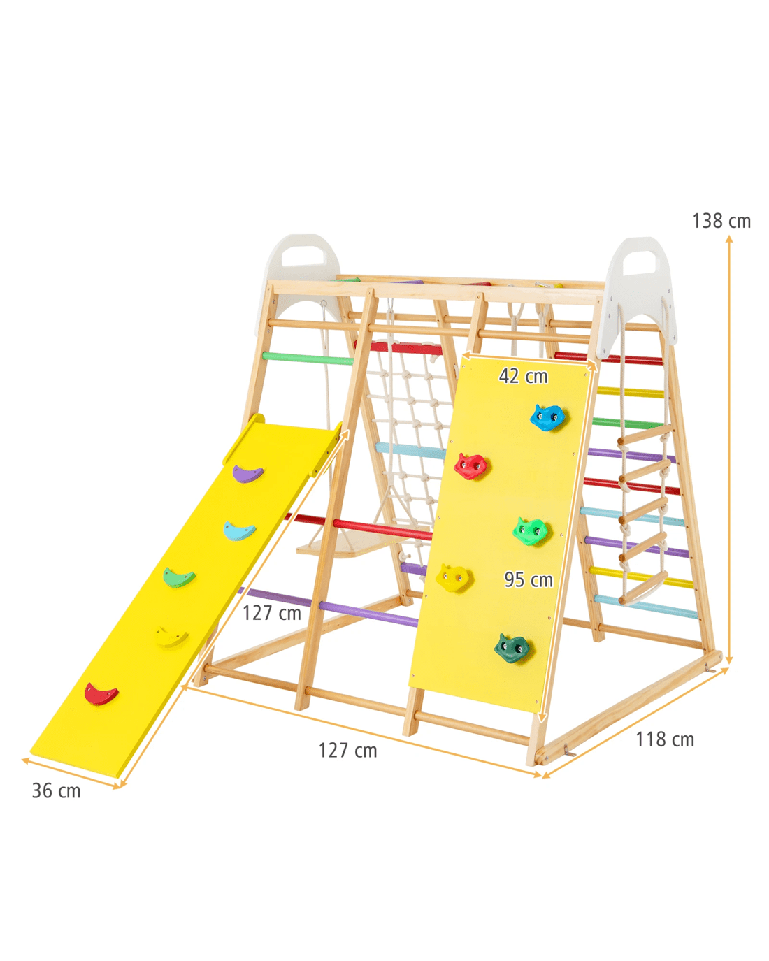 Monkey bars, gymnastic rings, climbing ladder, climbing net, climbing ladder, rope ladder, climbing rock and wooden swing for 4-5 little ones to play at the same time
