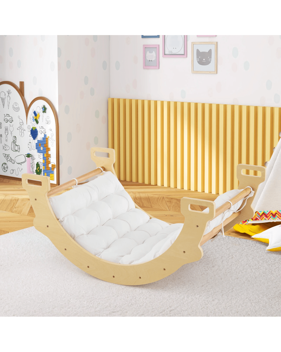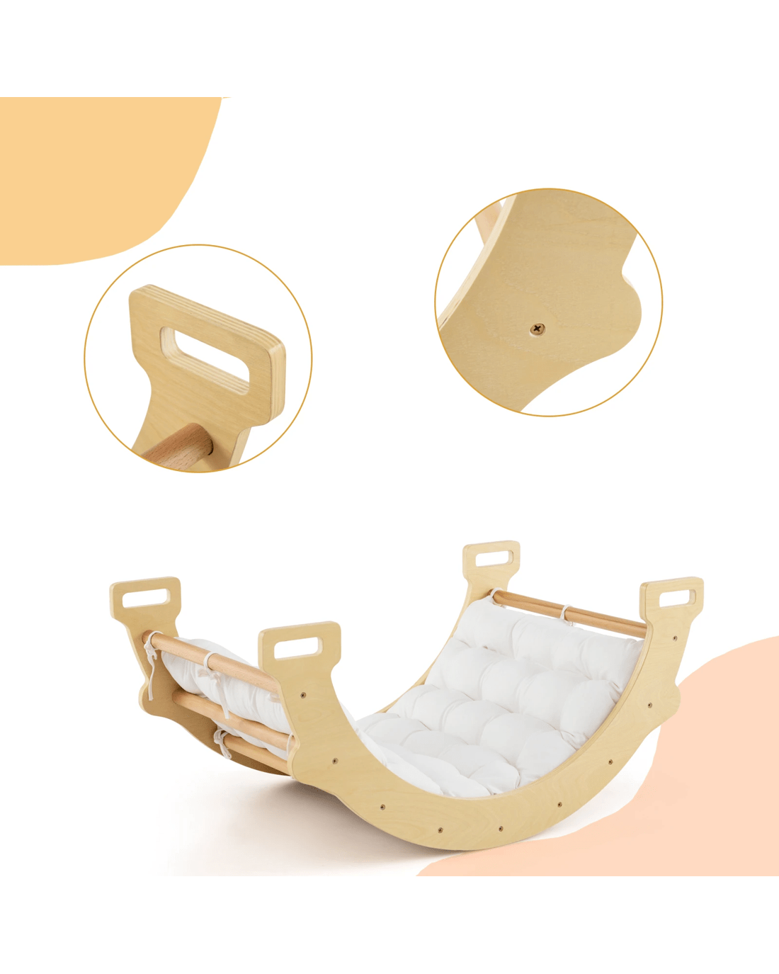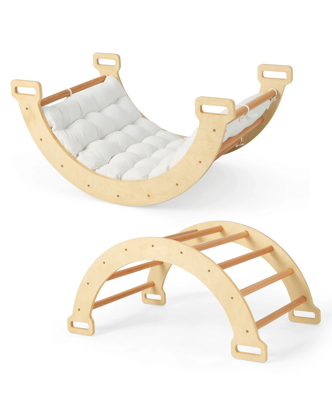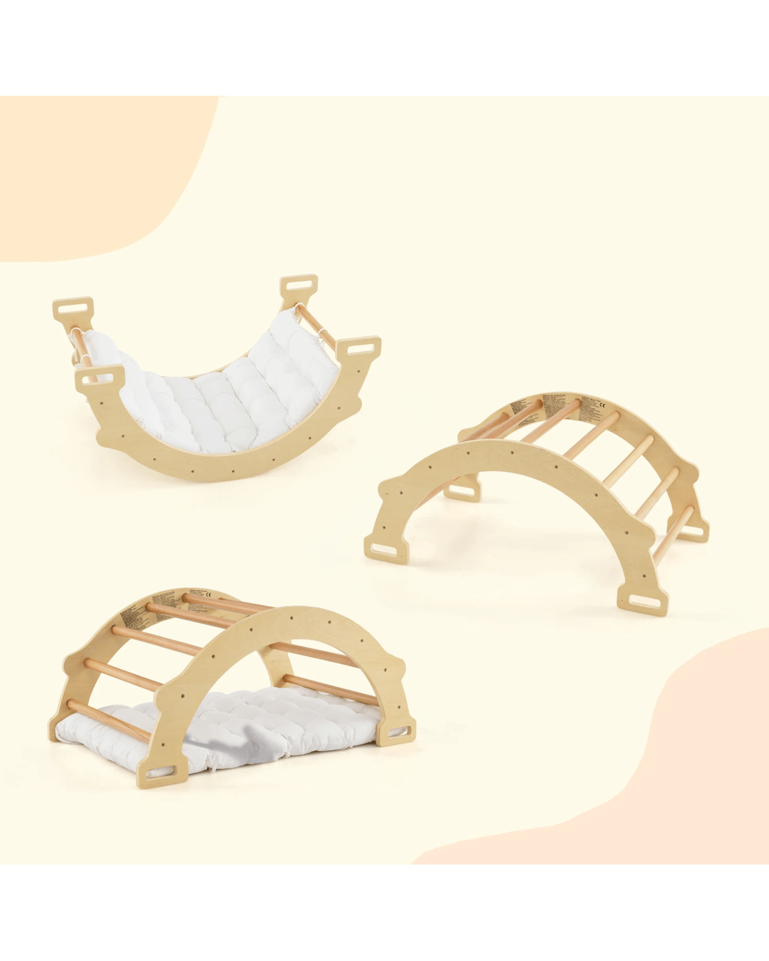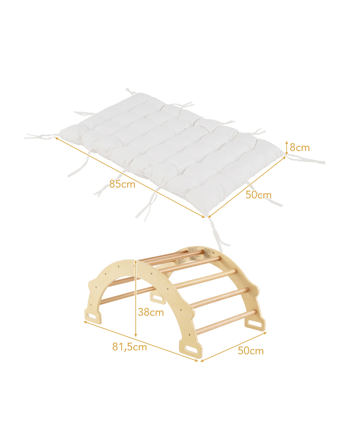 Our versatile little users climber arch rocker with cushion is designed to inspire active play. This 4-in-1 playset not only serves as a climbing ladder and crawling tunnel but effortlessly converts into a cozy rocking chair for moments of relaxation or reading. Additionally, it can be used as a toy storage option, simplifying play area organization or combined with other toys to create a comprehensive indoor playground. The cushion with secure fixing ties is filled with soft PP cotton for ultra comfort. Besides, the inclusion of an upgraded stopper and anti-tipping kits ensures stability. Foster a playful yet safe environment for your little user with this engaging, multi-functional playset.