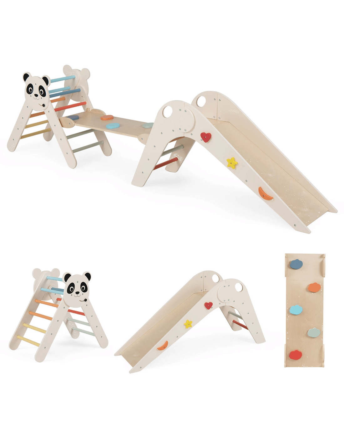 This little ones climbing triangle set offers endless play options with a versatile design including a climbing triangle, triangle slide doubling as a tunnel, and a balance bridge convertible into a ramp. Crafted from sturdy solid beech wood with smooth edges and secure handrails, it ensures safe and enduring play. The folding climbing triangle makes it easy to store and allows you to arrange freely for endless fun. This playset is perfect for bedrooms, playrooms, or living areas. Featuring swivel cartoon blocks and a charming panda theme, it inspires creativity and boosts imagination. Designed with well-made details, this Montessori climbing set can boost imagination, encourage physical and sensory development while providing limitless fun.