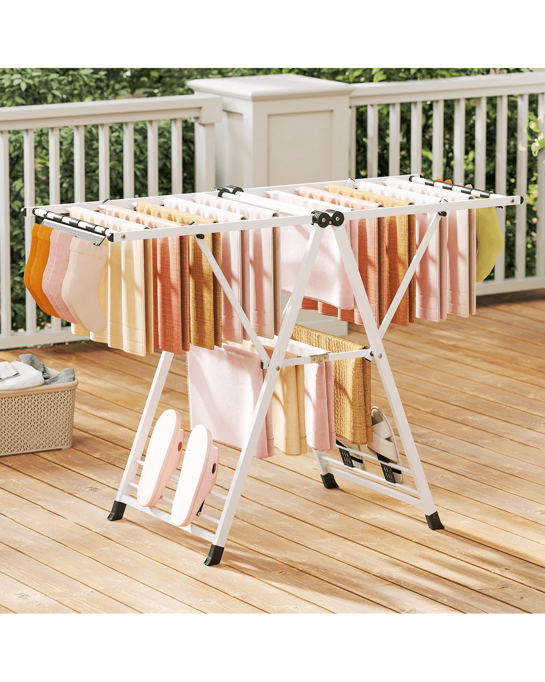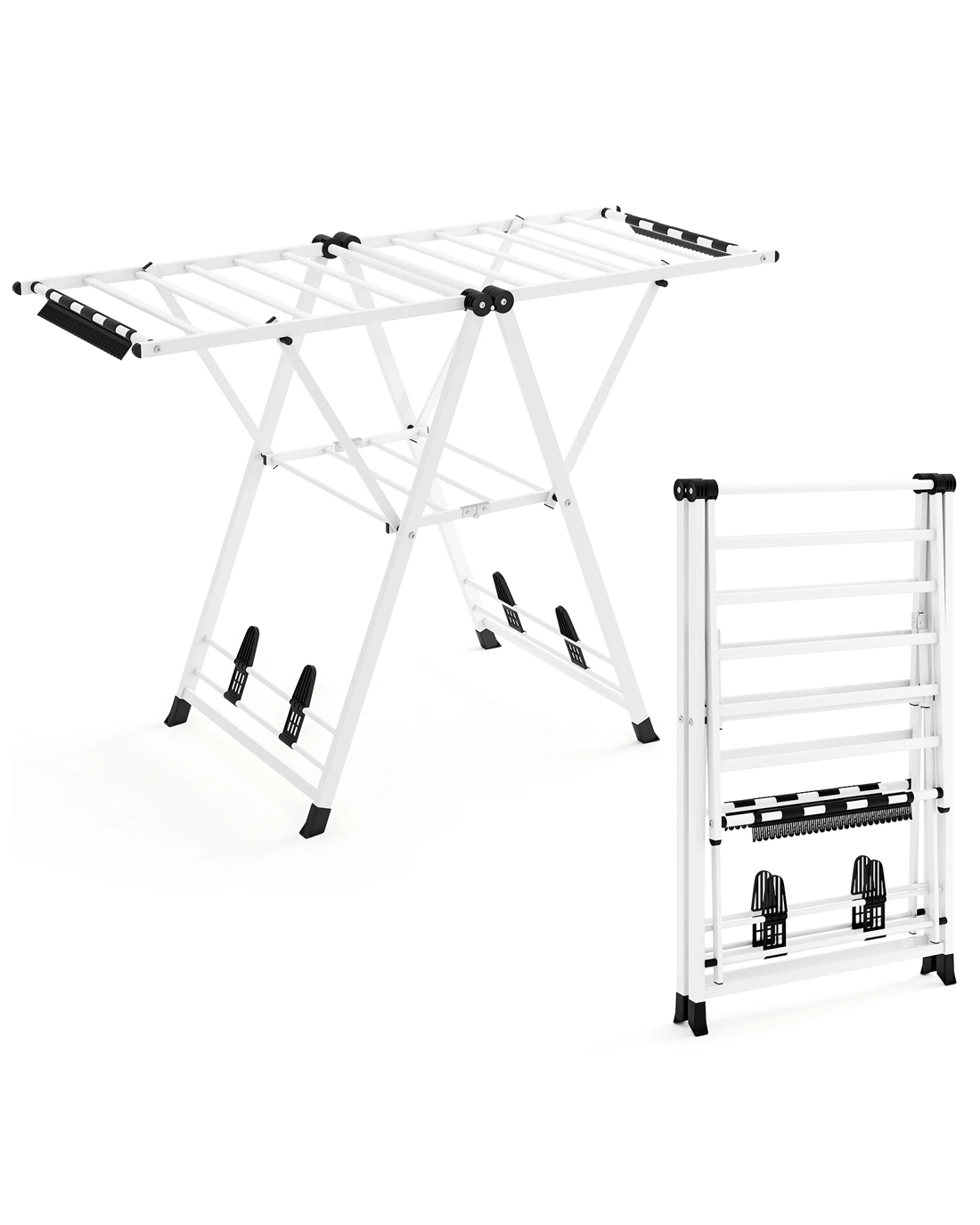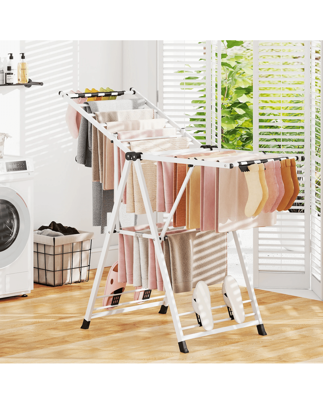 Featuring 16 drying rails, 28 sock clips, and 4 shoe racks, this freestanding gullwing clothing stand offers generous drying space. Moreover, tailor your drying needs with height-adjustable wings. With its reasonable spacing between rails, the clothes rack ensures thorough airflow and quicker drying times. Built with a robust frame and A-shaped structure, this laundry drying rack ensures superior stability and long-lasting use. The foldable design makes it easy to store away when not in use, conserving precious space in your home.