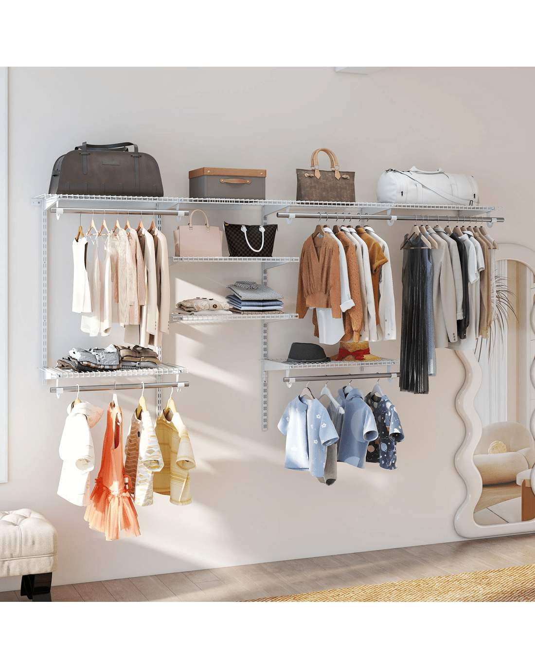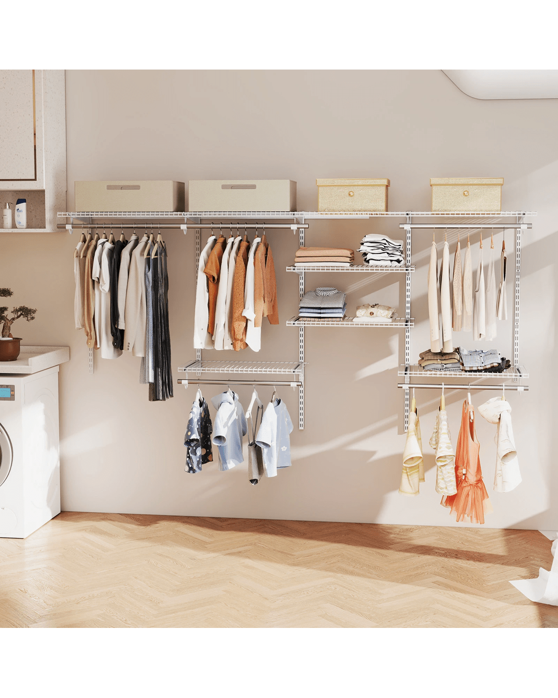 It adapts in size with horizontally expandable rods and vertically adjustable shelves, and it is designed to cater to an array of storage needs. Constructed from quality stainless steel and spray metal, the wardrobe closet kit resists wear and tear, ensuring longevity and consistent performance. What's more, it mounts to your wall, saving valuable floor space while adding elegance to you home. The closet organizer is suitable for cloakroom, bedroom, etc to turn your wardrobe management into a seamless and enjoyable task.